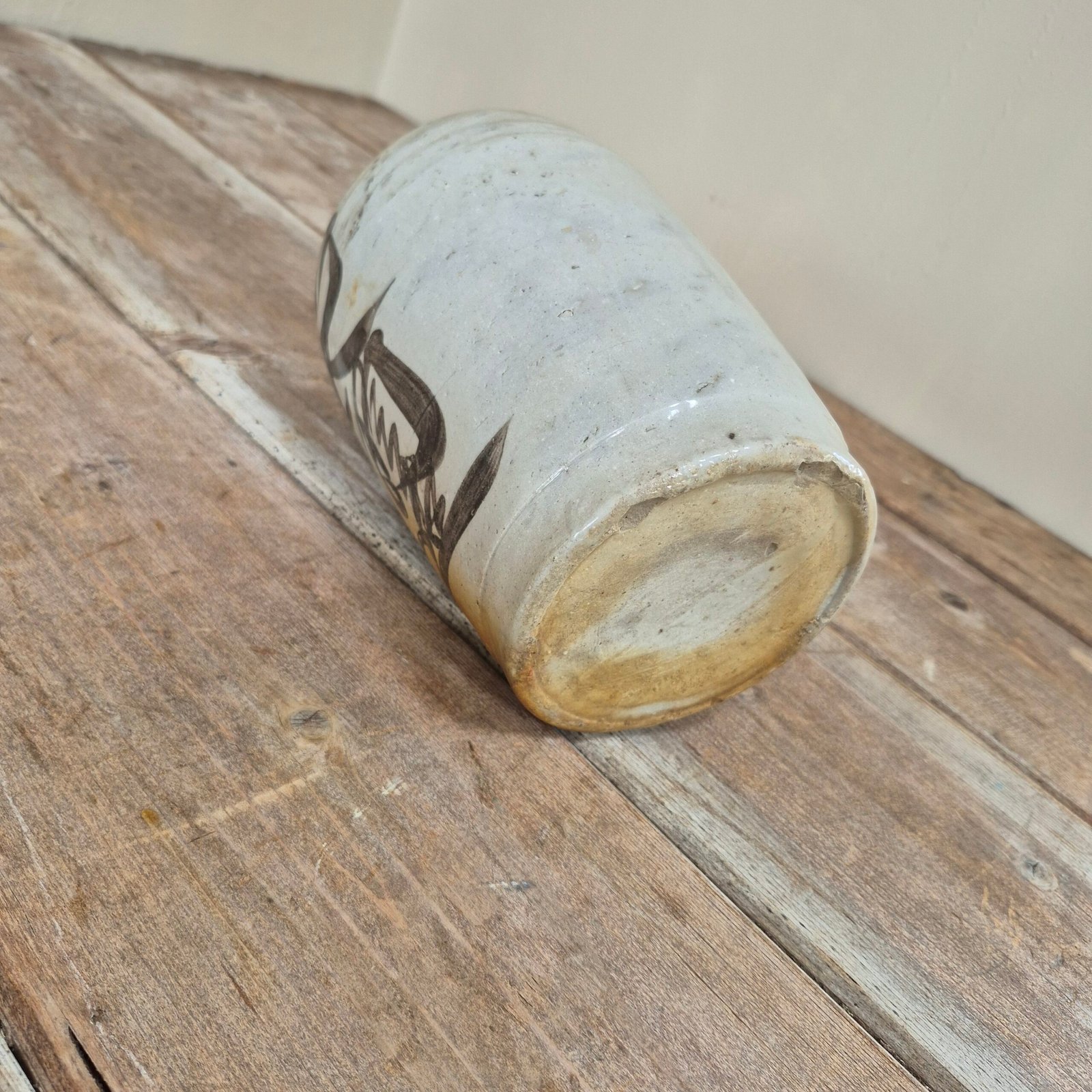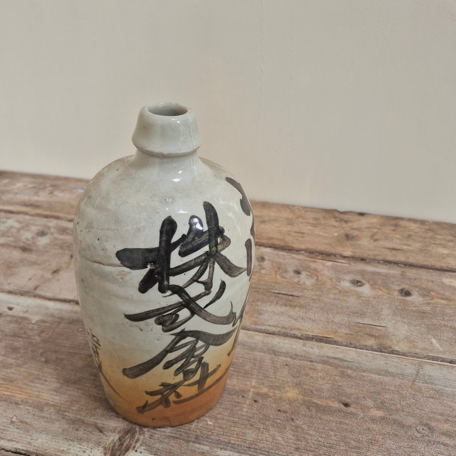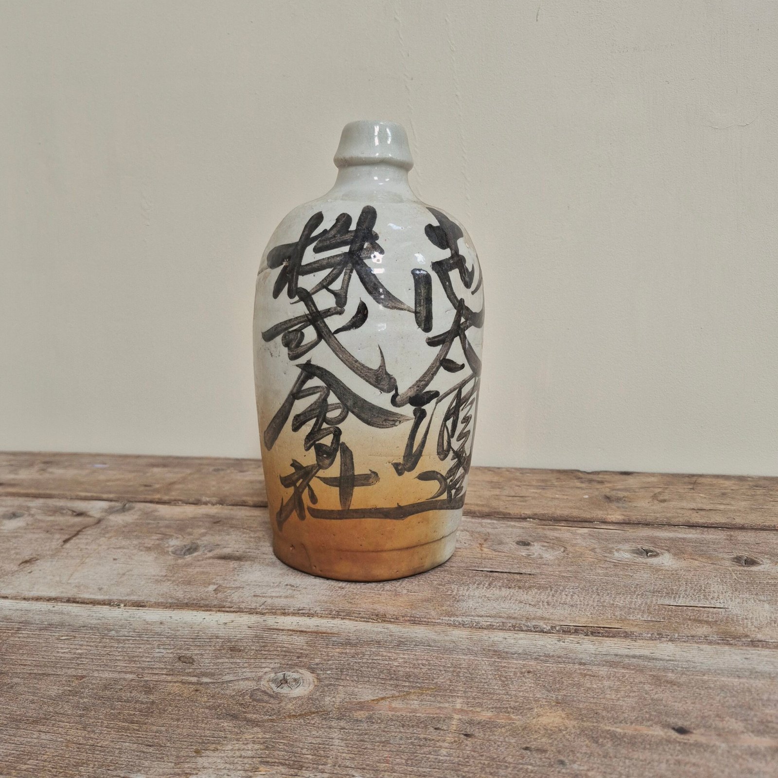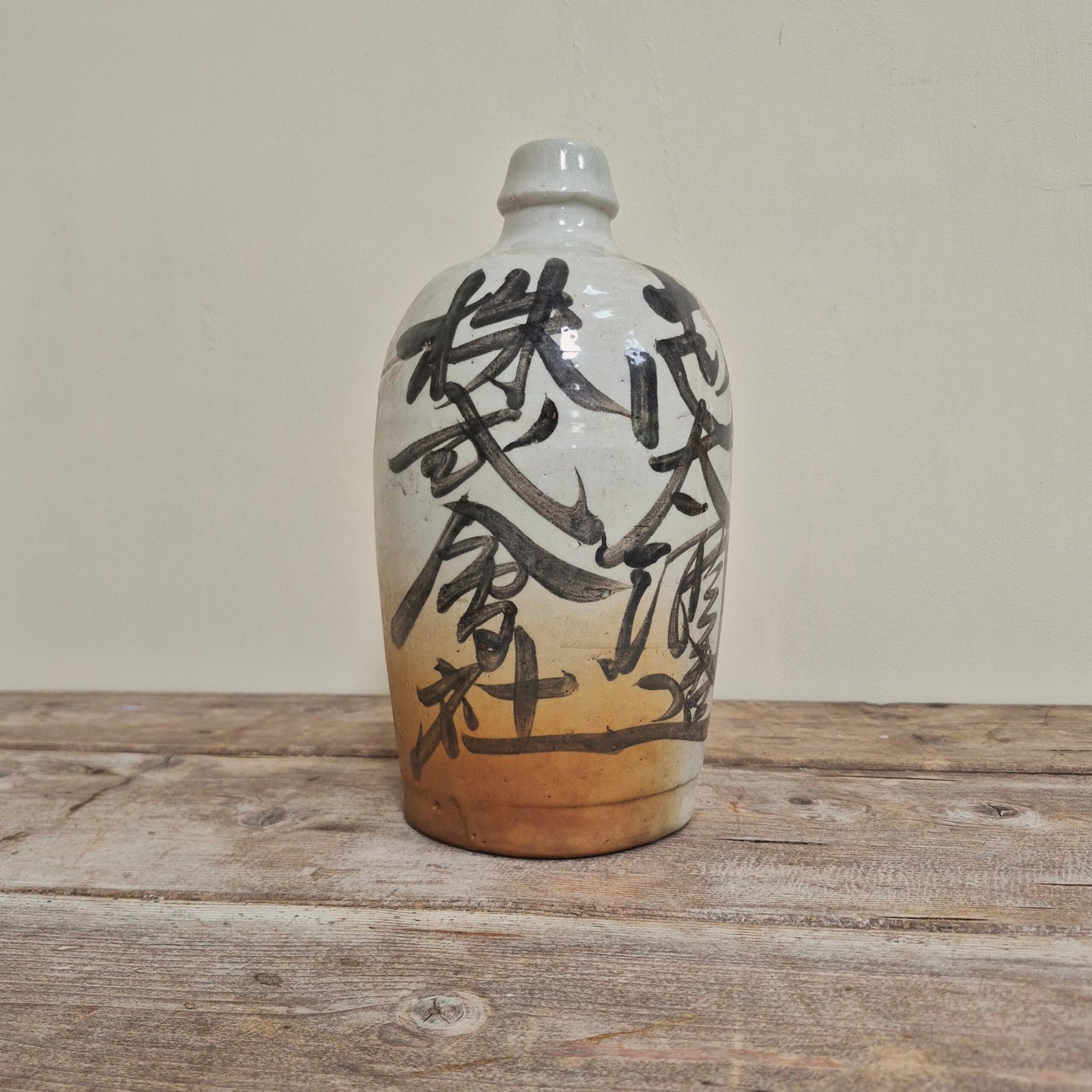 The form is simple and traditional, allowing the bold brushwork to take centre stage. The glaze transitions from a soft pale tone to a warm, earthy base, adding depth and texture to the piece.