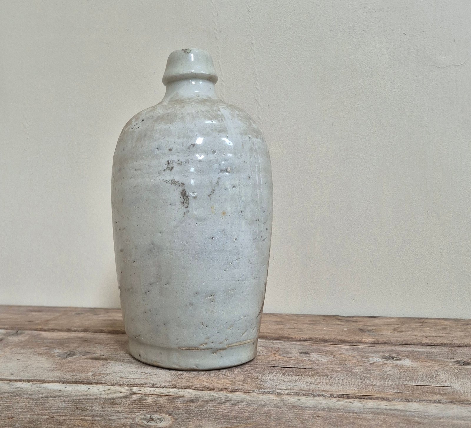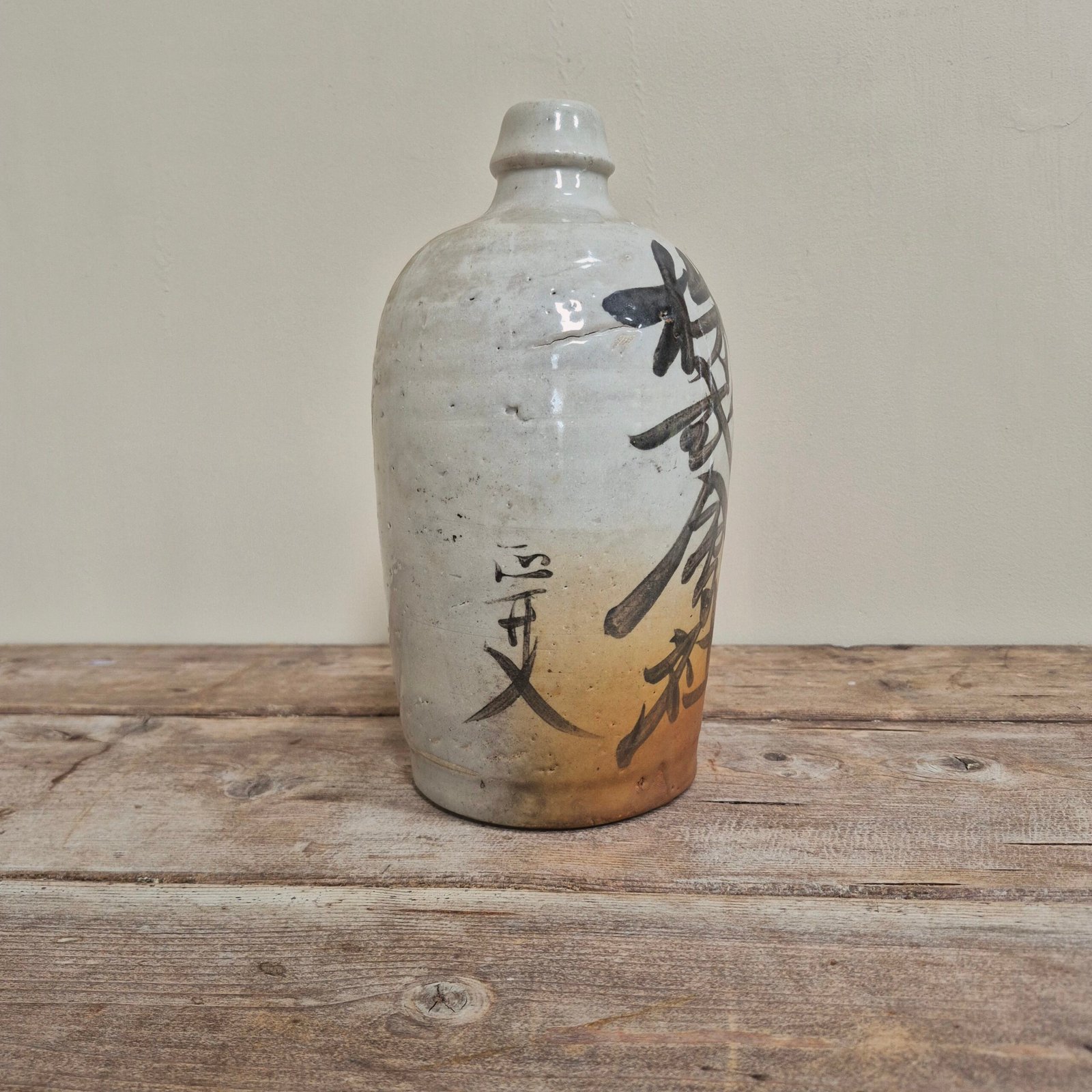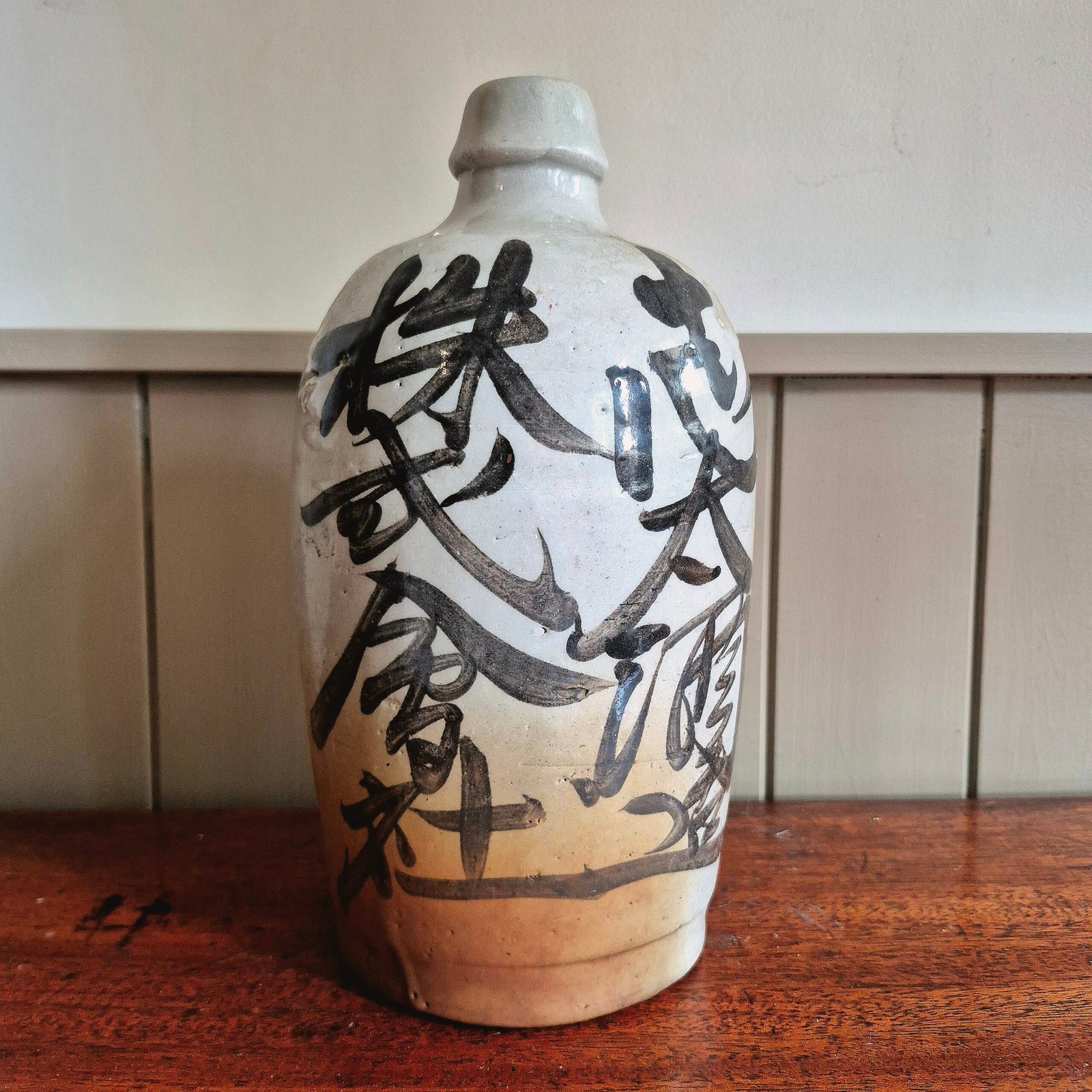 A characterful 19th century Japanese sake bottle (tokkuri), featuring expressive hand-painted calligraphy in iron oxide tones.