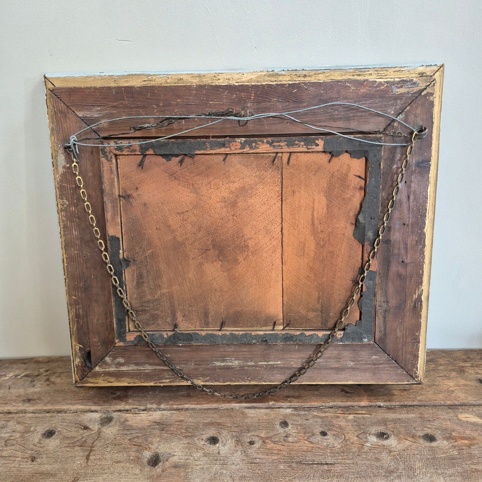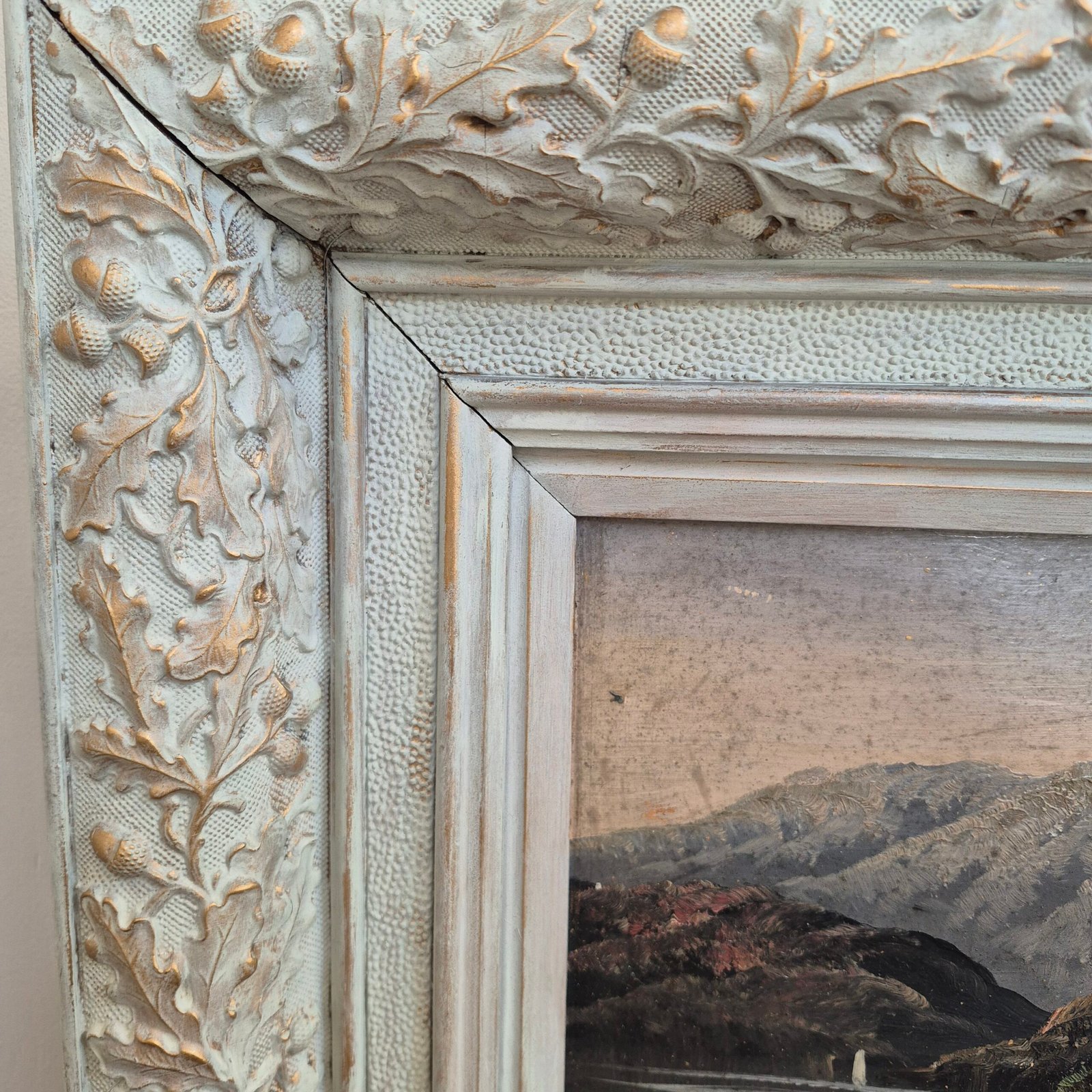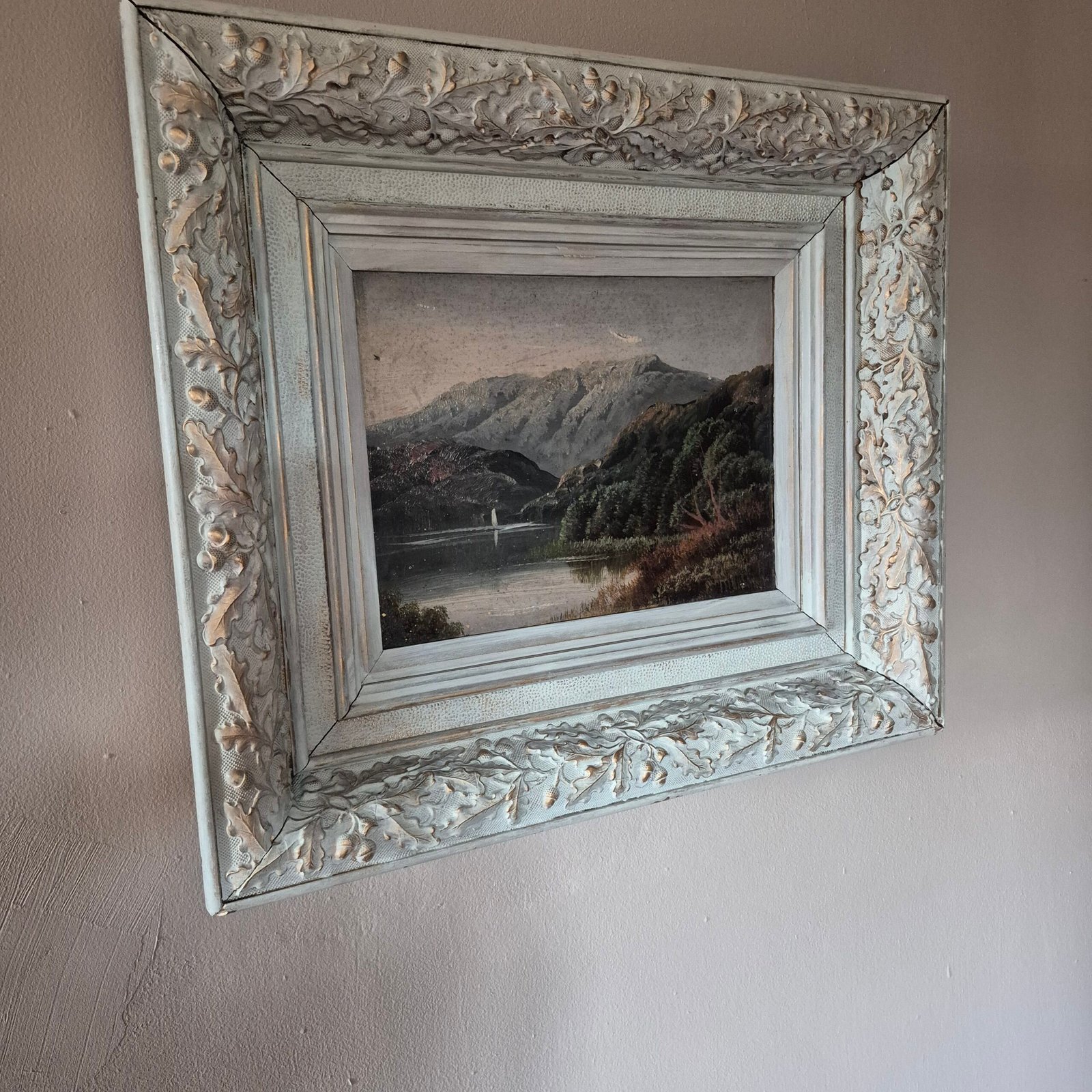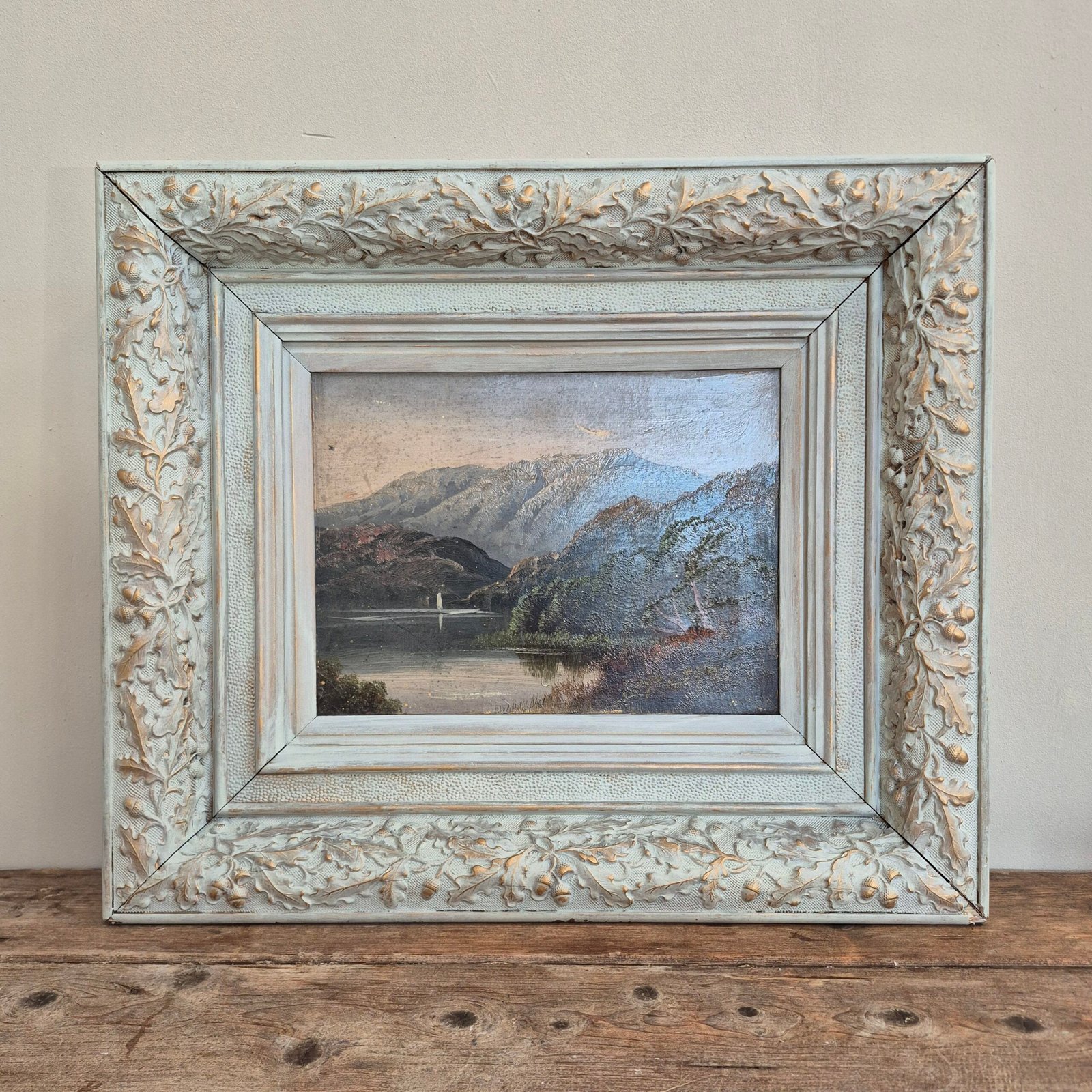 A decorative late 19th century oil on canvas landscape depicting calm waters and distant mountains, painted in soft earthy tones of blue, green and muted pink. The painting is housed in an ornate Victorian gilt frame with oak leaf and acorn detailing, adding warmth and character. A timeless piece that sits comfortably in both period and contemporary interiors.