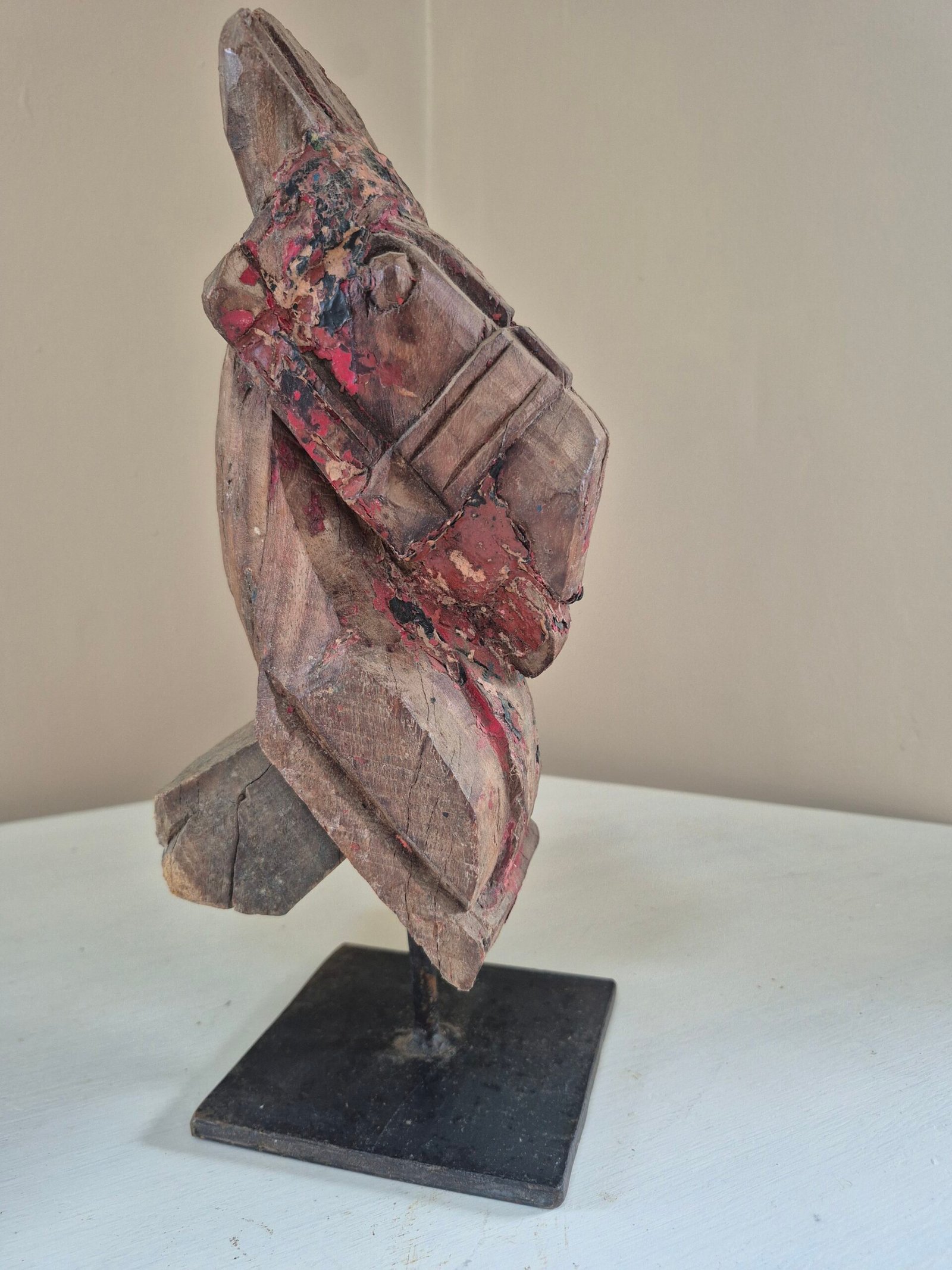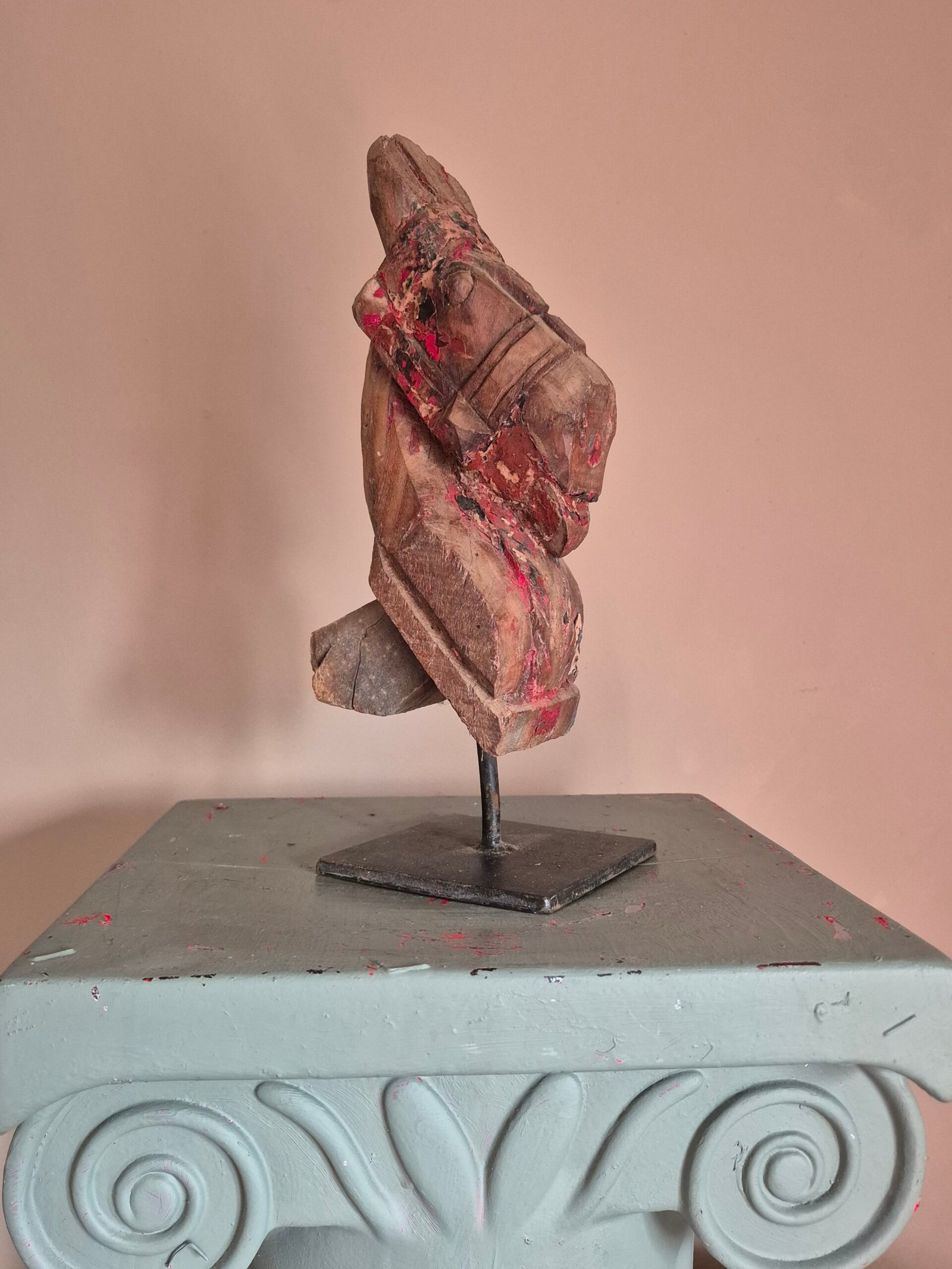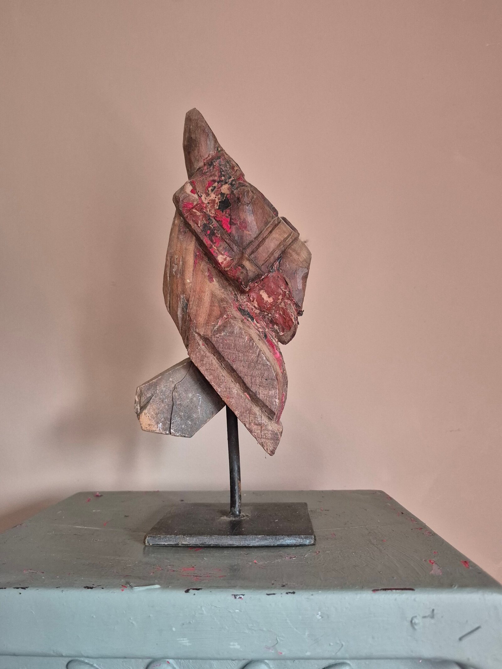 Antique Indian carved teak horse head corbel, now mounted on an iron stand. Originally part of architectural carving, it still carries traces of old red paint and the worn tool marks of its making. The weathering, losses and surface wear all sit well on a piece of this age and give it a striking, time softened presence. A bold decorative object with real personality.