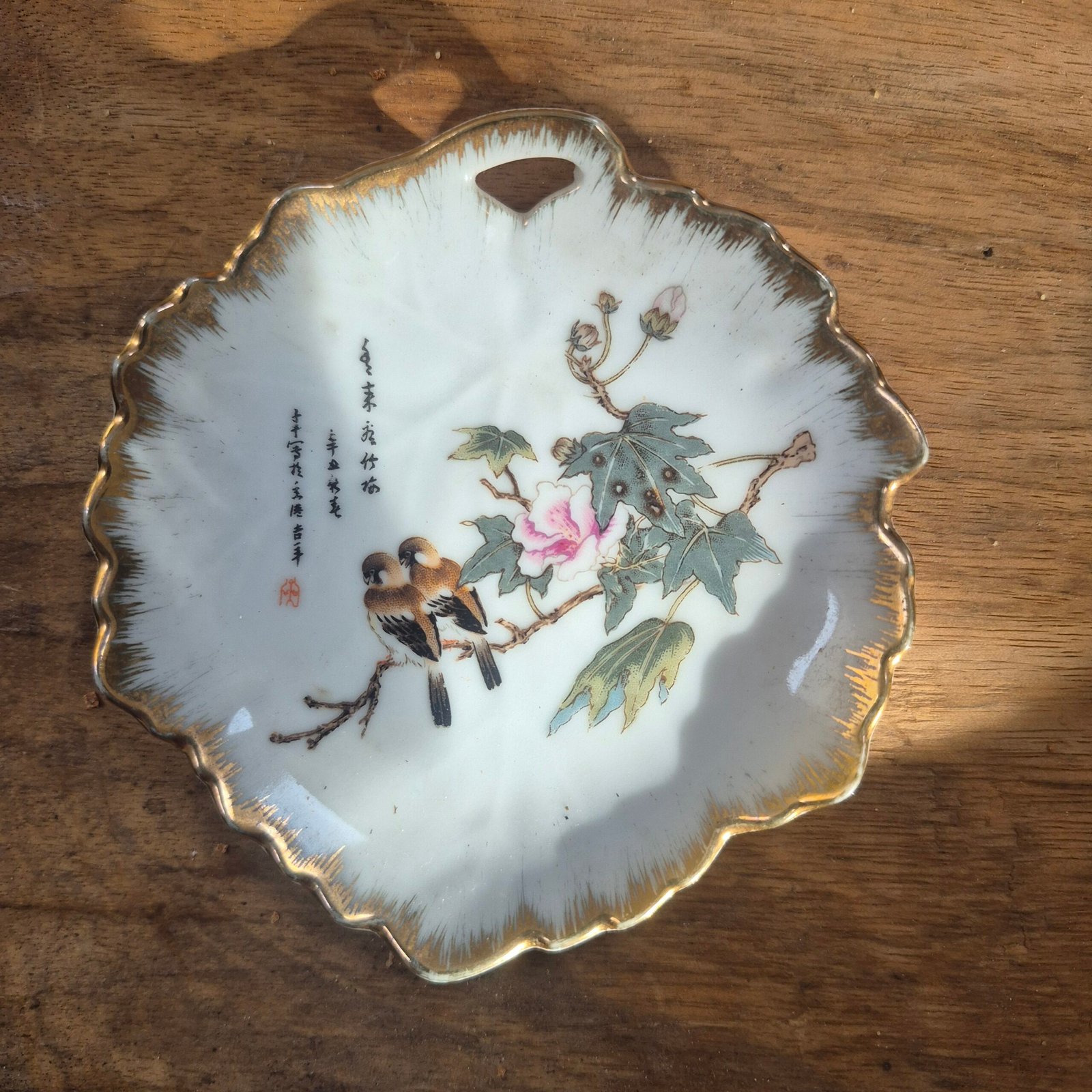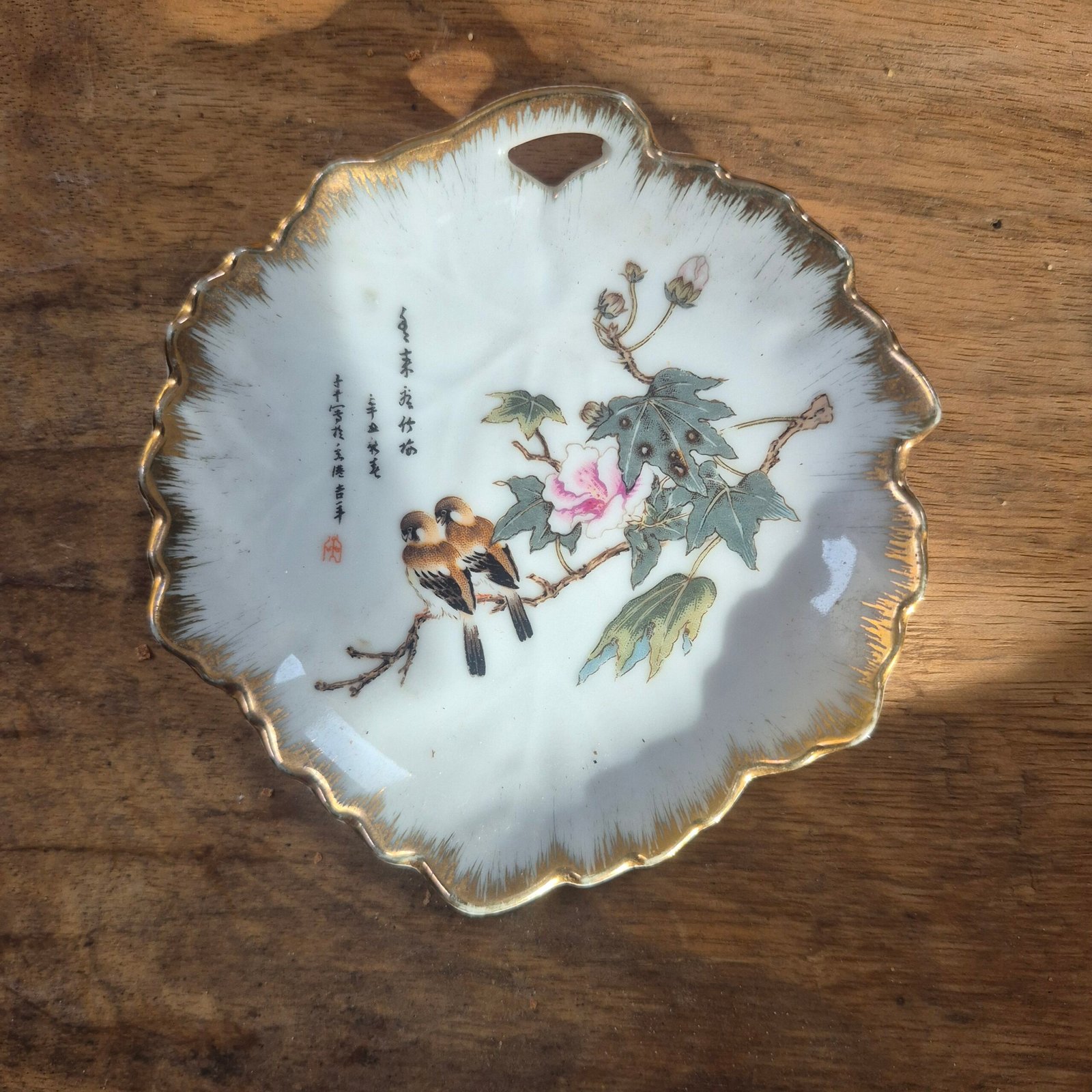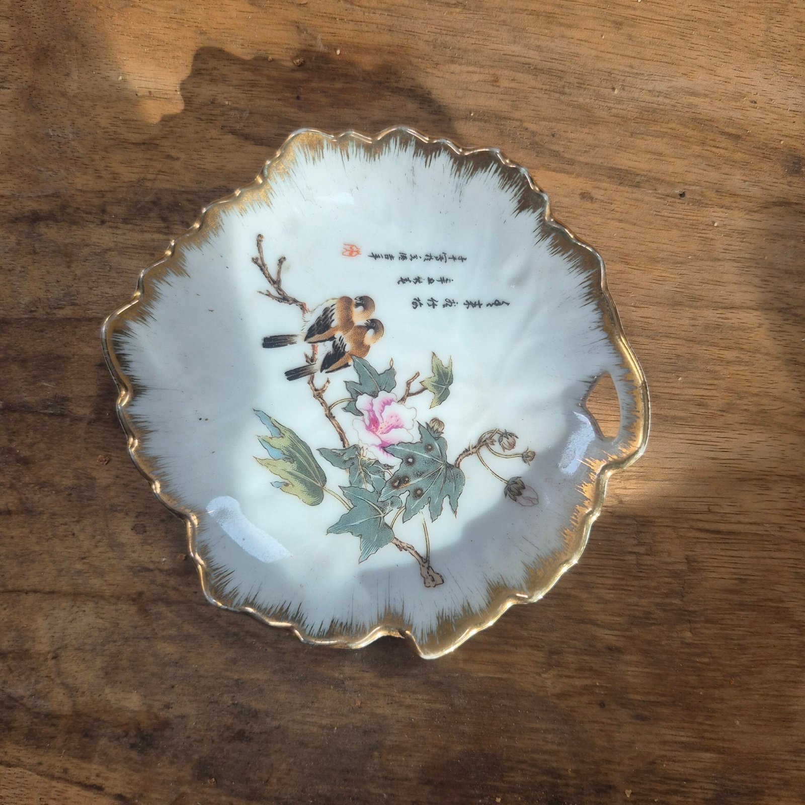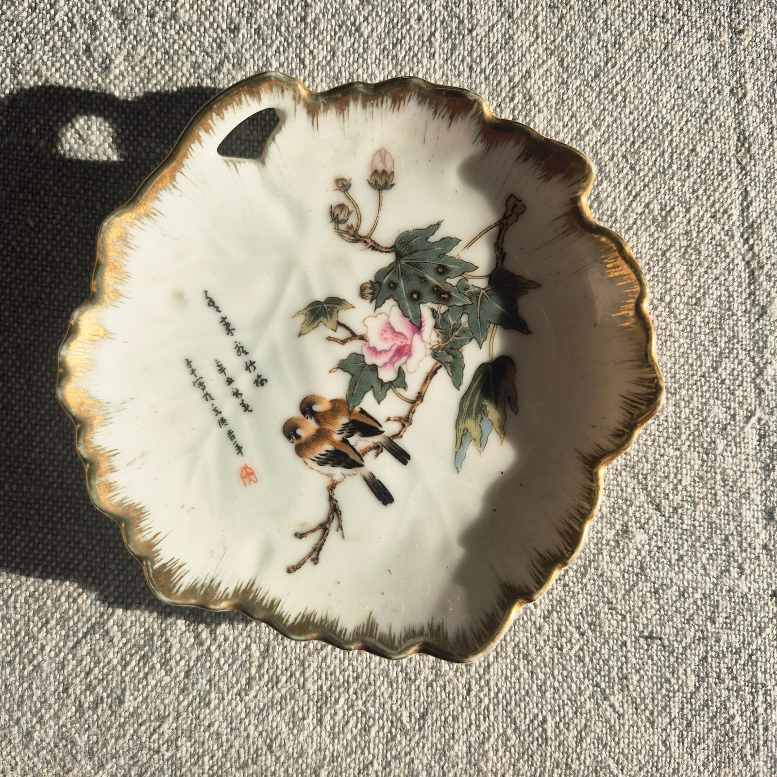 A delicate antique Japanese porcelain dish featuring two birds perched on a flowering branch, accented with hand painted detailing and calligraphic script.