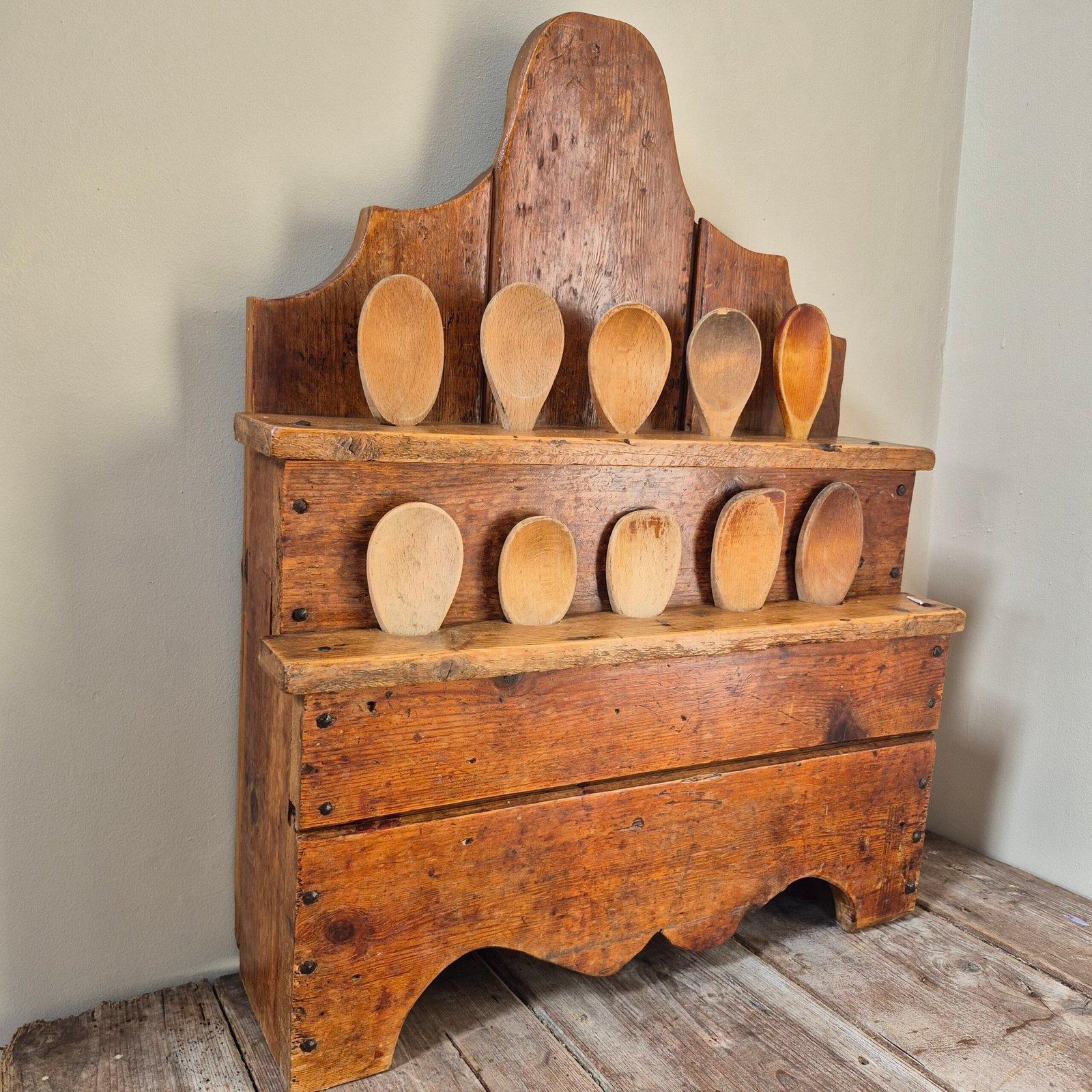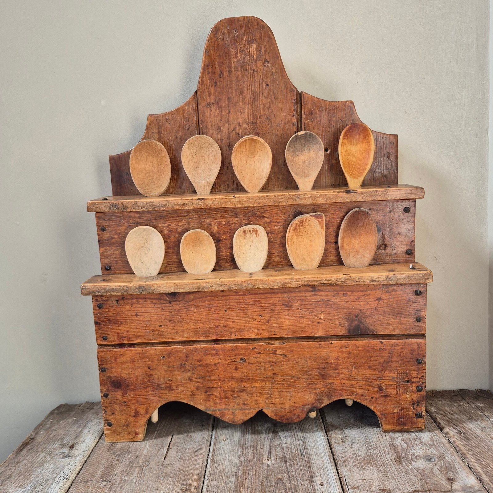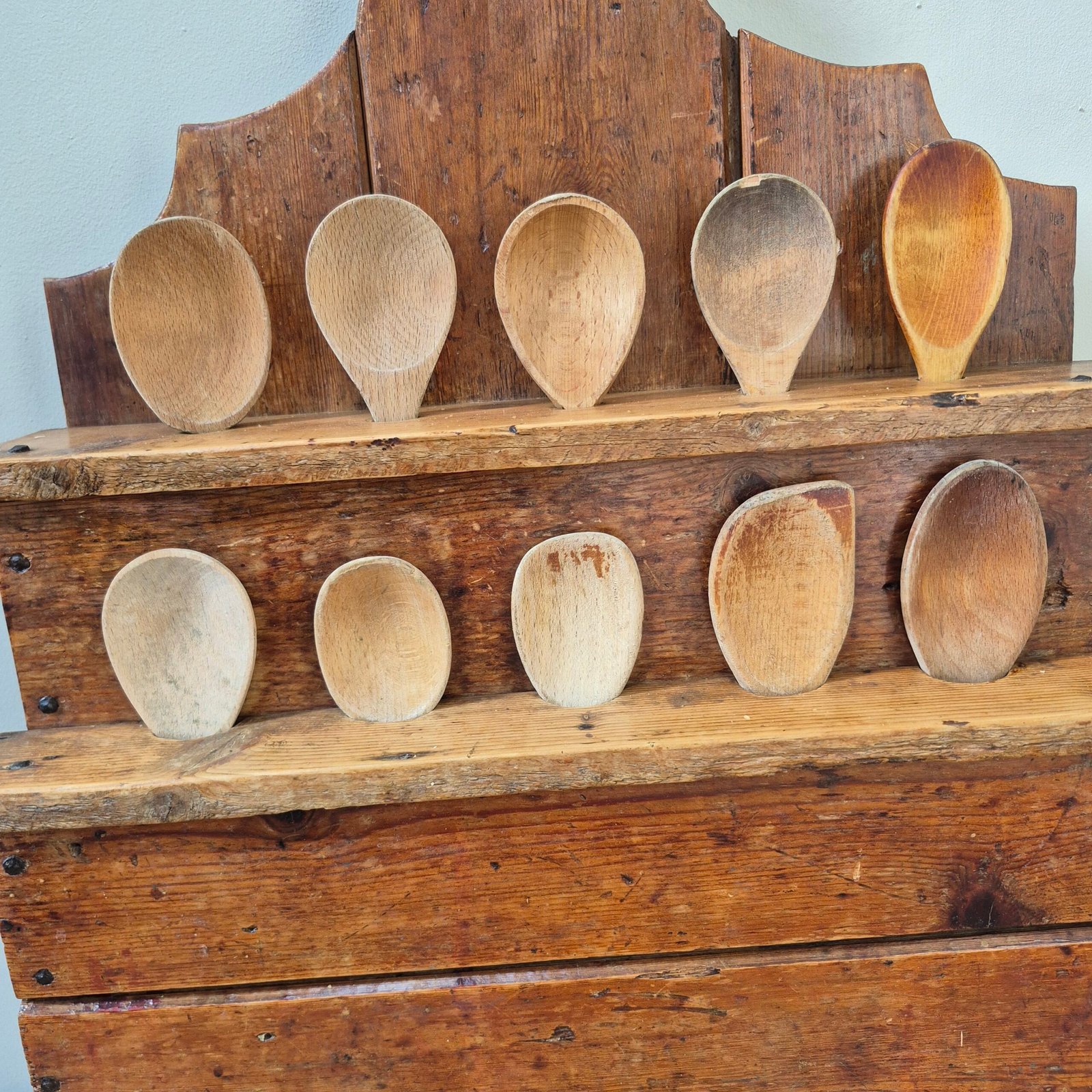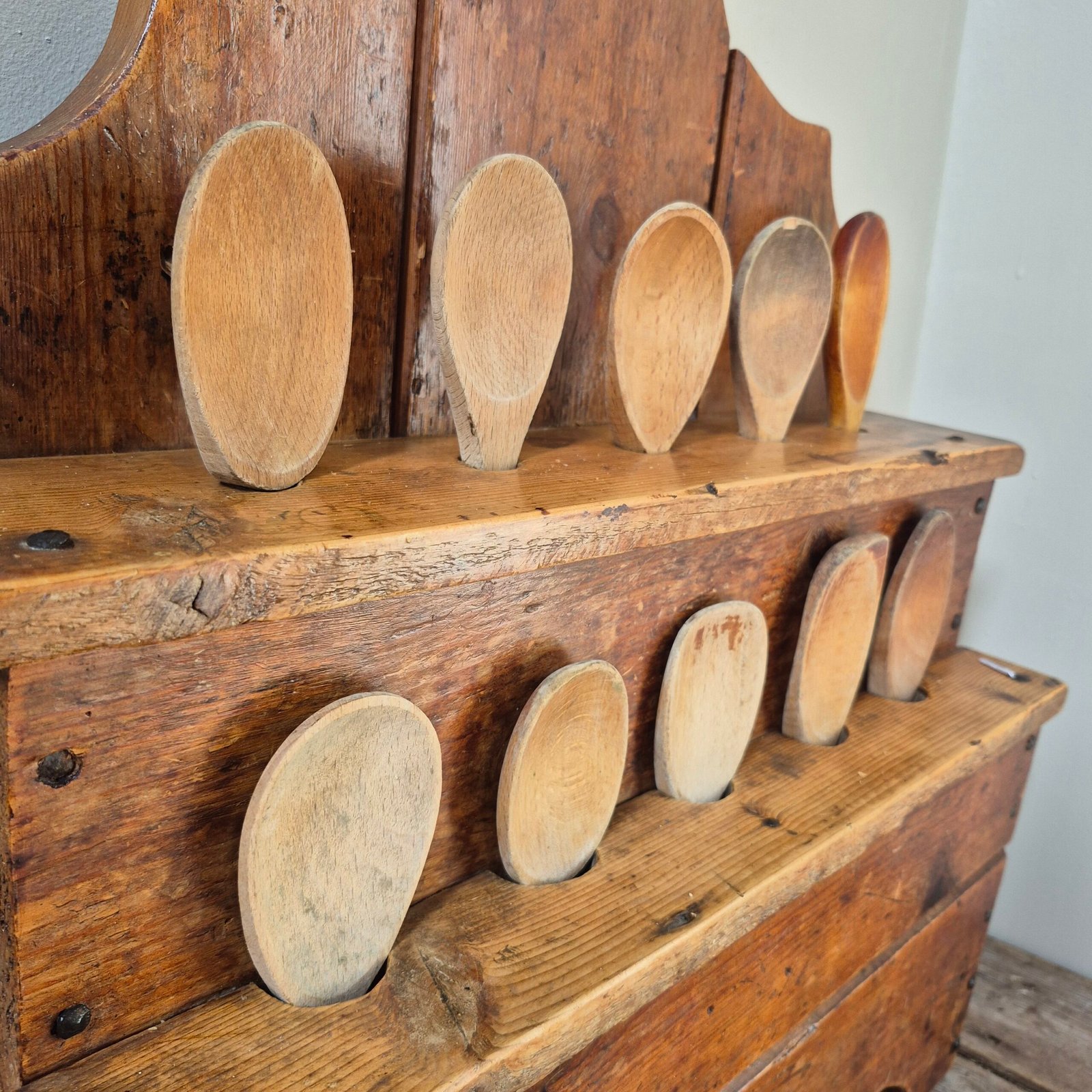 A beautifully aged antique Welsh spoon rack, traditionally used in farmhouse kitchens for displaying hand-carved wooden spoons. Pieces like this were both practical and proudly displayed, often forming the heart of a working kitchen.
