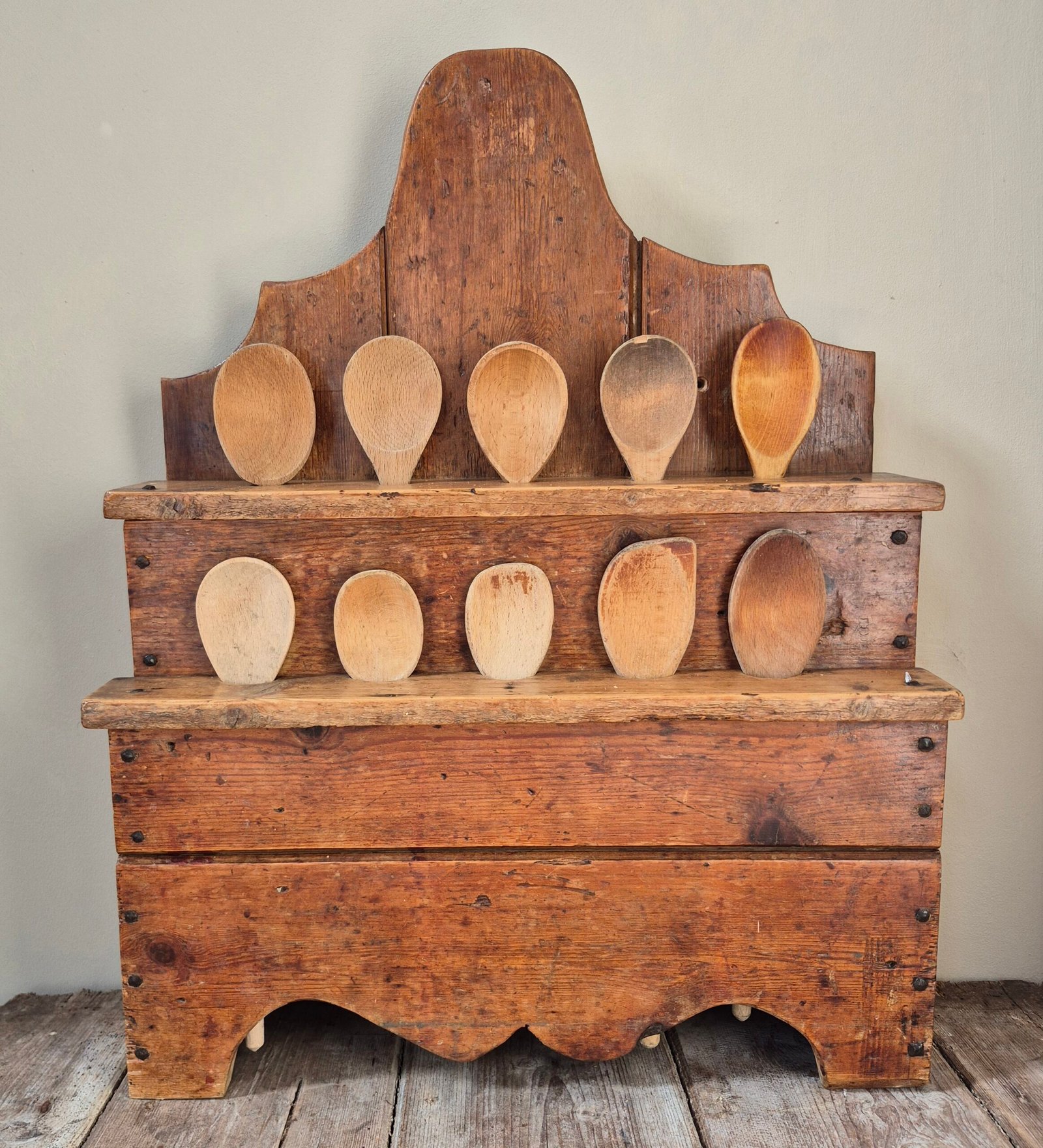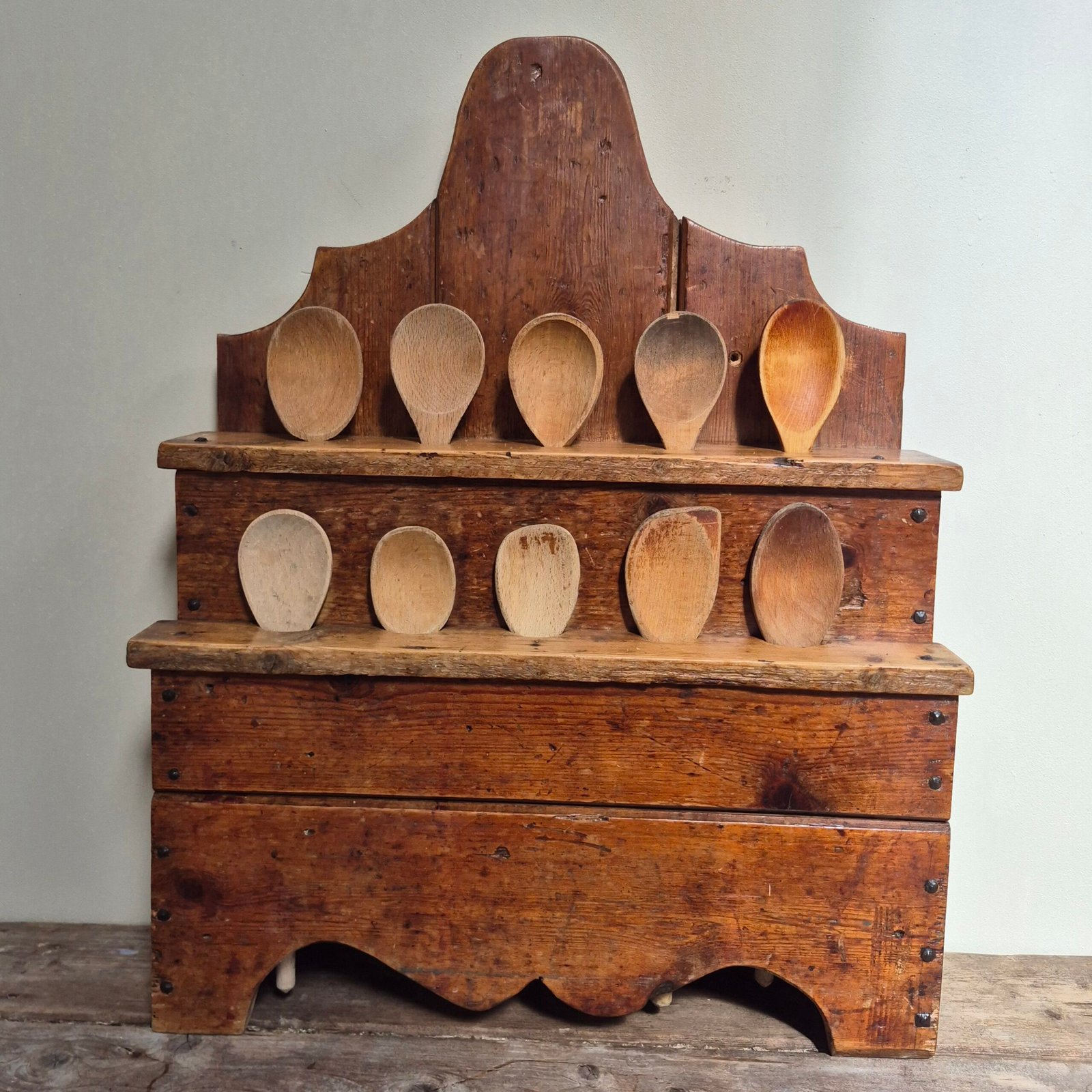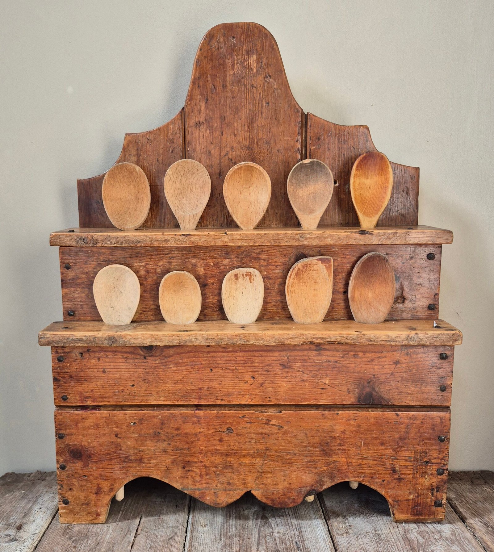 A beautifully aged antique Welsh spoon rack, traditionally used in farmhouse kitchens for displaying hand-carved wooden spoons. Pieces like this were both practical and proudly displayed, often forming the heart of a working kitchen.