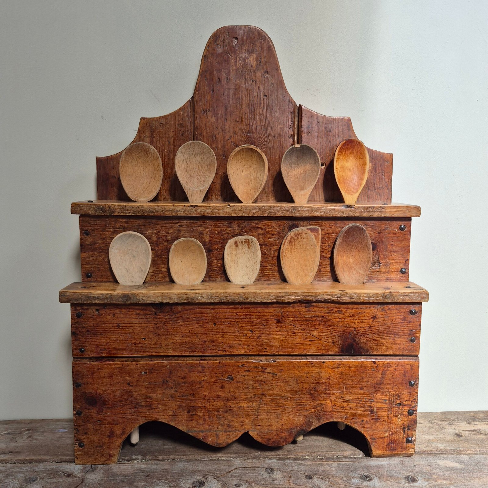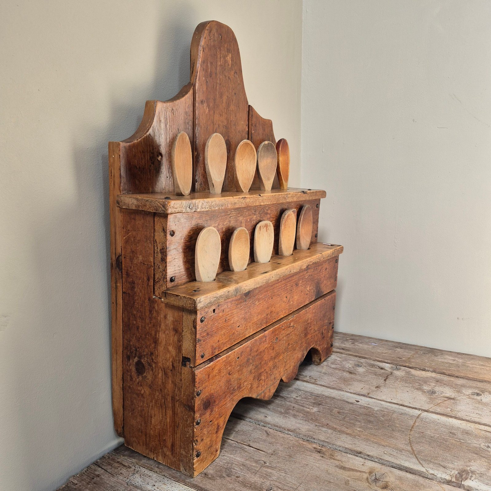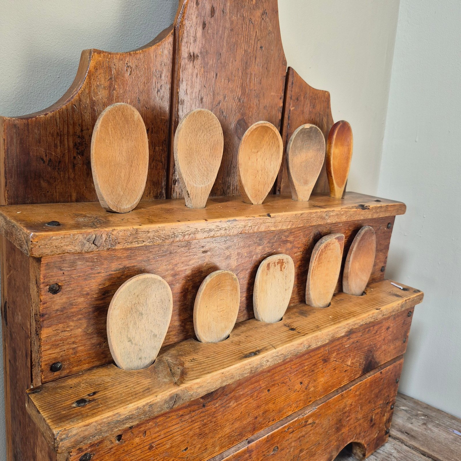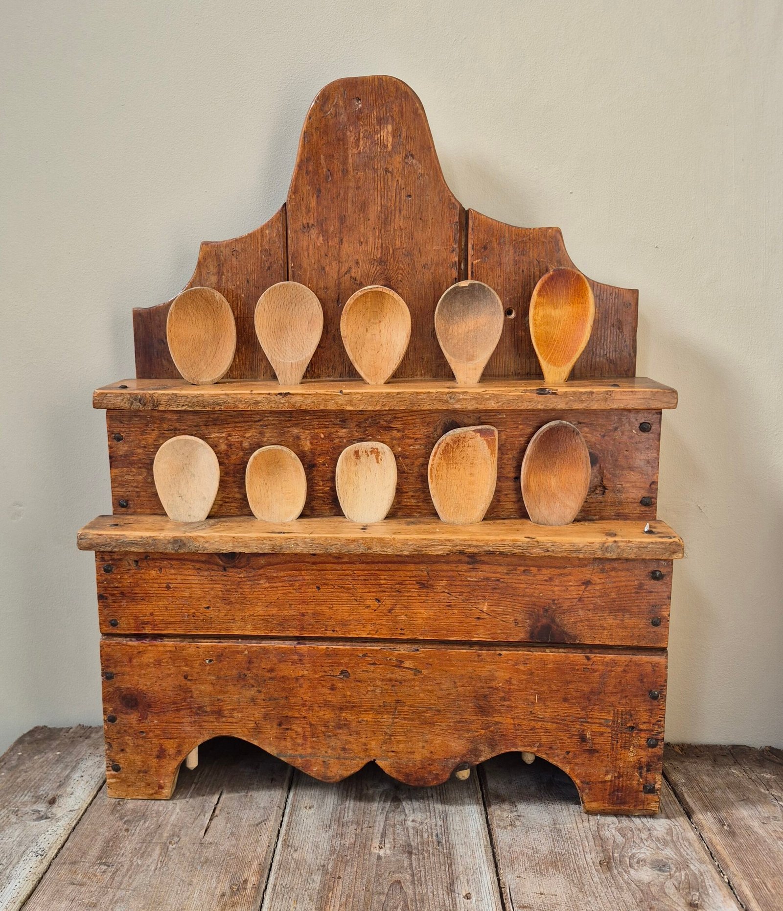 A beautifully aged antique Welsh spoon rack, traditionally used in farmhouse kitchens for displaying hand-carved wooden spoons. Pieces like this were both practical and proudly displayed, often forming the heart of a working kitchen.