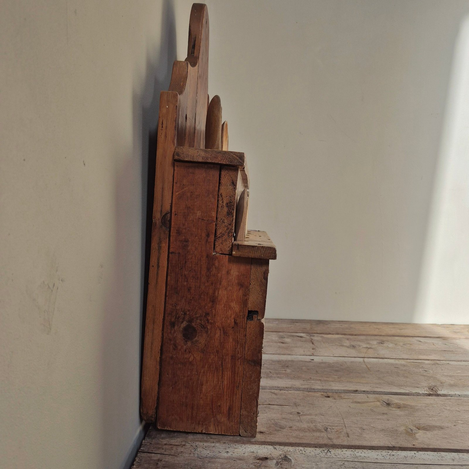 This example has a stepped, hand-built form with simple cut detailing and visible old nailwork. The wood has developed a deep, warm patina over time, with wear and variation that add real character and authenticity.