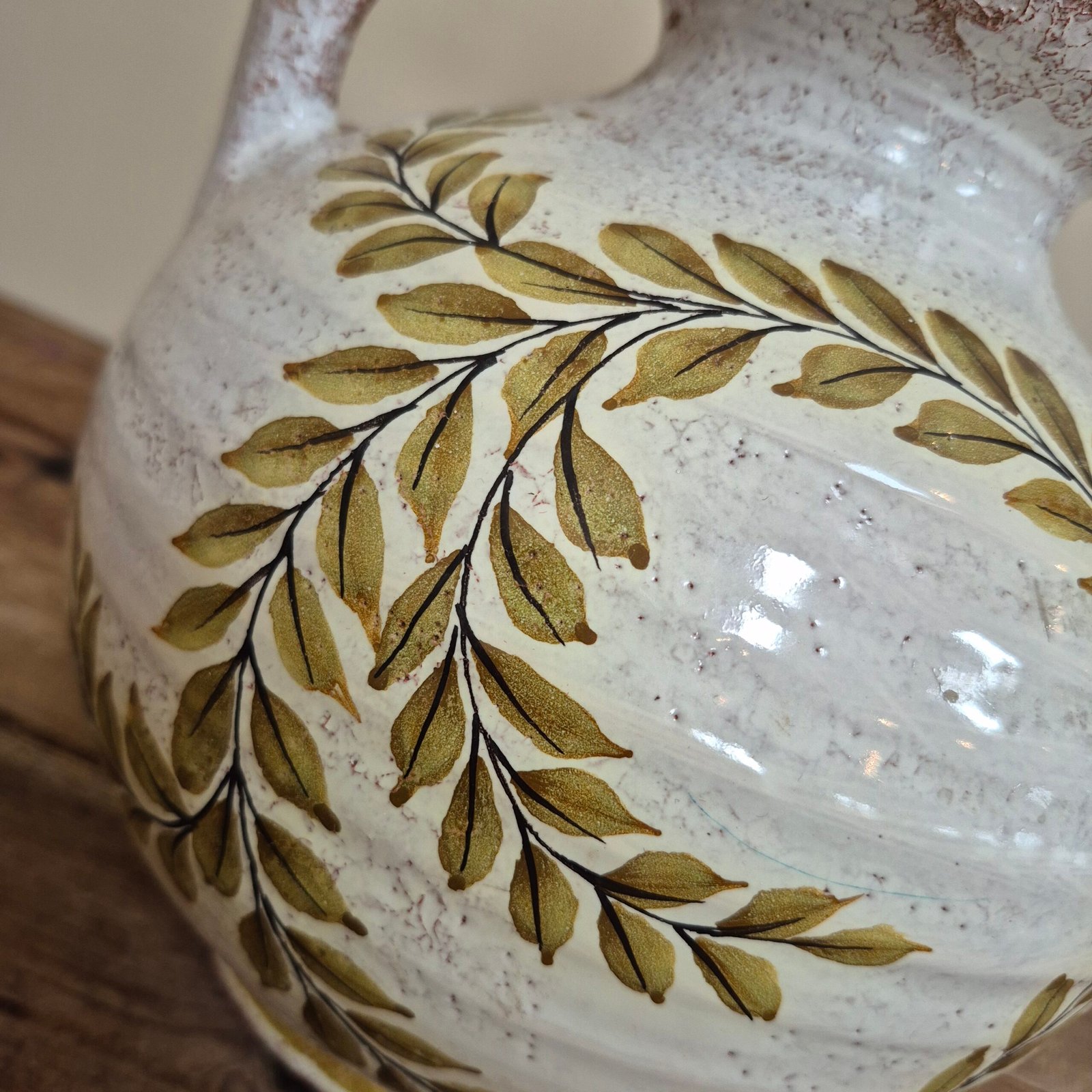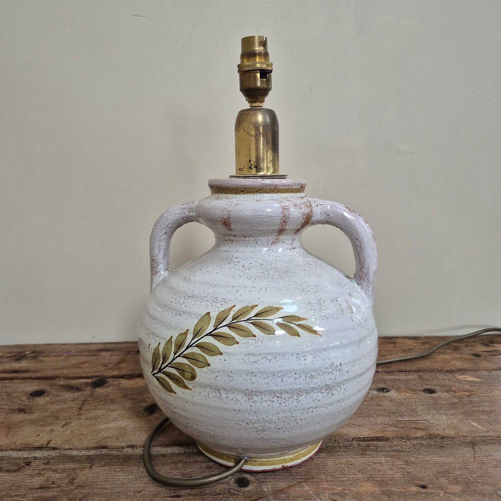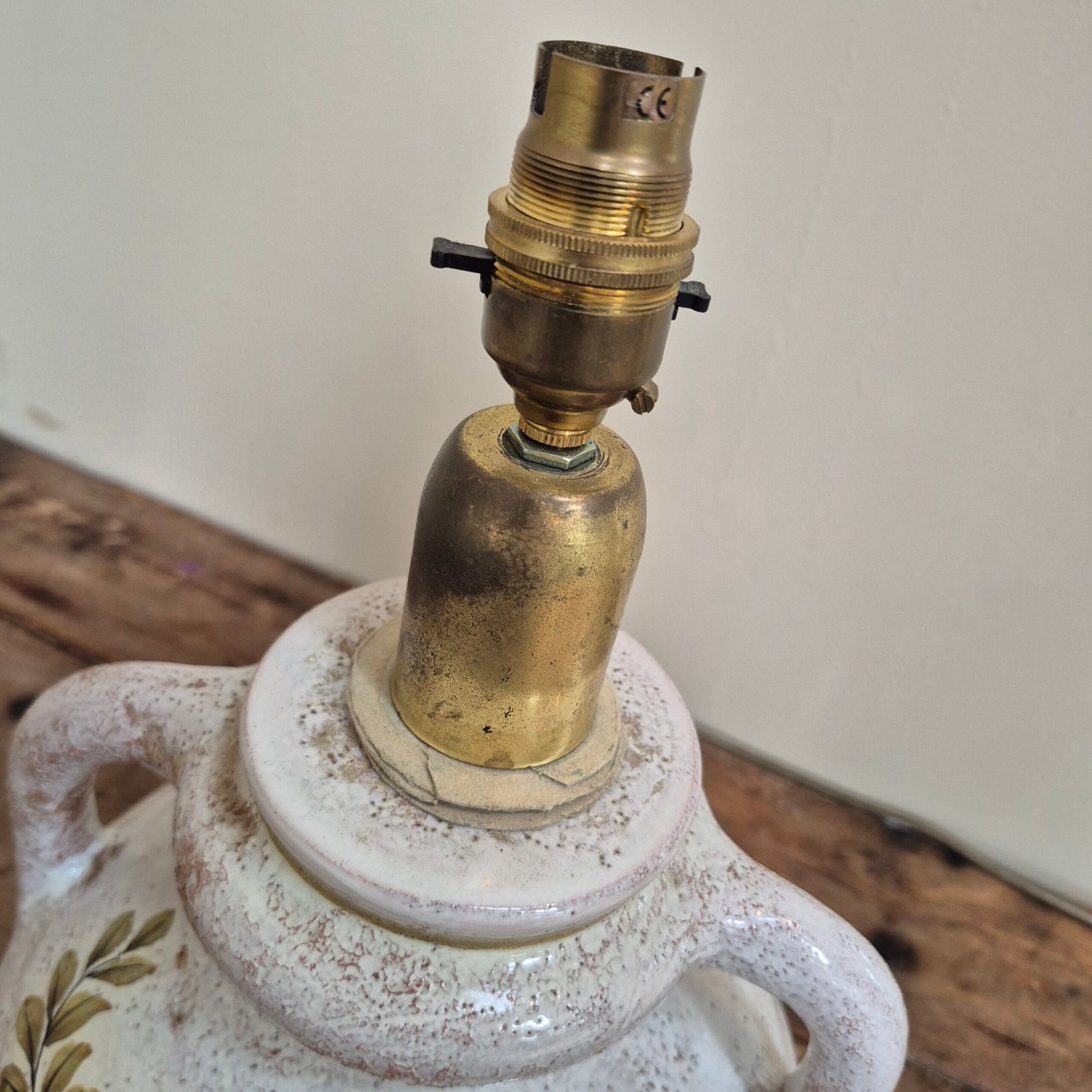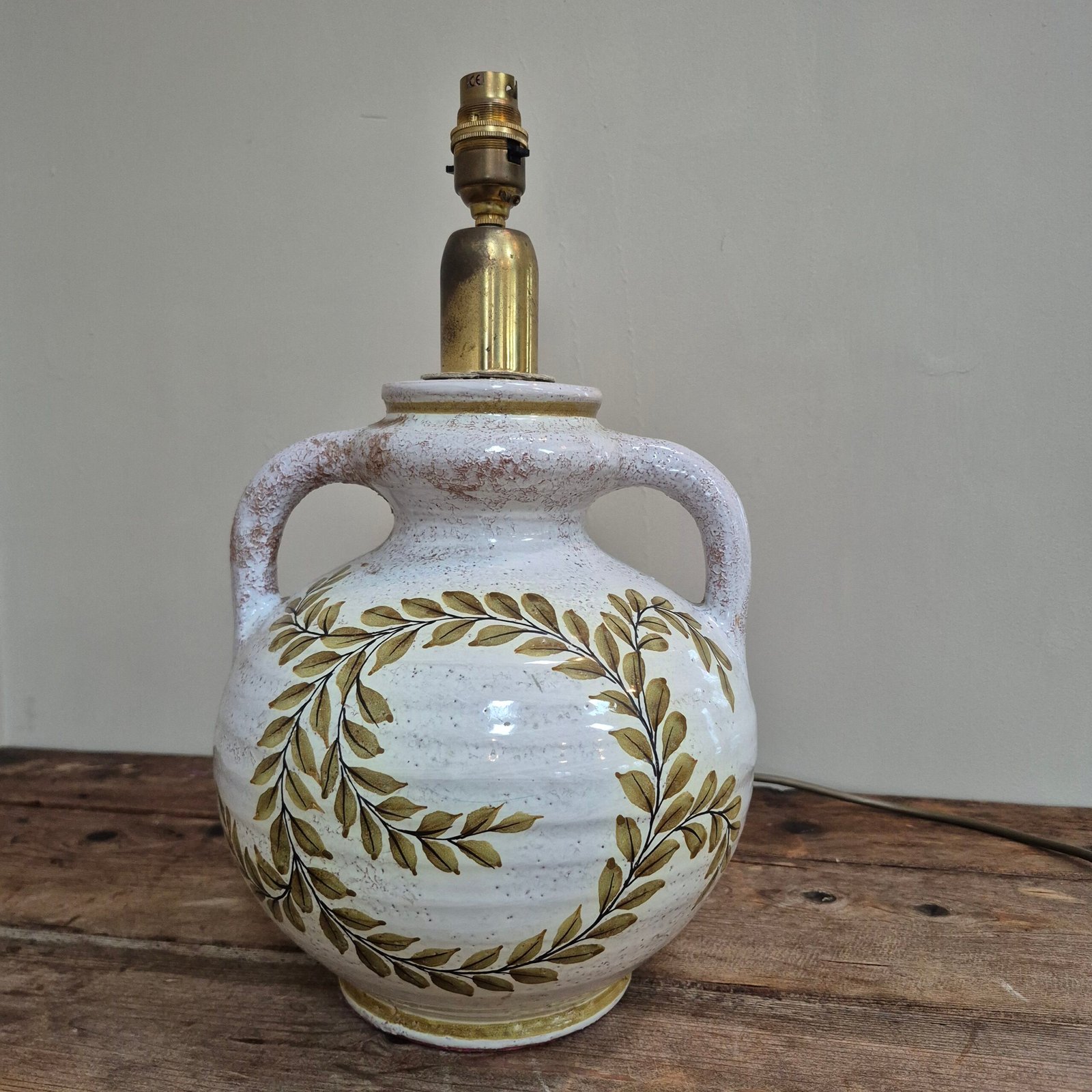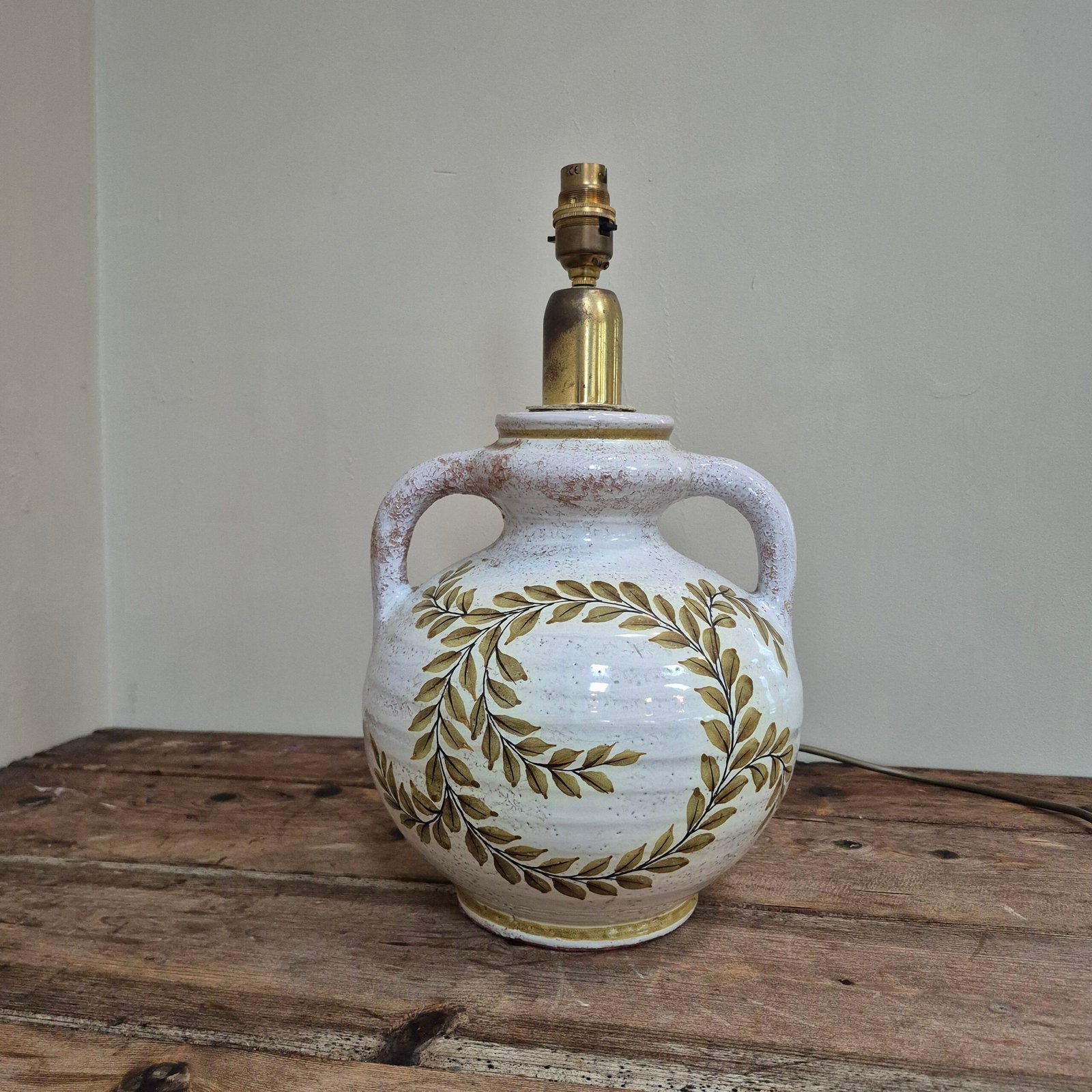 A decorative terracotta table lamp with a soft cream ground, finished with a hand-painted laurel wreath motif. Classical in feel without being heavy, and an easy fit for both traditional and relaxed modern interiors. Brass lamp fitting. Presented with shade as shown. Light surface wear consistent with age.