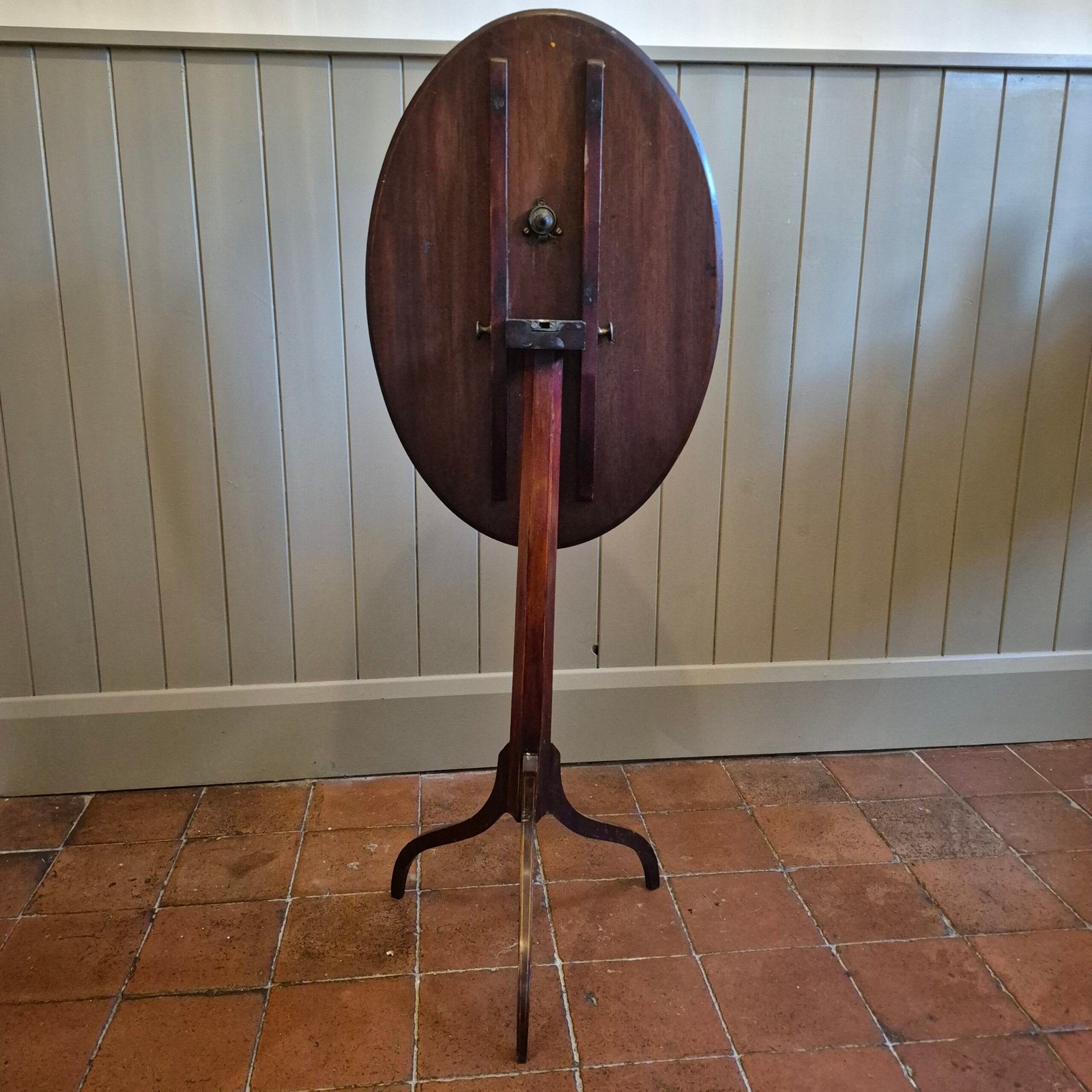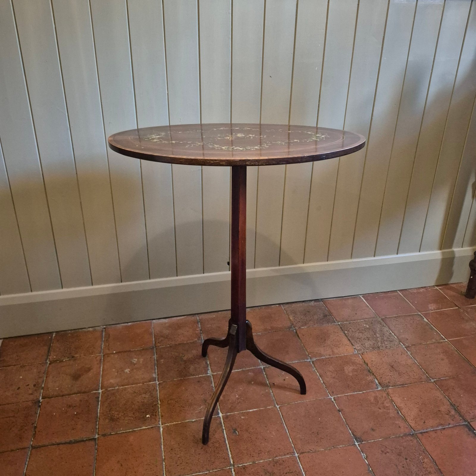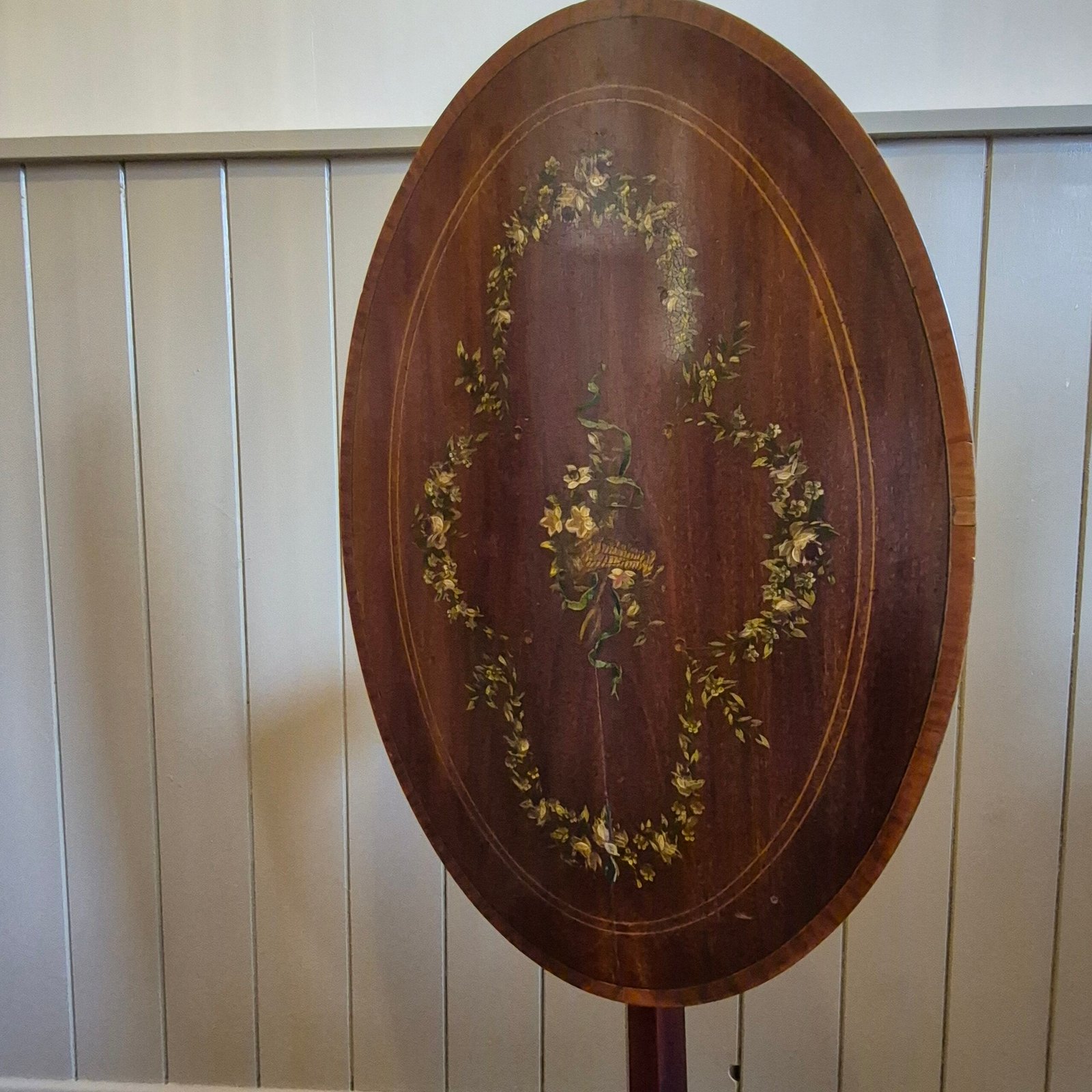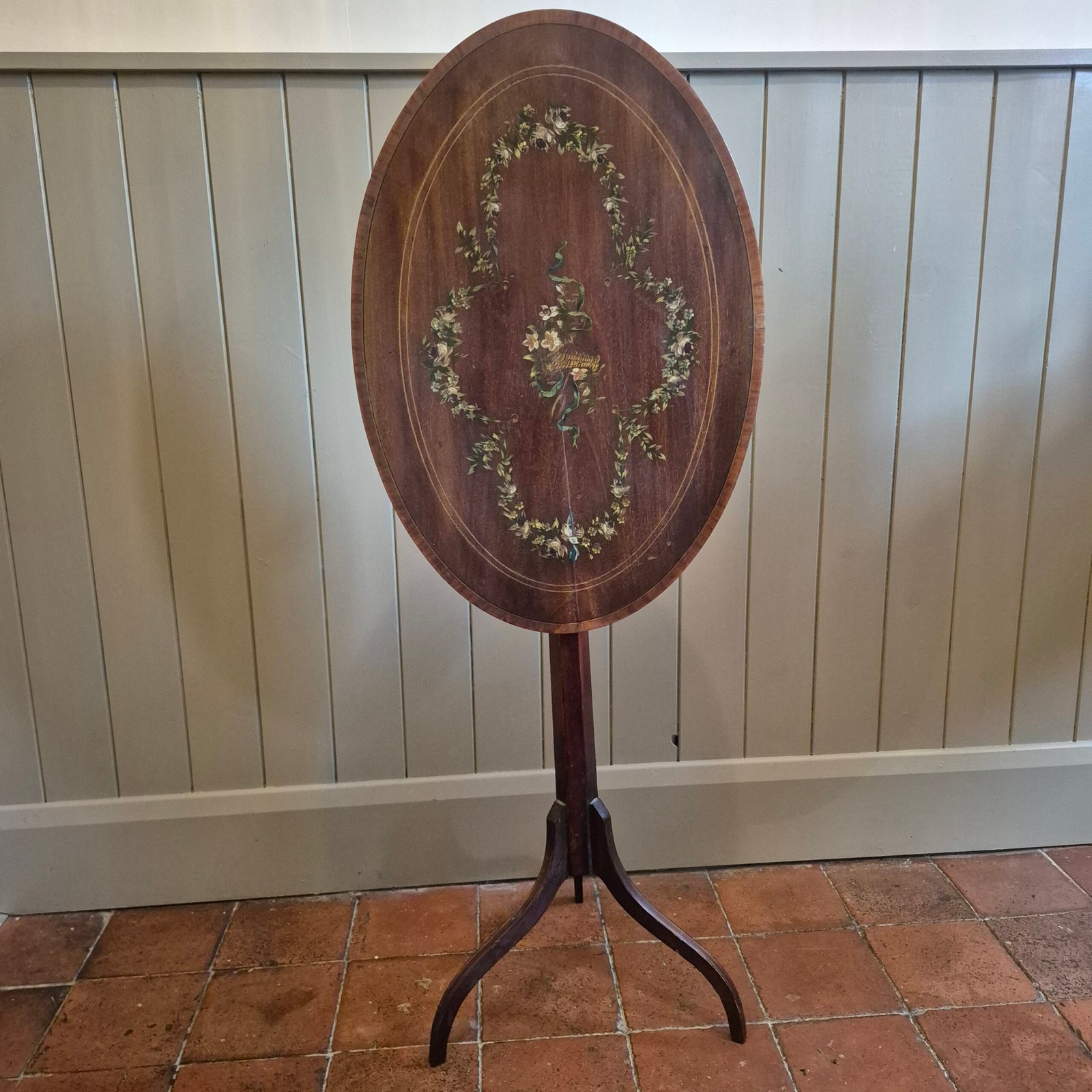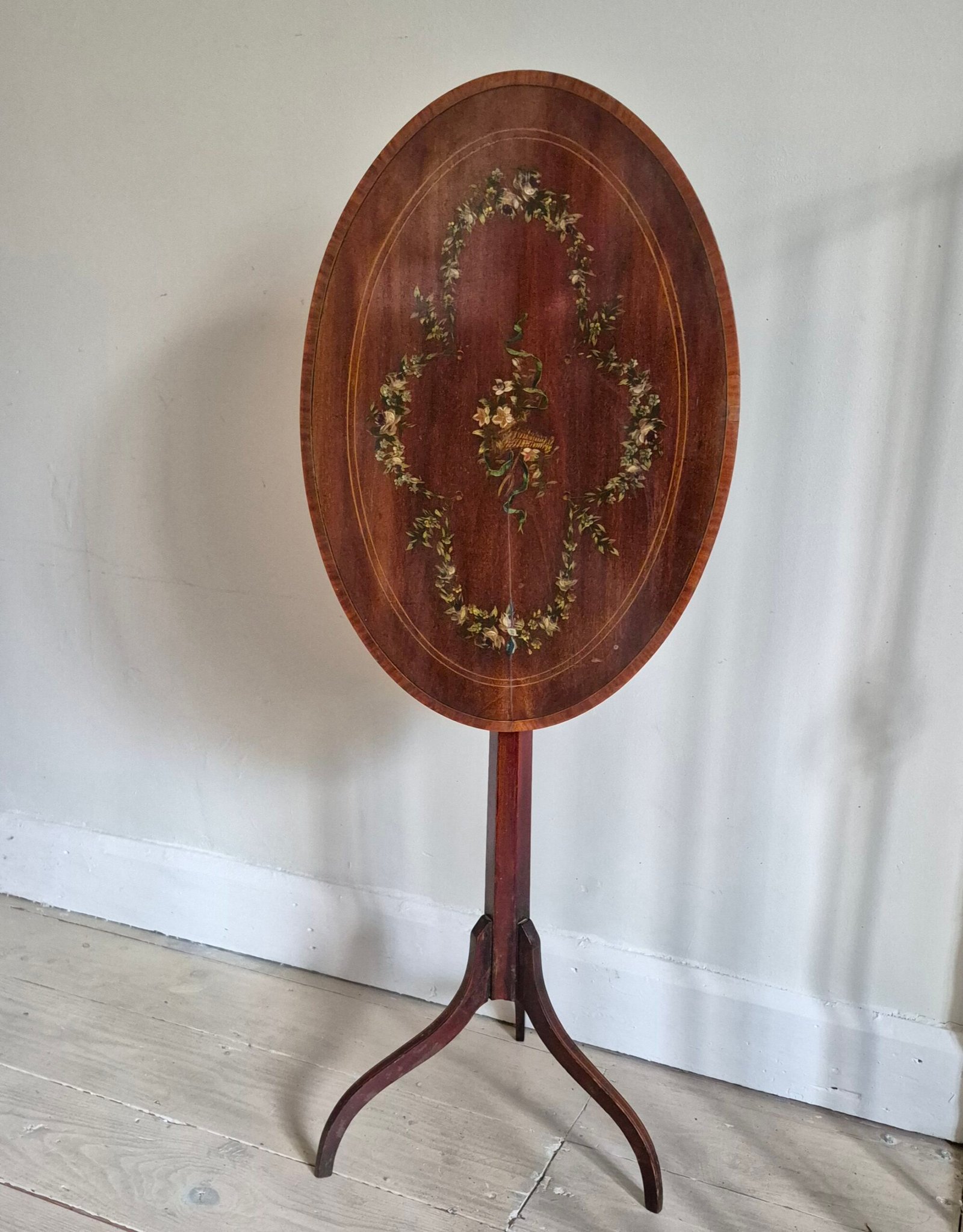 The beautifully proportioned oval top is centred with a hand painted basket of flowers framed by fine string inlay and floral swags. Raised on a slender hexagonal column terminating in an elegant tripod base.