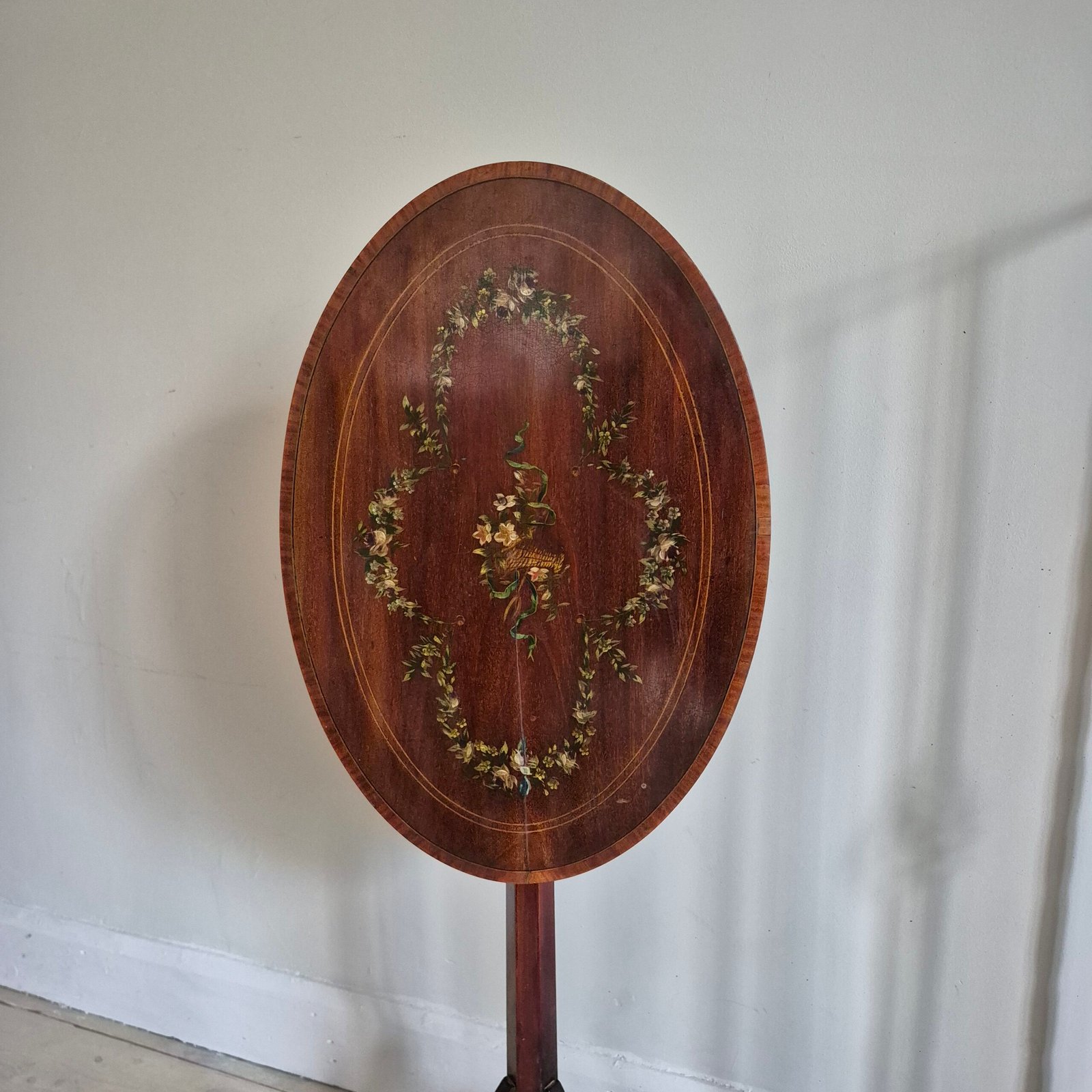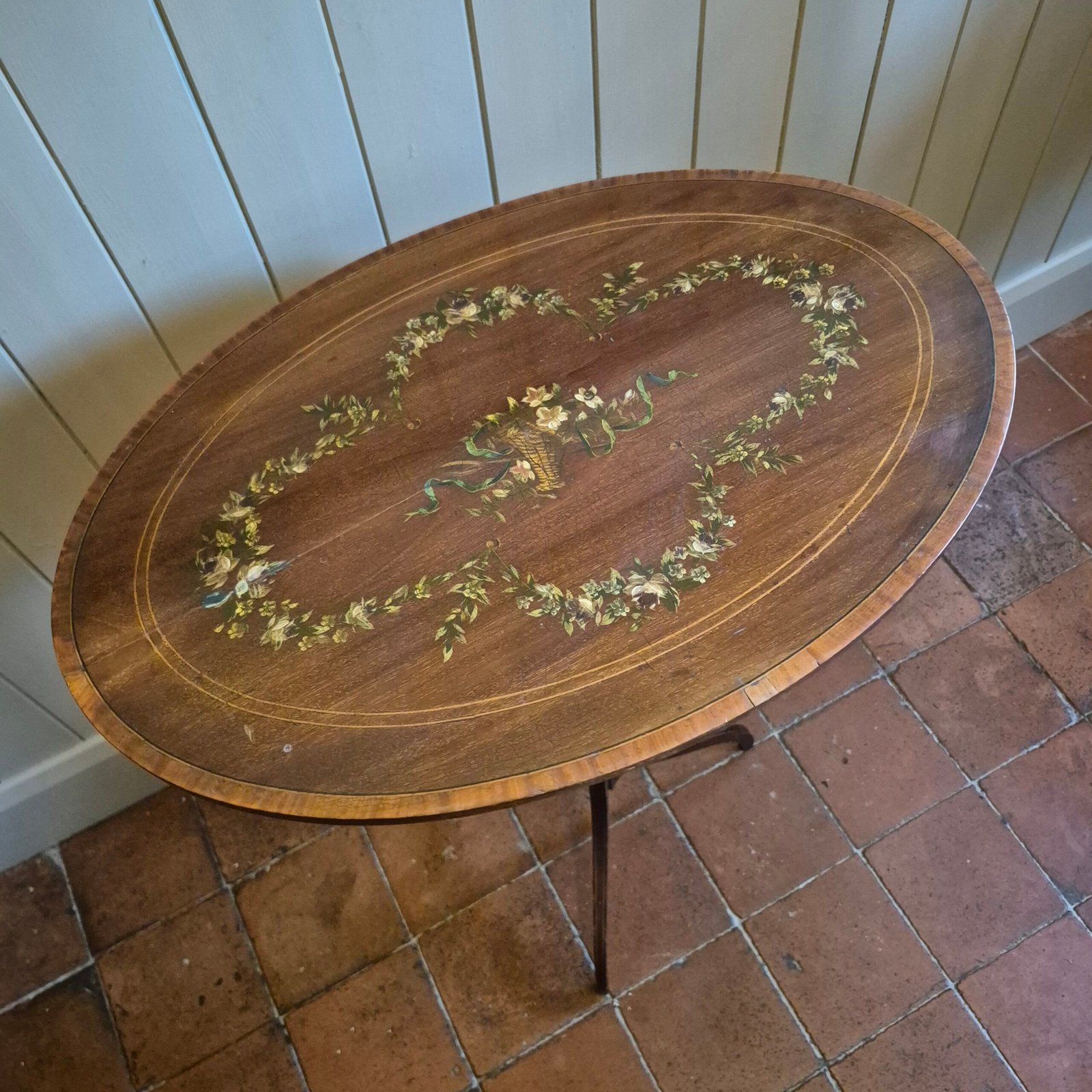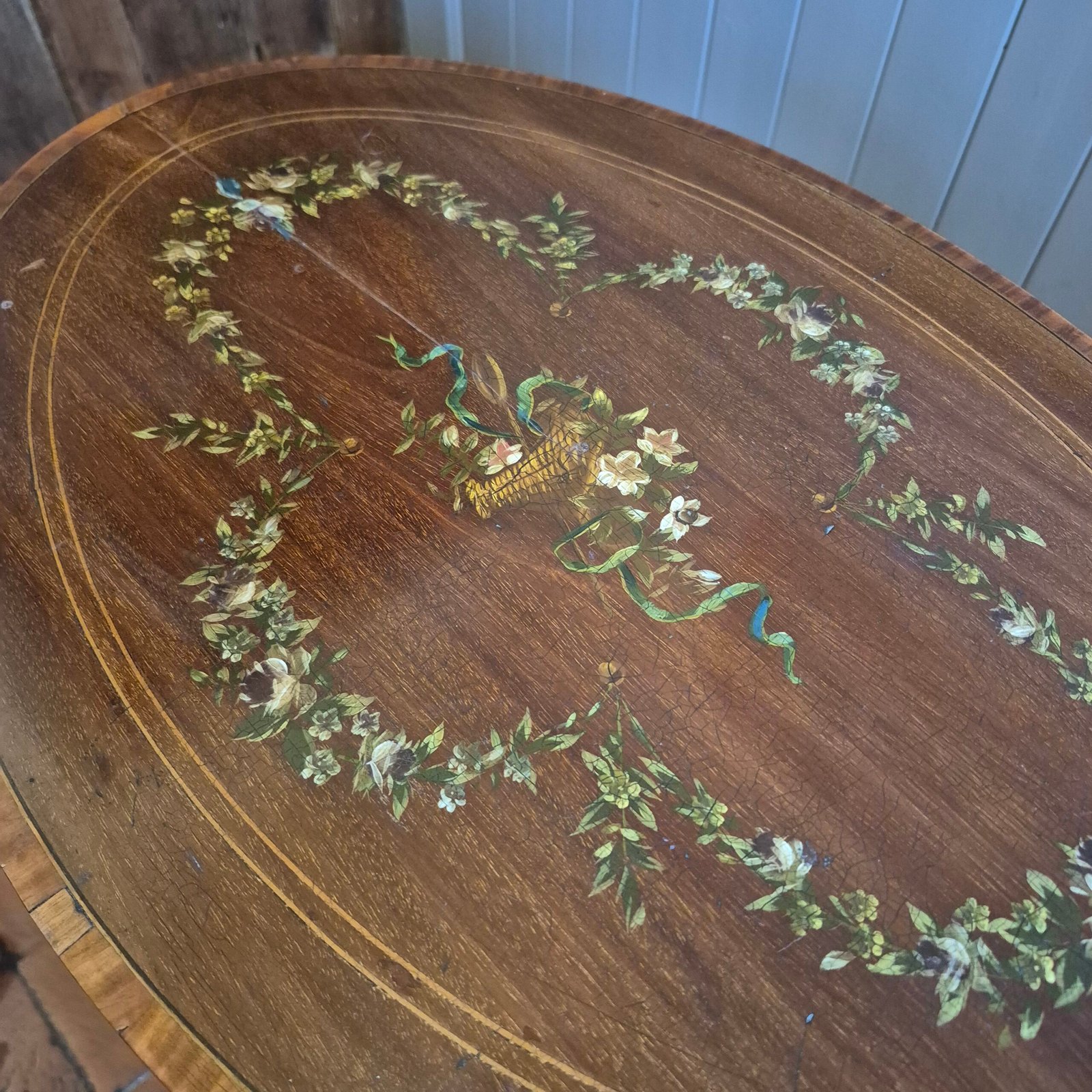 A refined Edwardian mahogany oval lamp table with delicate floral inlay and painted garland detail.