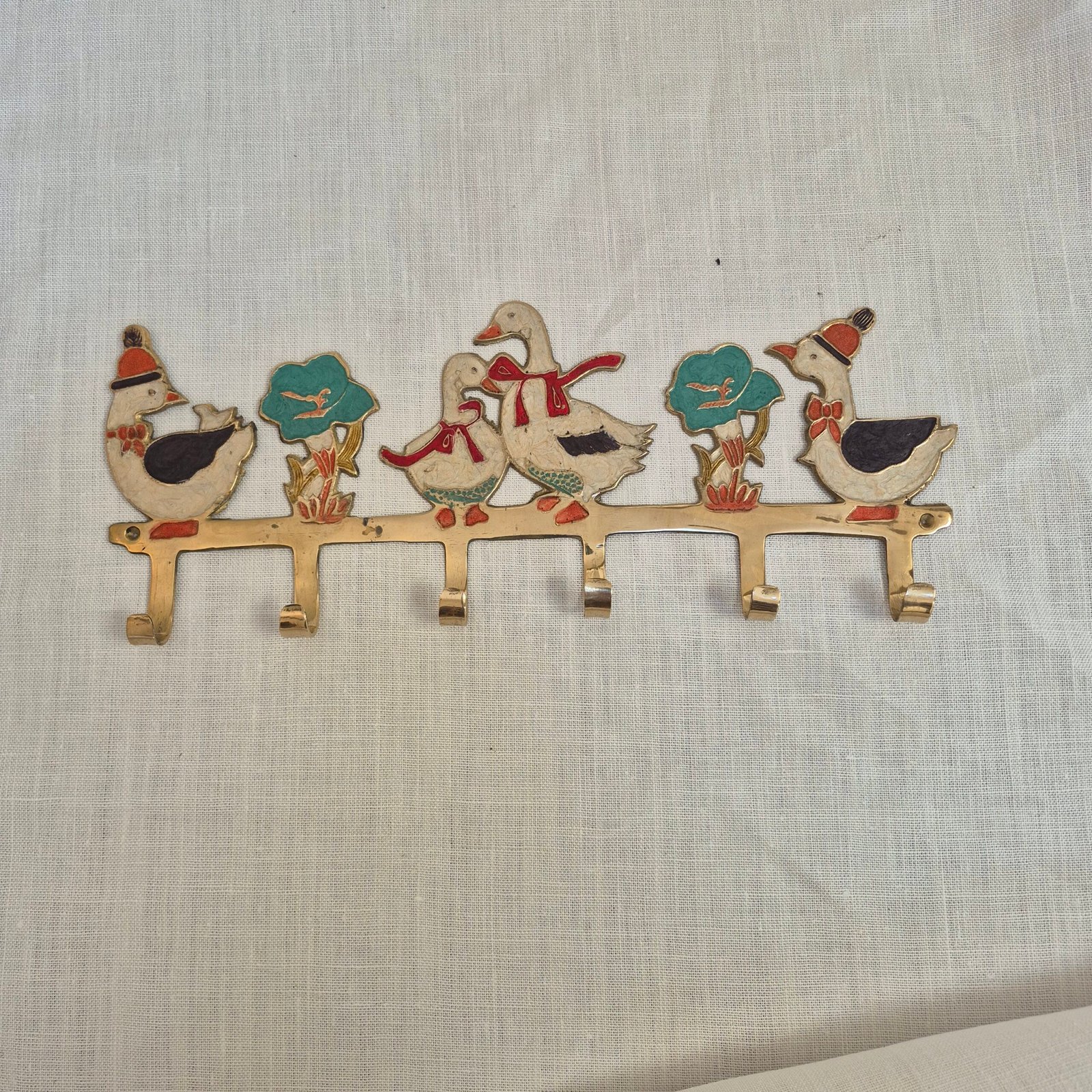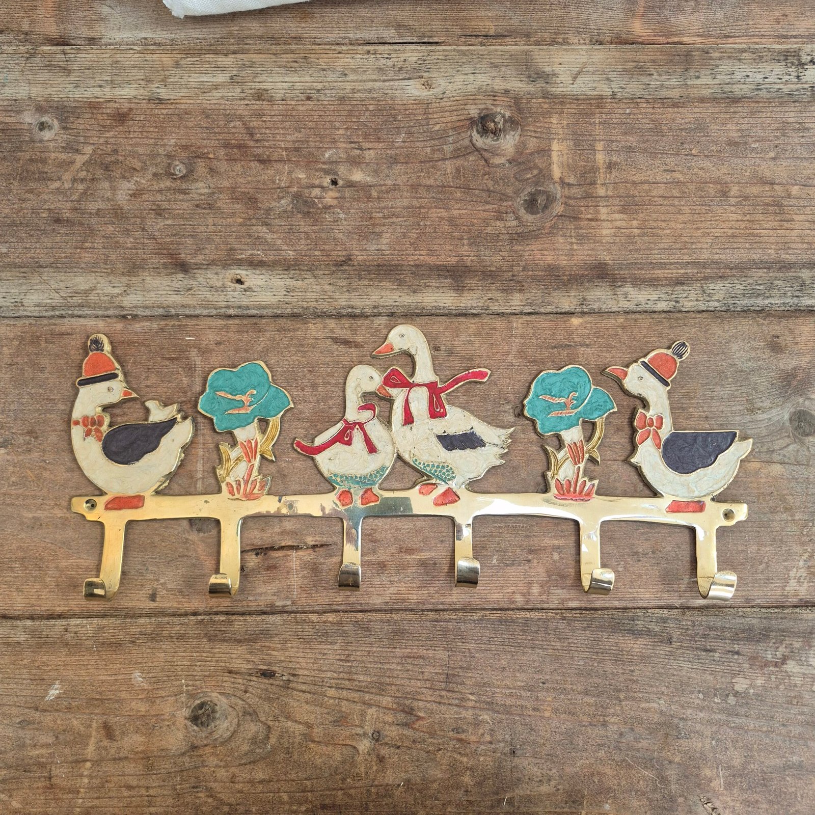 An adorable hand-painted brass wall hook featuring a row of geese with floral detailing, finished in soft blues, reds and cream tones. With six sturdy hooks beneath, this piece is both decorative and practical. Perfect for a hallway, utility room or child’s space, it adds charm without feeling novelty.