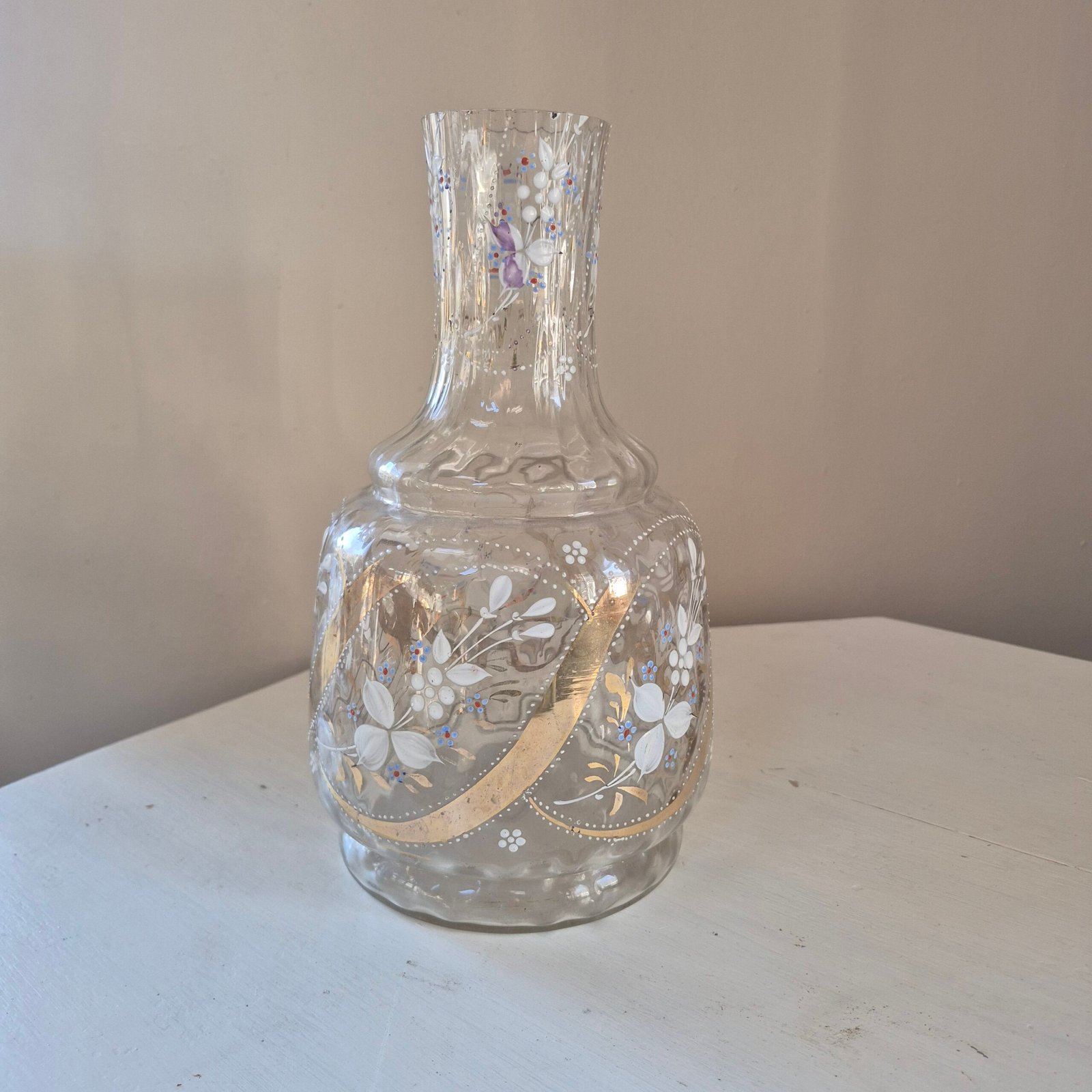 Hand painted glass vase with delicate floral decoration and soft gilt accents. The clear glass has a gentle ripple to it and the painted flowers wrap around the body in white, blue and gold tones. The paint shows light age in places which suits the piece and adds to the vintage look. A pretty decorative vase with a French feel