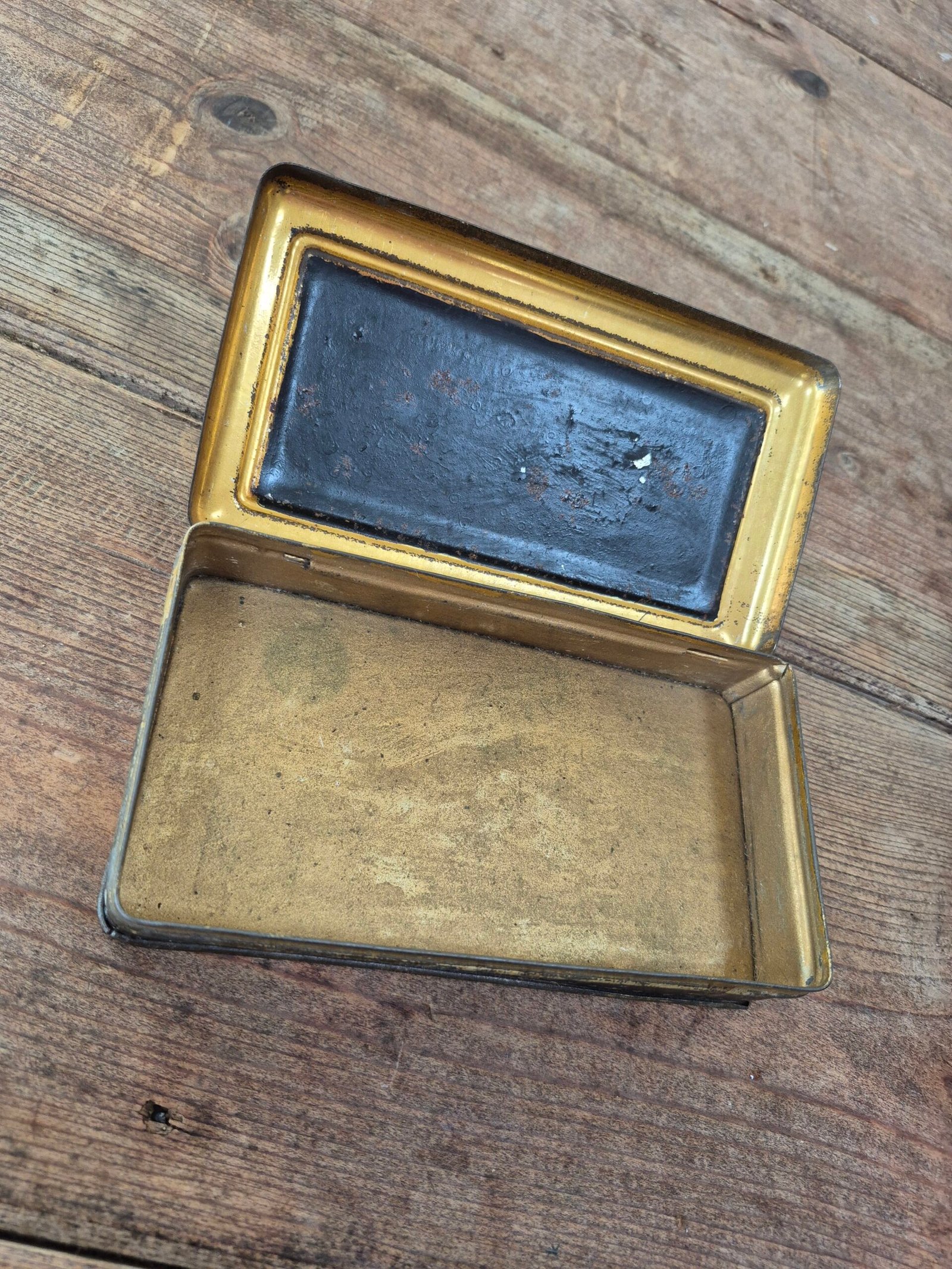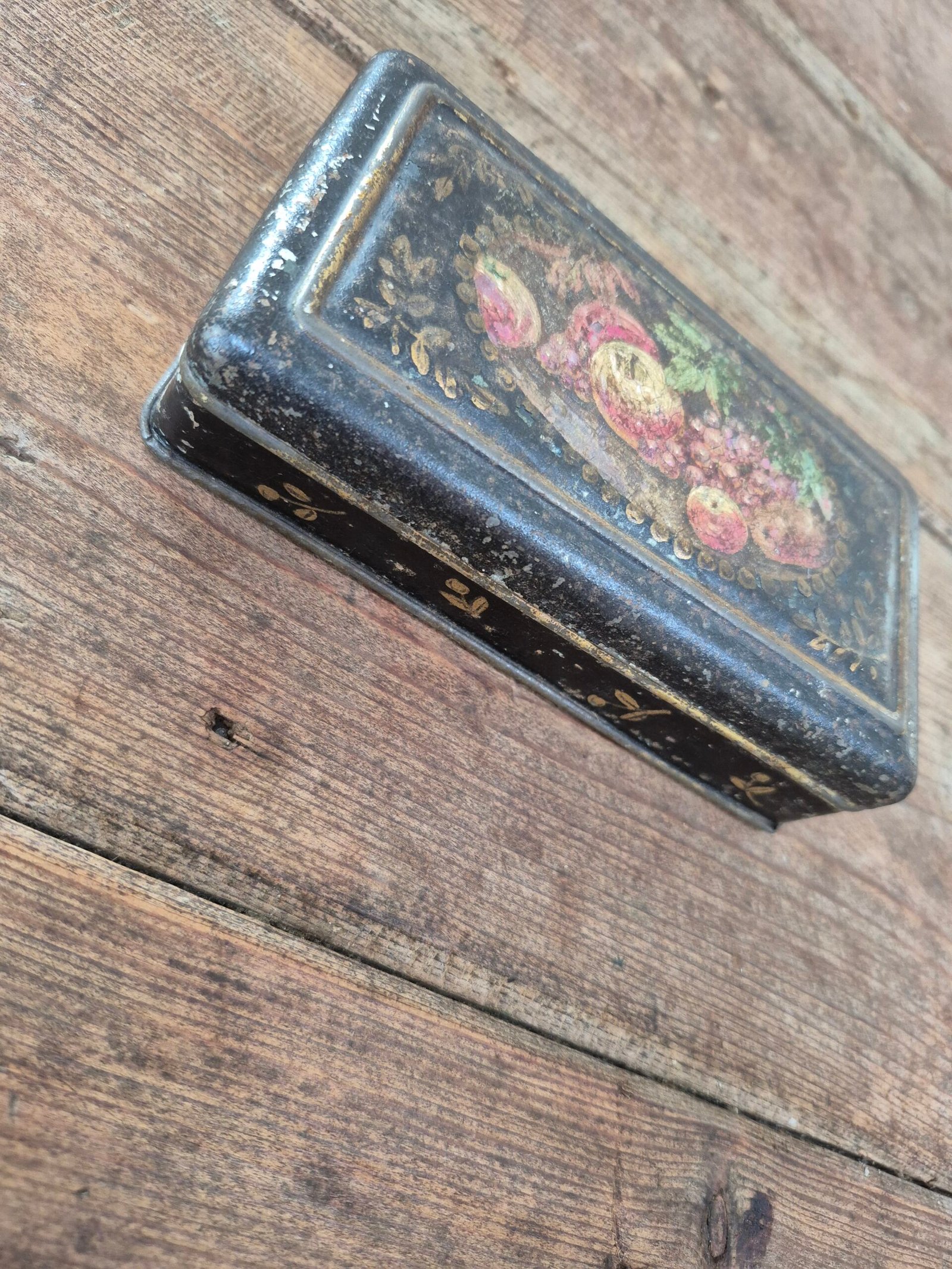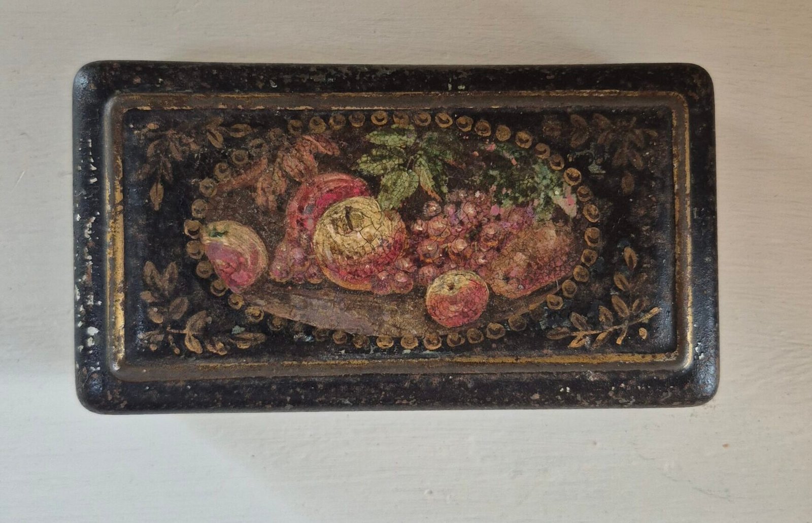 Small vintage lacquer box with a hand painted still life on the lid. The artwork shows fruit in rich reds and golds, framed with delicate gilt detailing. The surface has gentle wear and speckling from age, which gives it that soft, timeworn character rather than a perfect gloss.