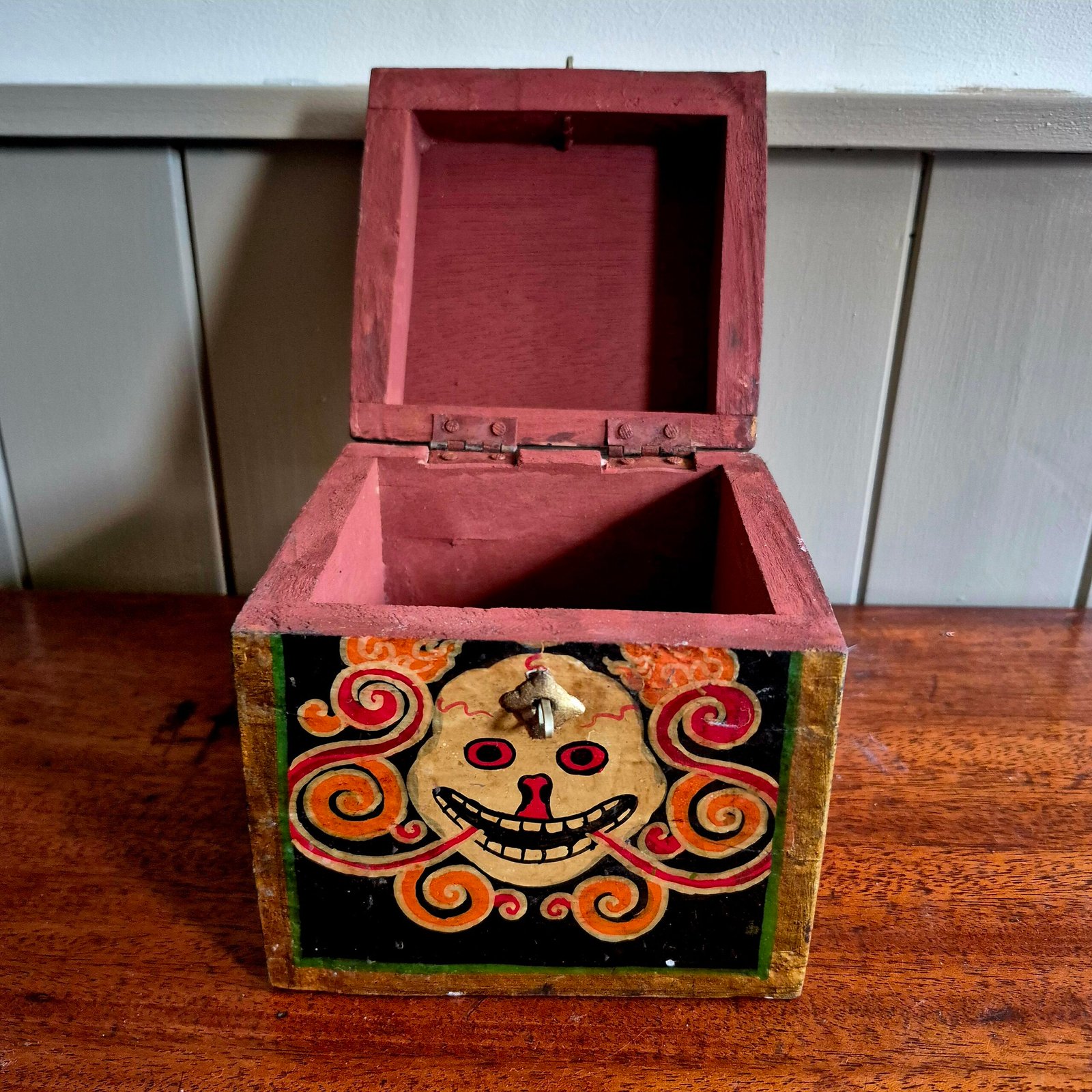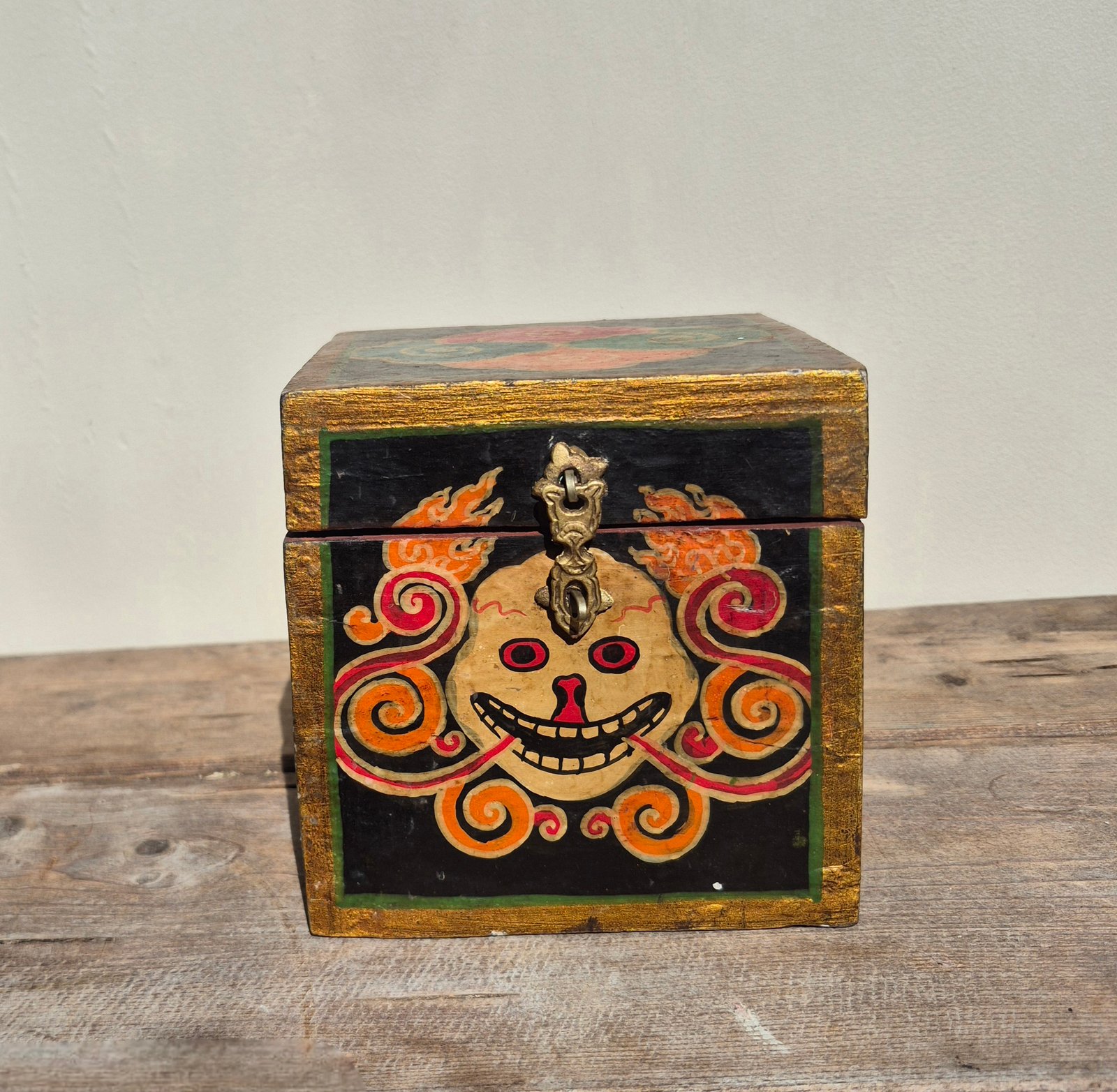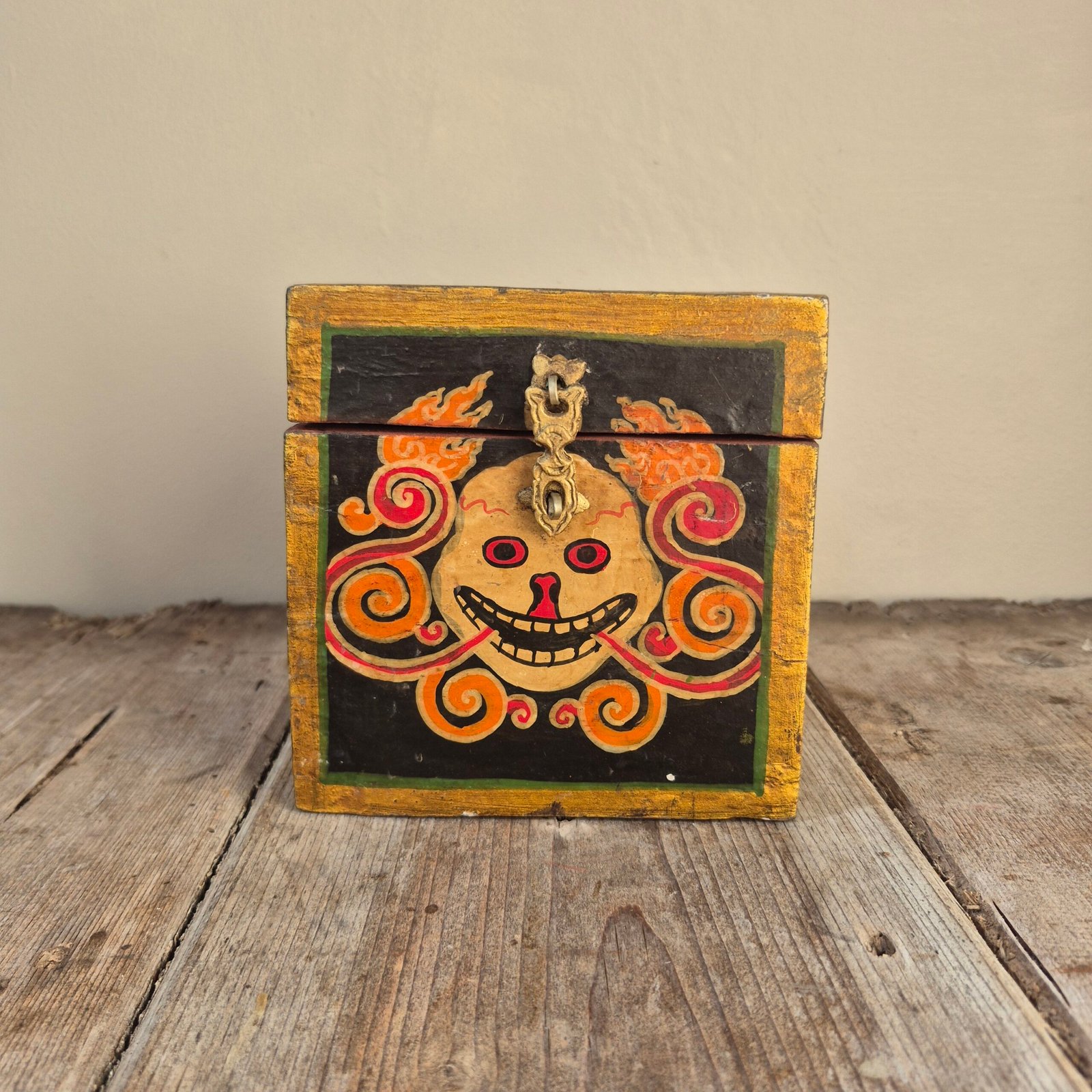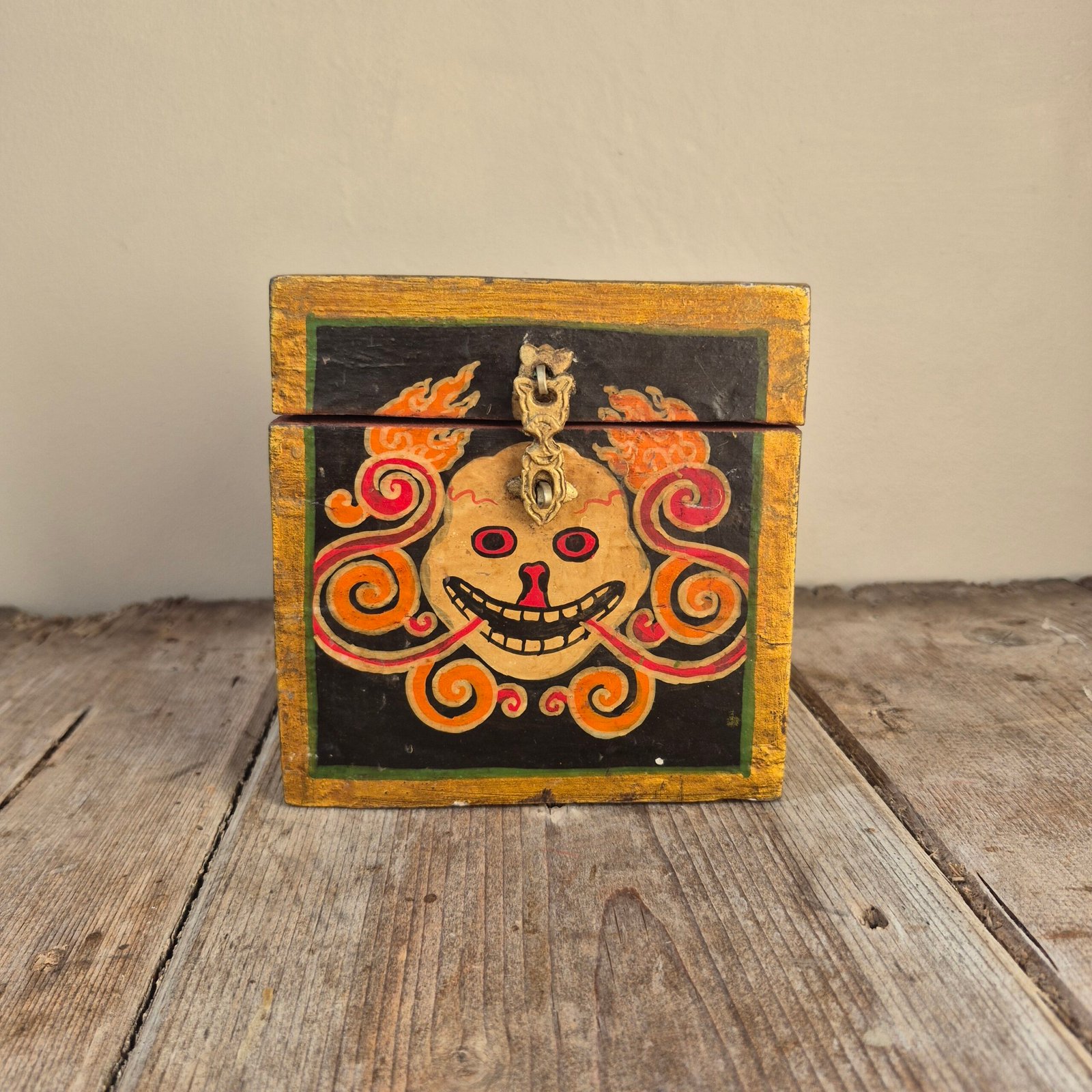 The bold, expressive face and swirling flame-like detailing give this piece real presence, while the aged paint and natural wear add to its authenticity and charm. Finished with a simple metal clasp, it works beautifully as both a decorative object and a functional storage piece.