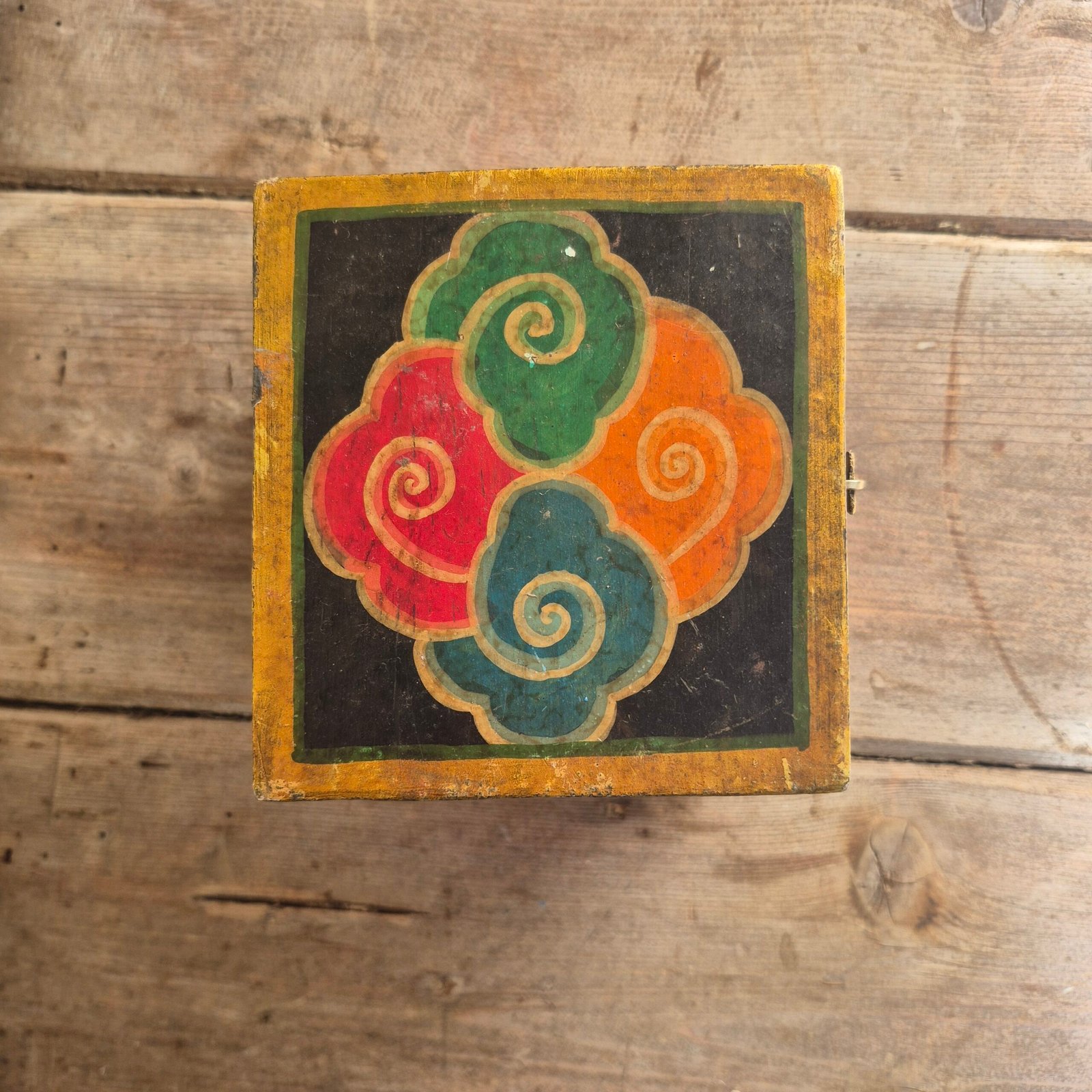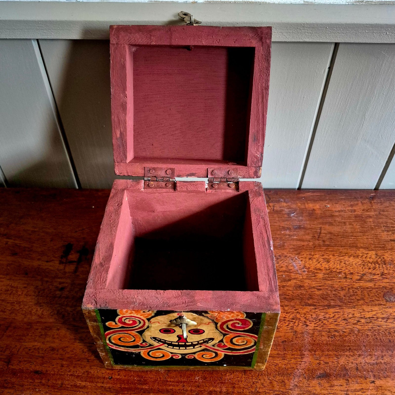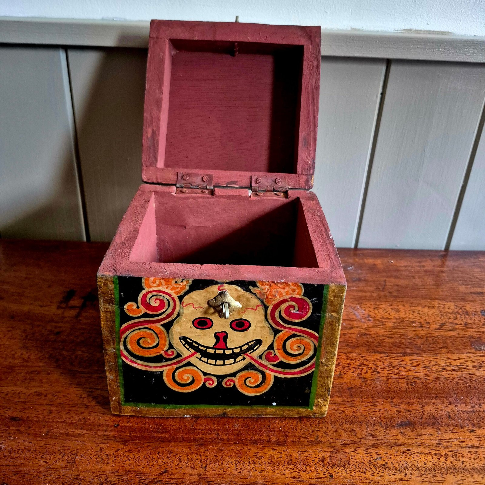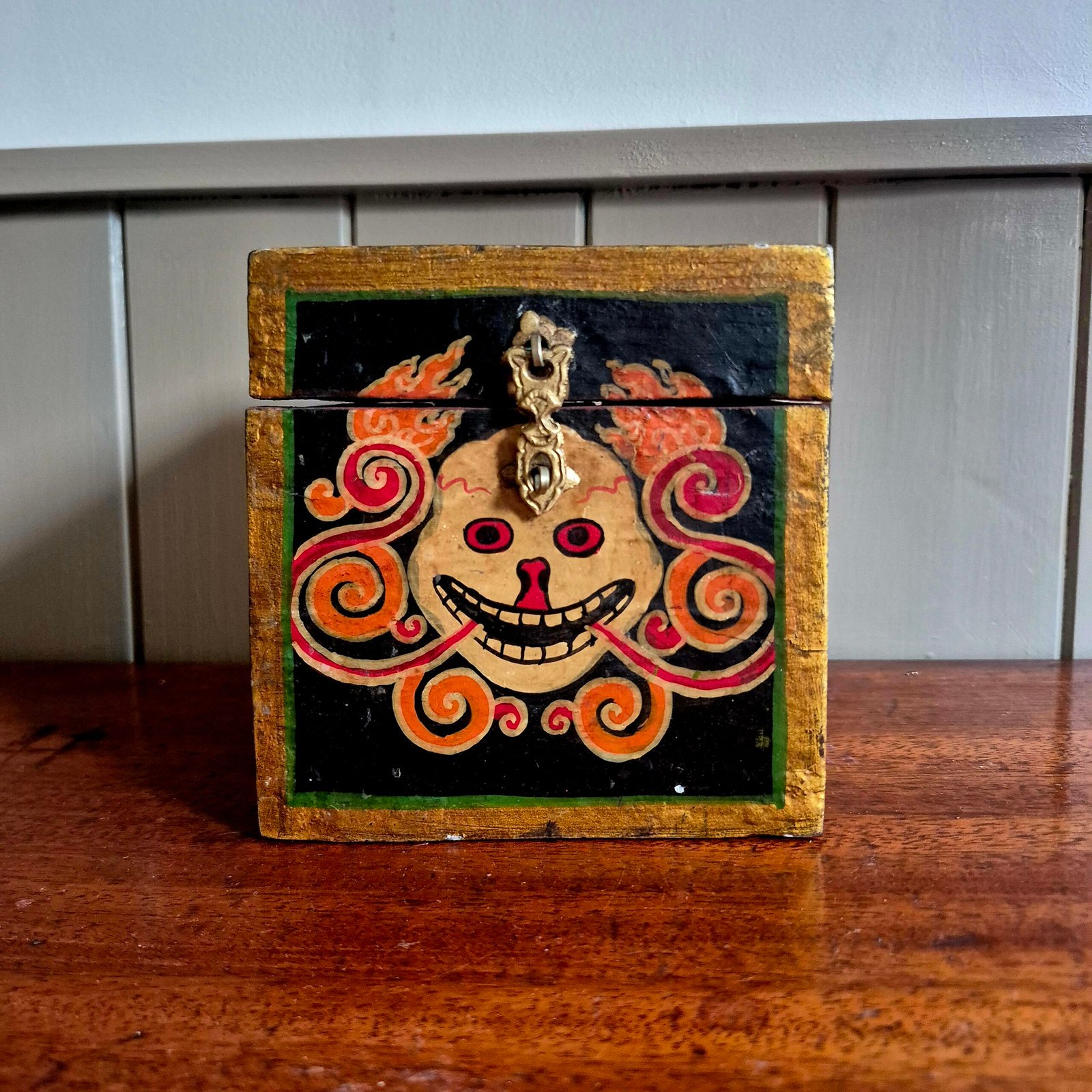 The bold, expressive face and swirling flame-like detailing give this piece real presence, while the aged paint and natural wear add to its authenticity and charm. Finished with a simple metal clasp, it works beautifully as both a decorative object and a functional storage piece.