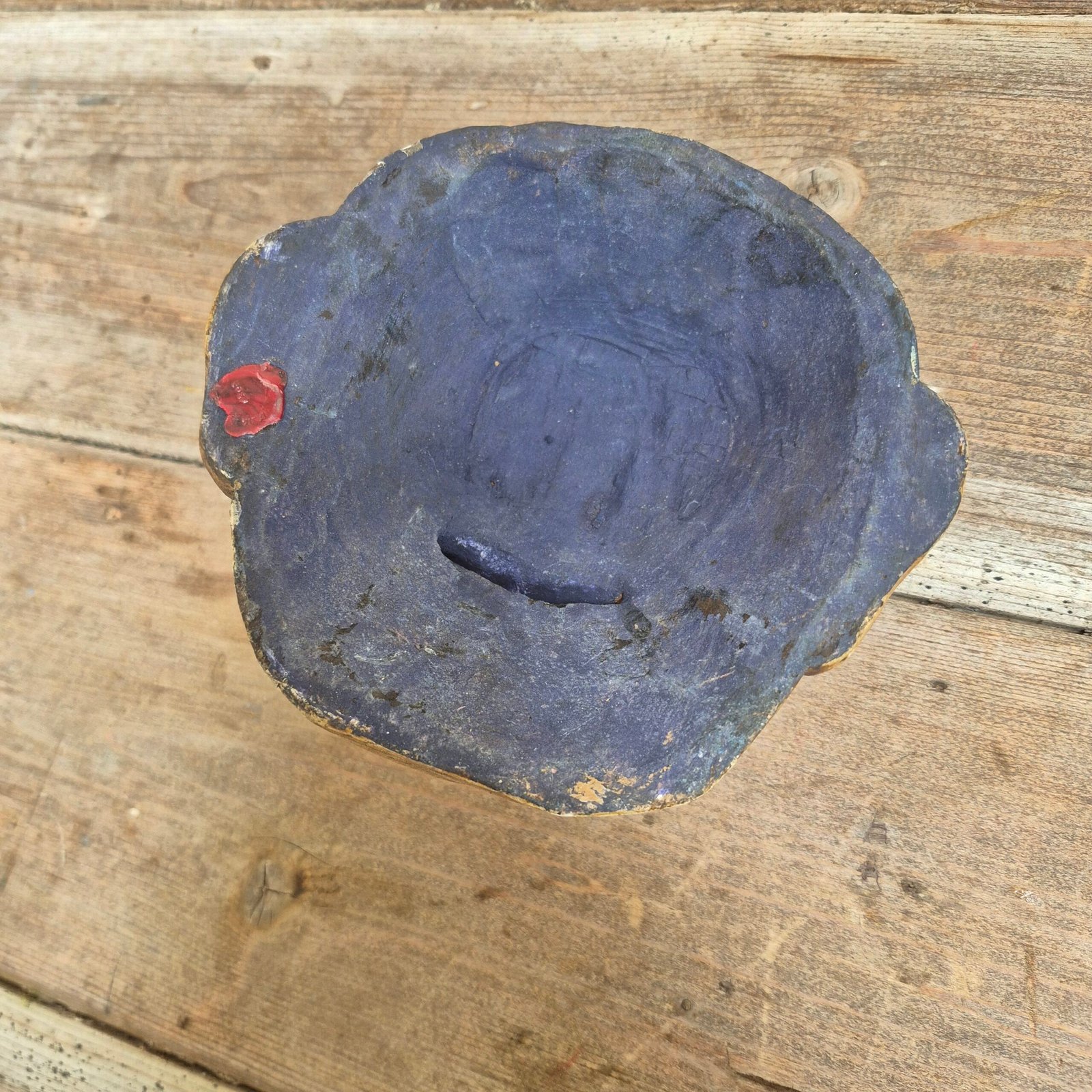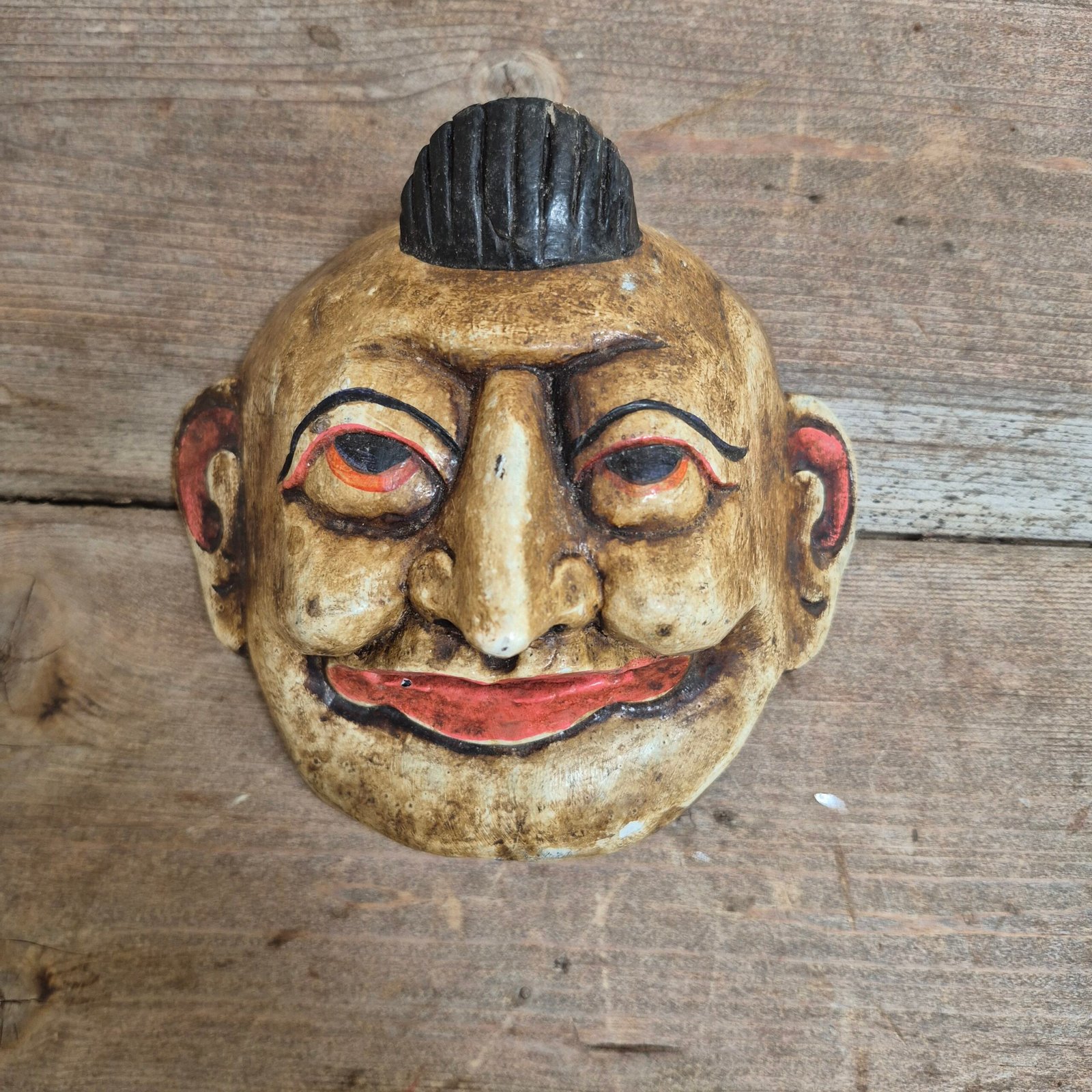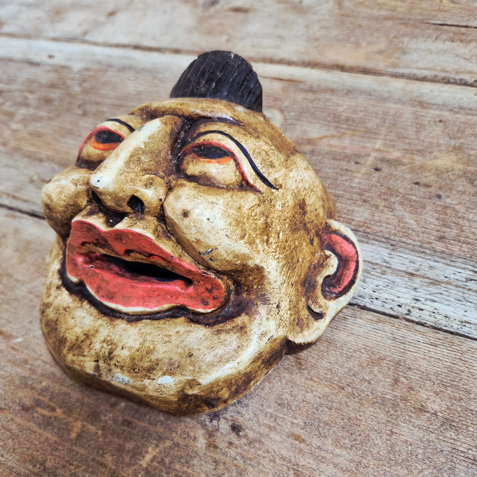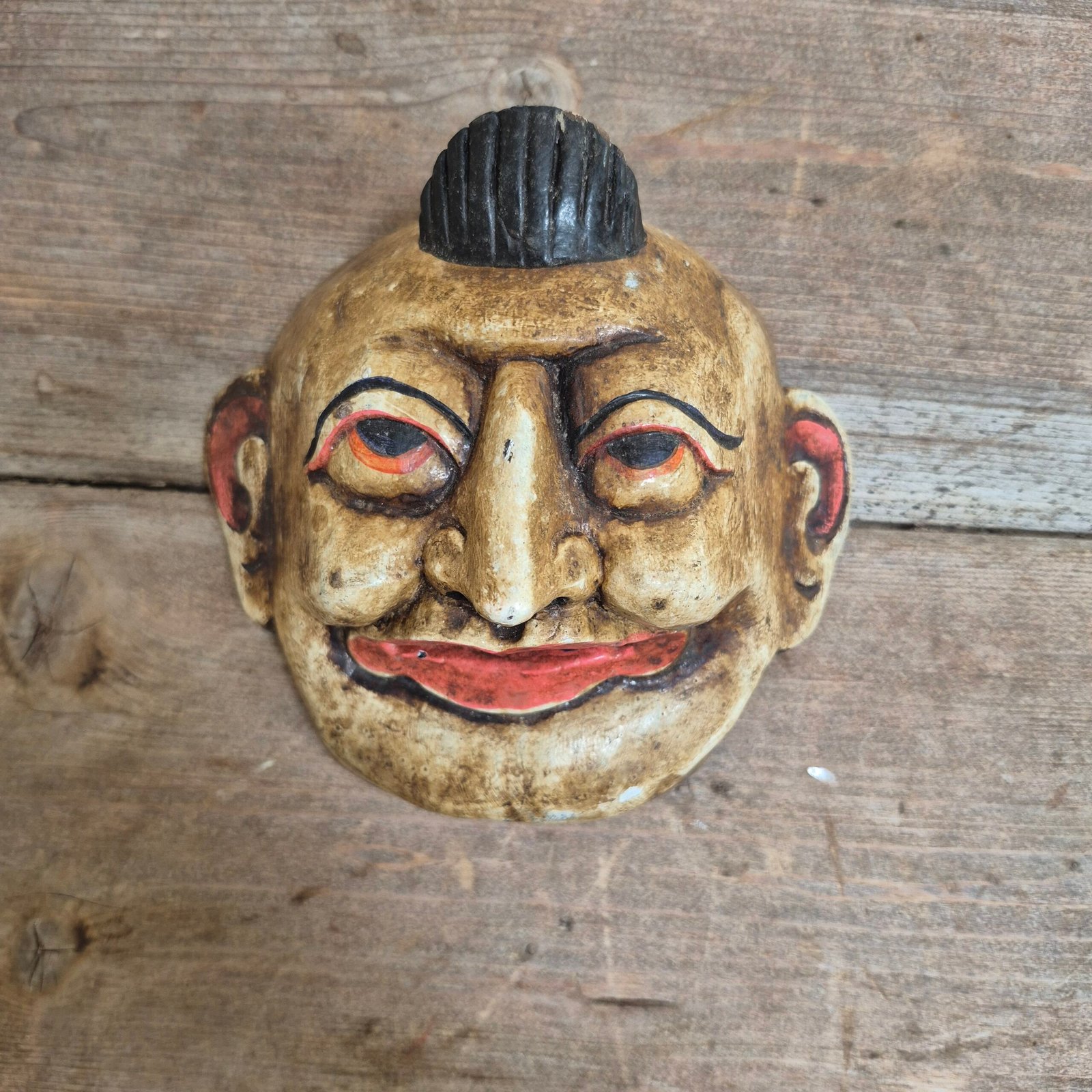 The rounded form and expressive face give it a more playful, almost human quality compared to more traditional ceremonial masks. The worn surface and hand-painted detailing add to its charm and authenticity.