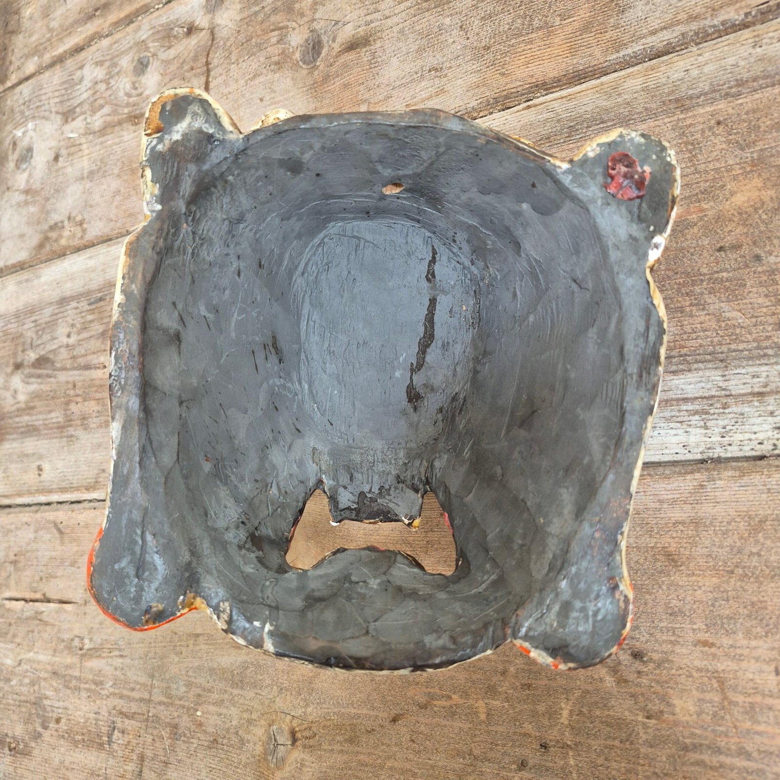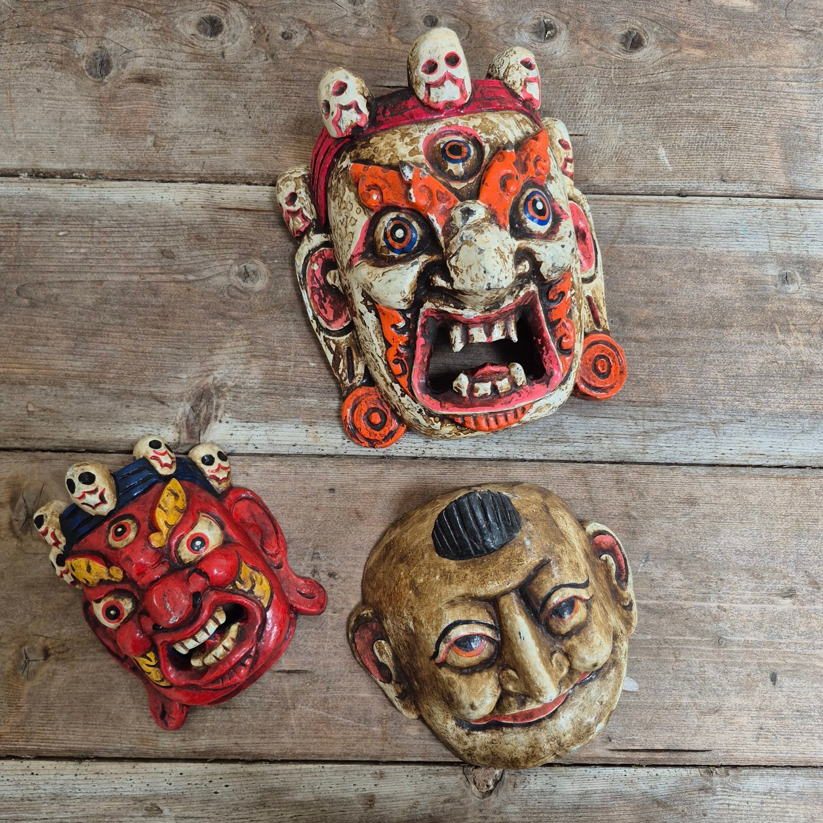 Rich in character, the mask shows beautiful wear to the painted surface, giving it a raw, timeworn finish. The expressive features and detailing are inspired by traditional ceremonial masks from the Himalayan region.