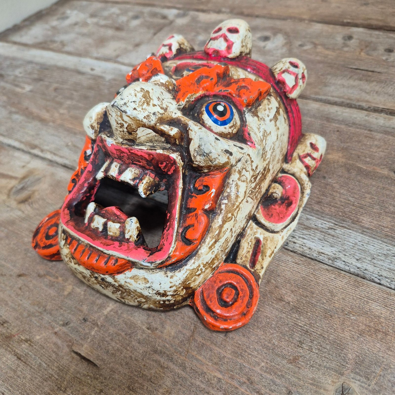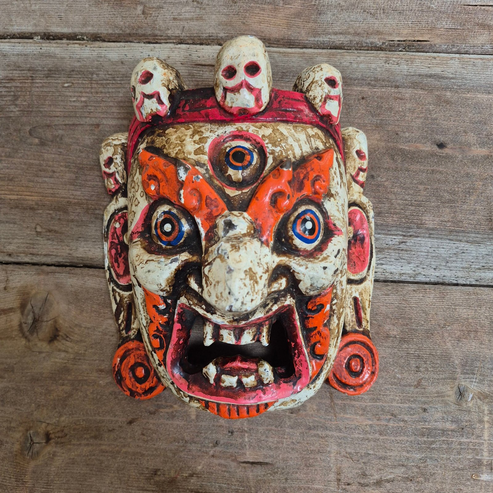 A striking Himalayan style painted mask, featuring bold colours and a crown of skulls across the top.