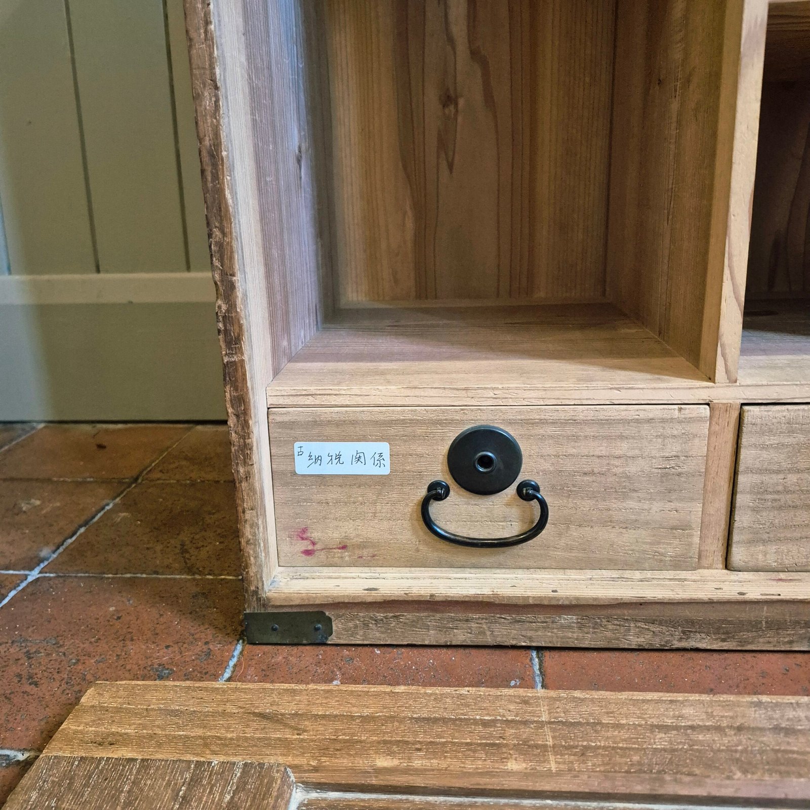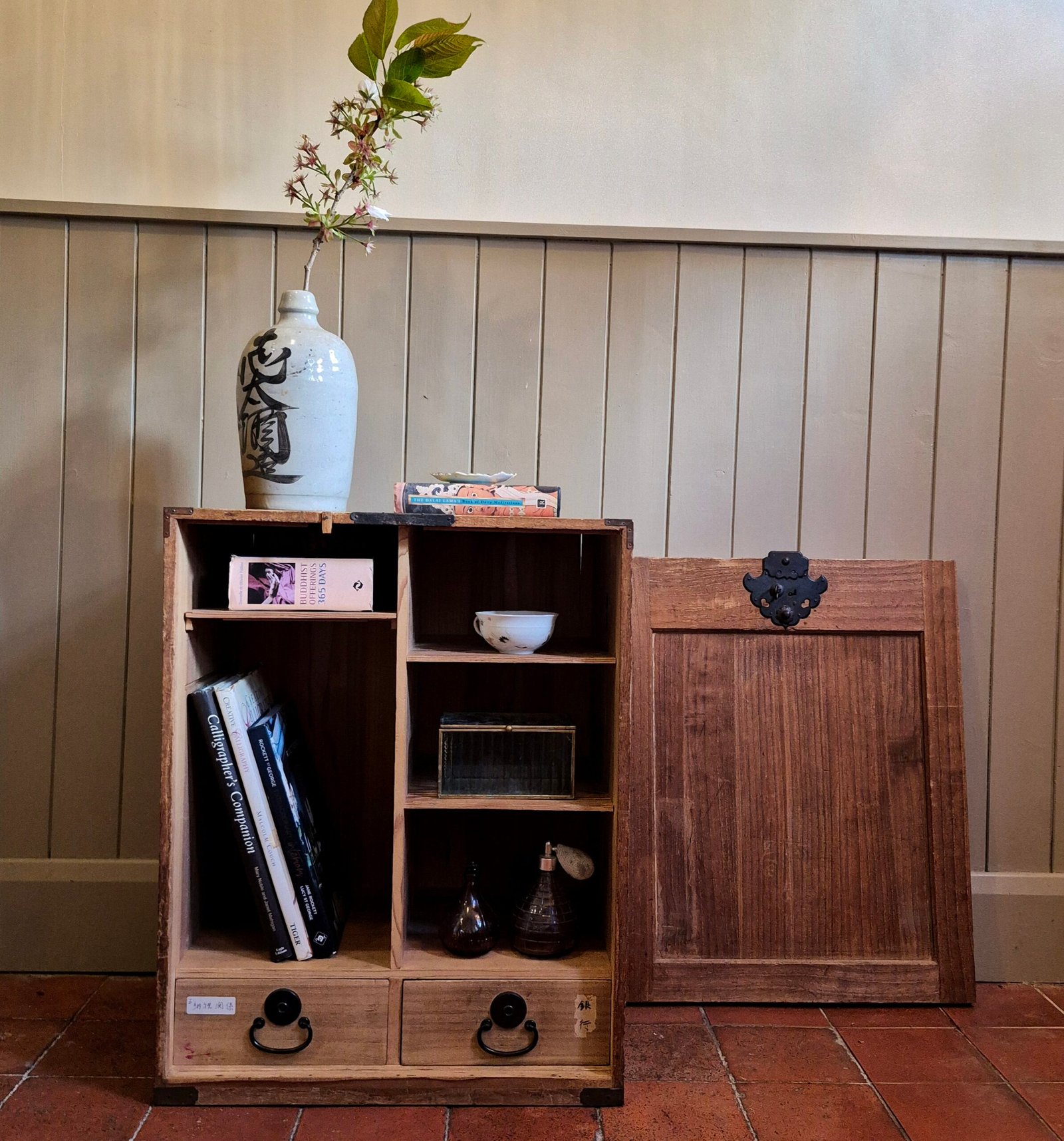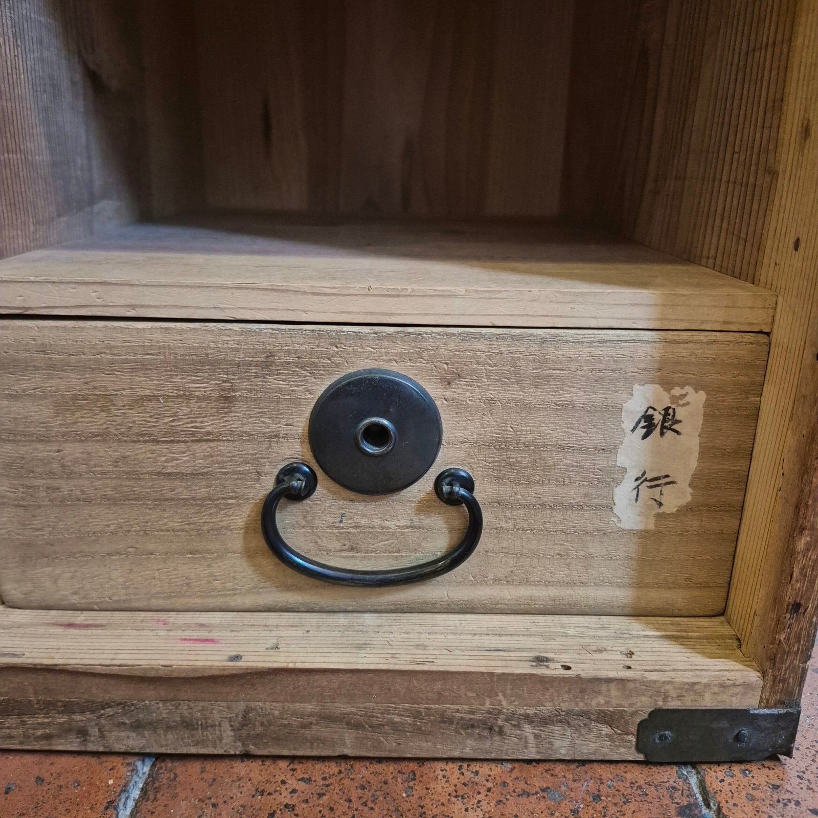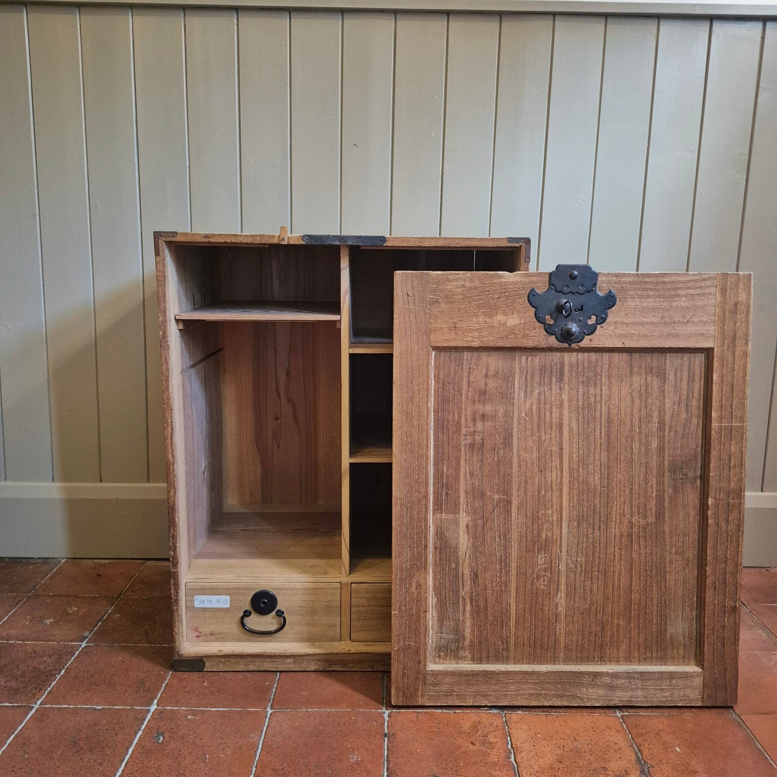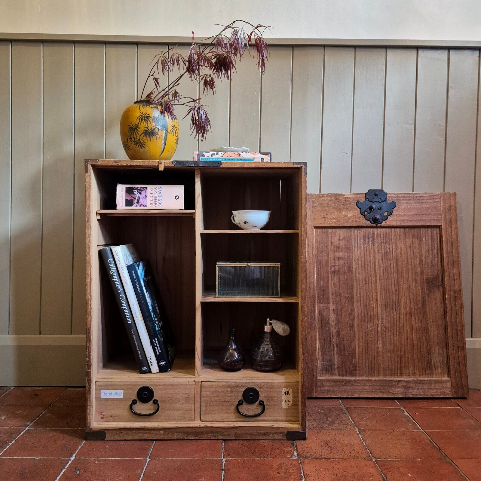 The form is simple and solid, with a drop-front panel and internal drawers, finished with dark metal fittings that give it that unmistakable tansu look. The timber has a soft, timeworn surface, showing years of use in a way that feels honest rather than restored.