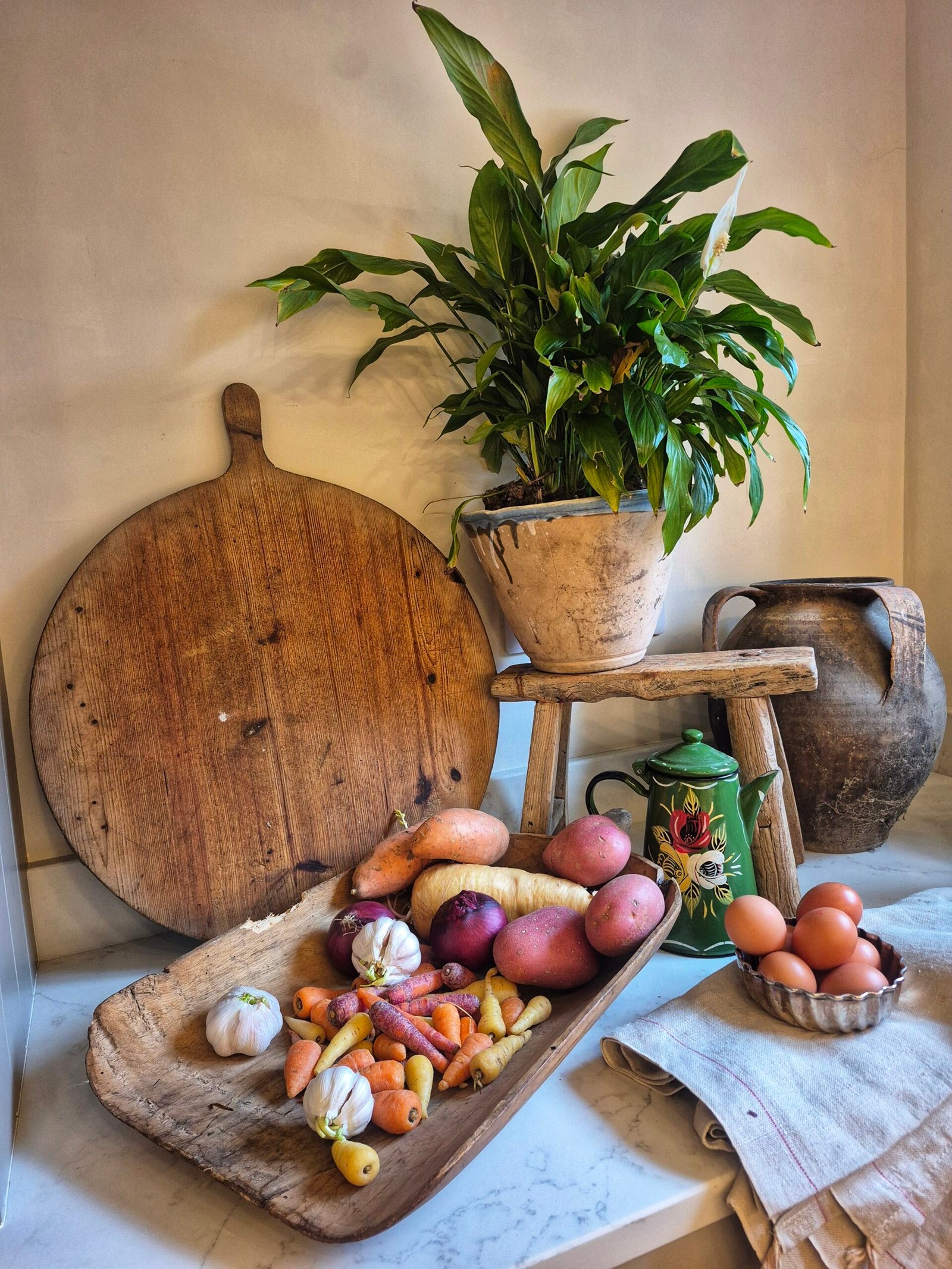 Large vintage wooden chopping board with a round form and simple handled top. The surface shows knife marks, wear and natural knots in the wood, all of which give it a lovely rustic character. Great as a serving board, display piece or layered against a kitchen wall for that lived in look.