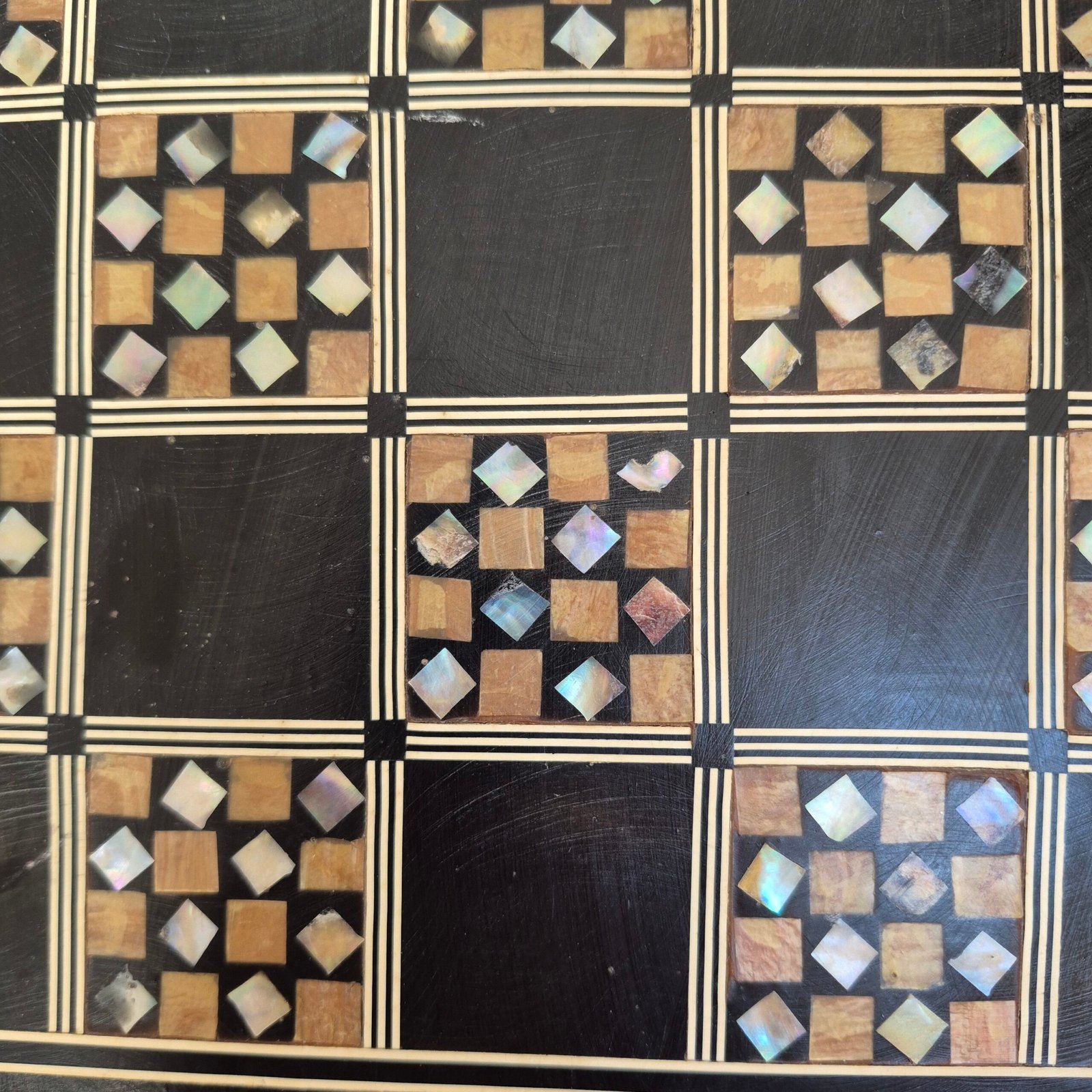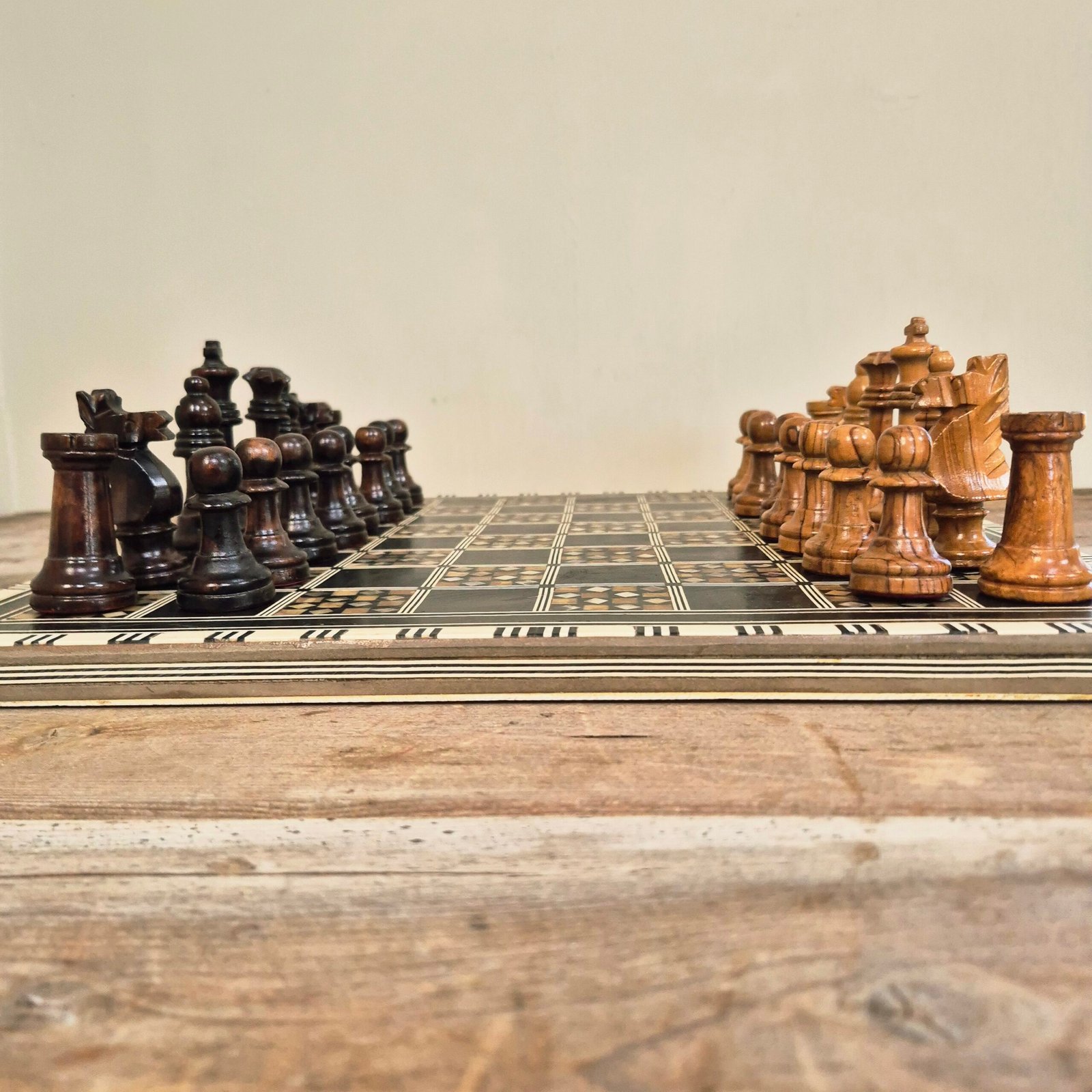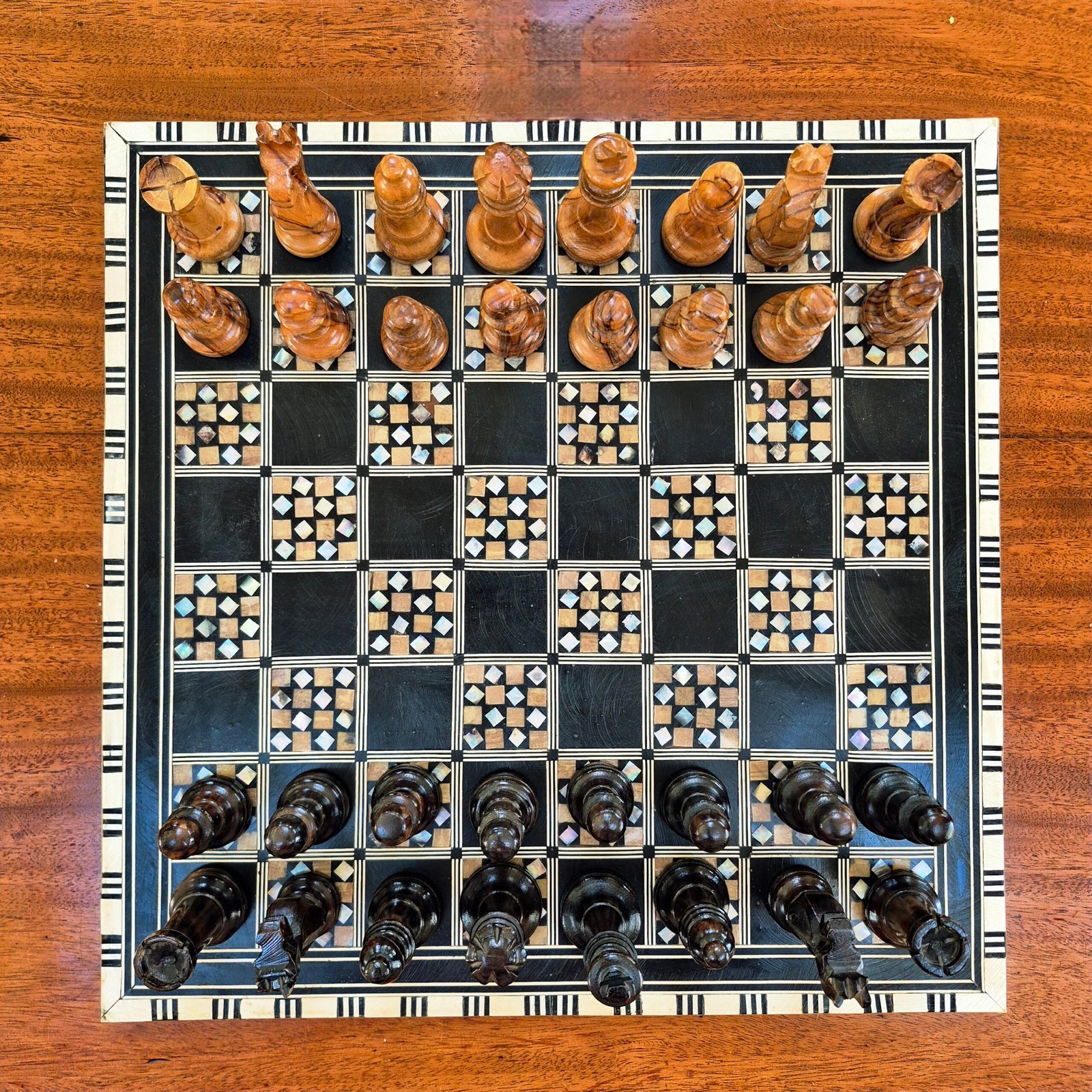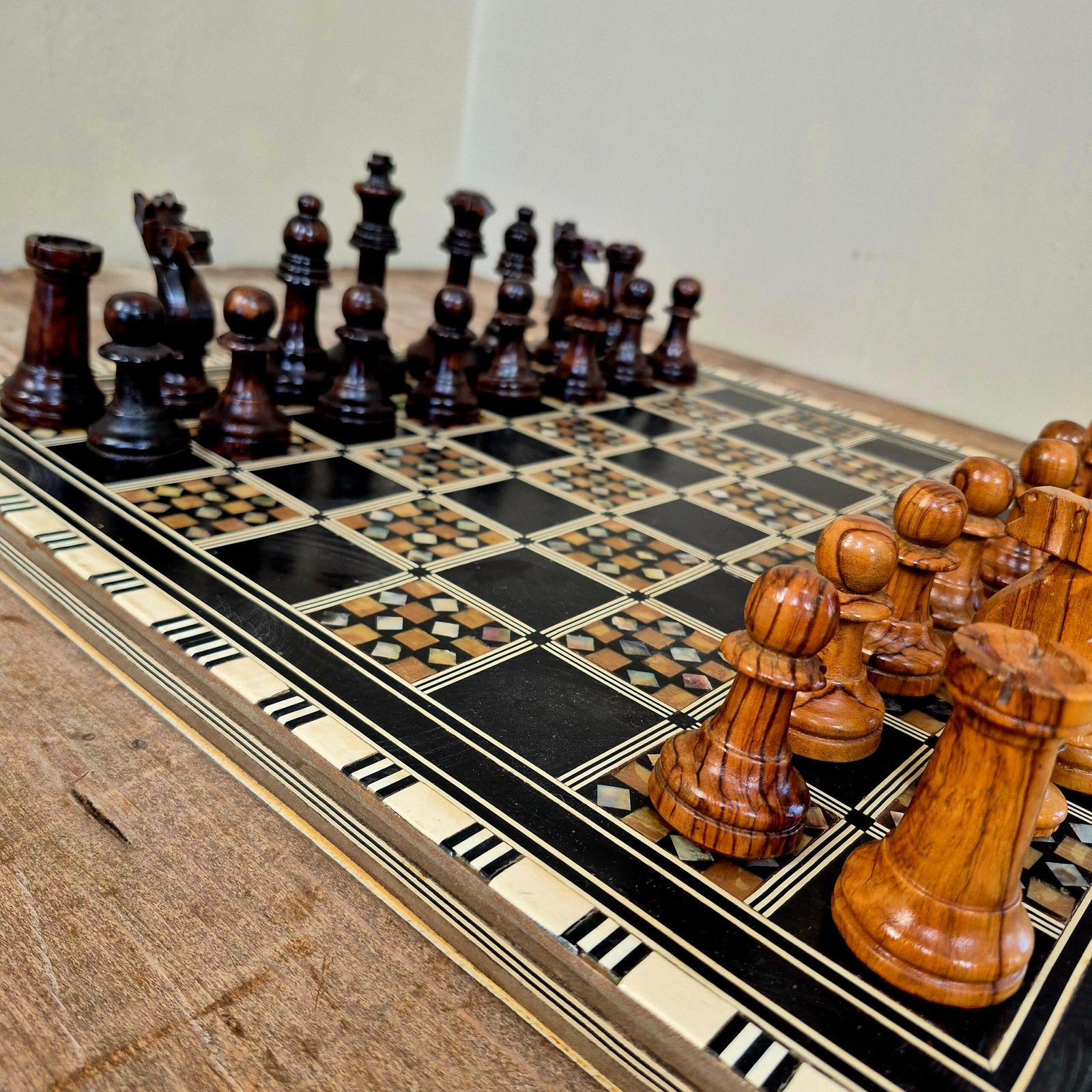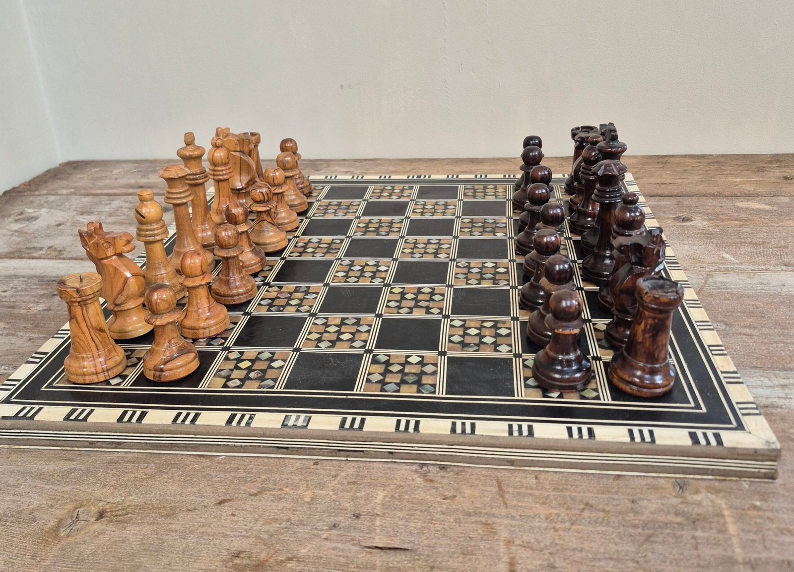 A decorative chess set featuring a Middle Eastern style wooden board with geometric mother of pearl inlay and a complete set of olive wood Staunton chess pieces by Ajedrez Escardibul.