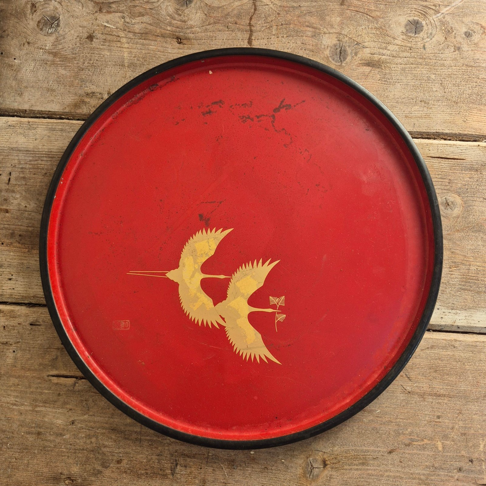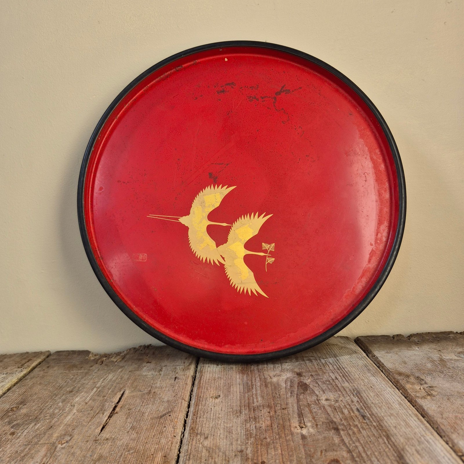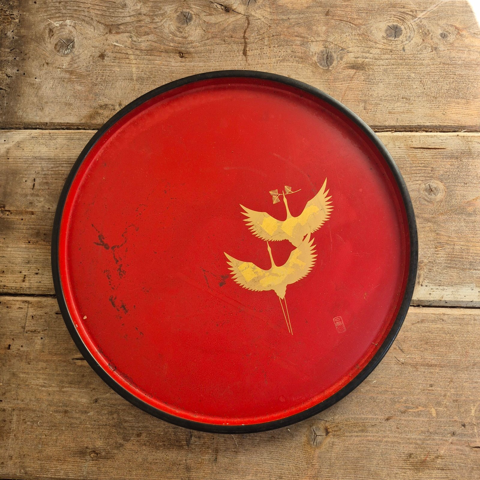 A striking red lacquer tray featuring a pair of golden cranes in flight. The bold colour and simple composition make this a really eye-catching decorative piece, with a nice balance between traditional motif and clean, modern styling.