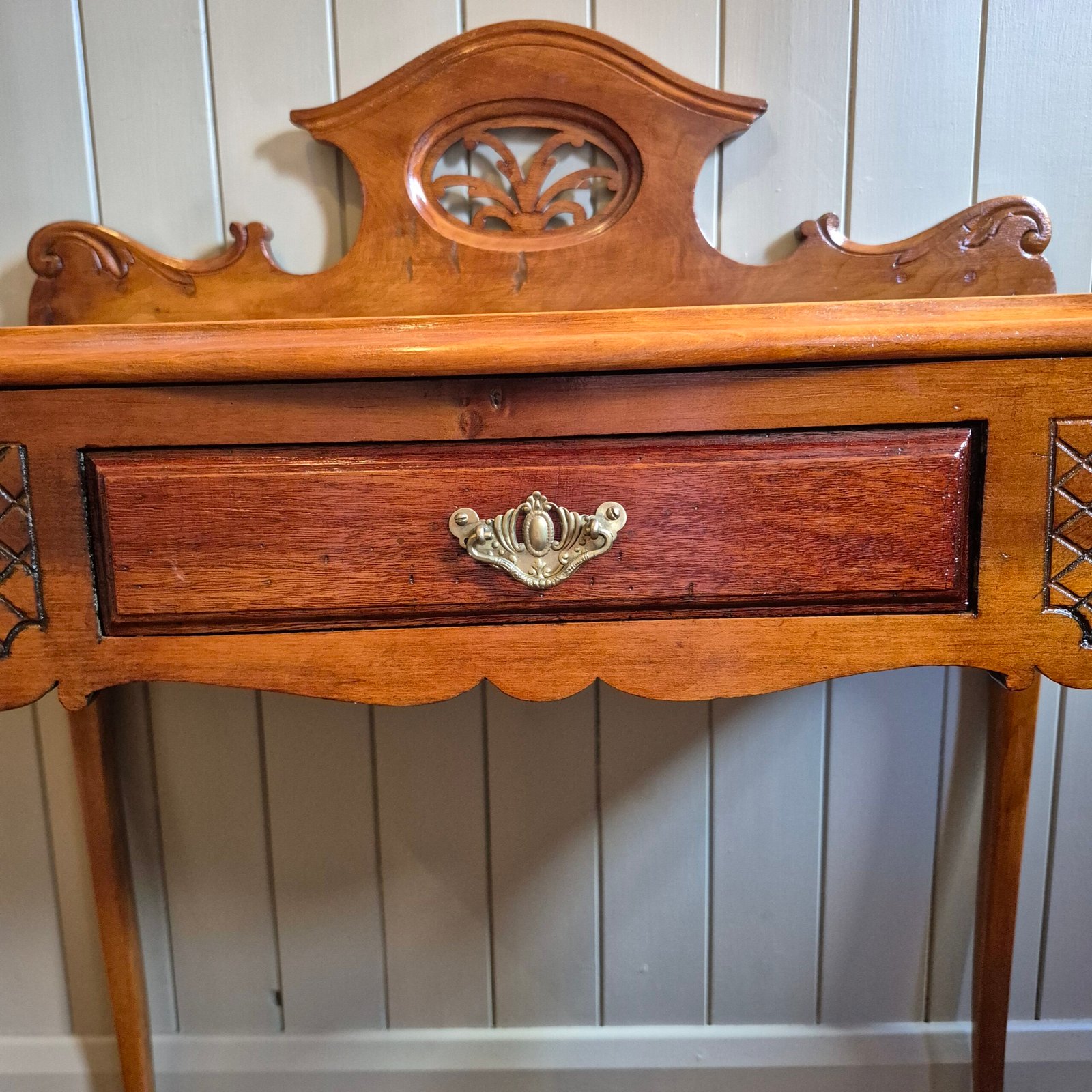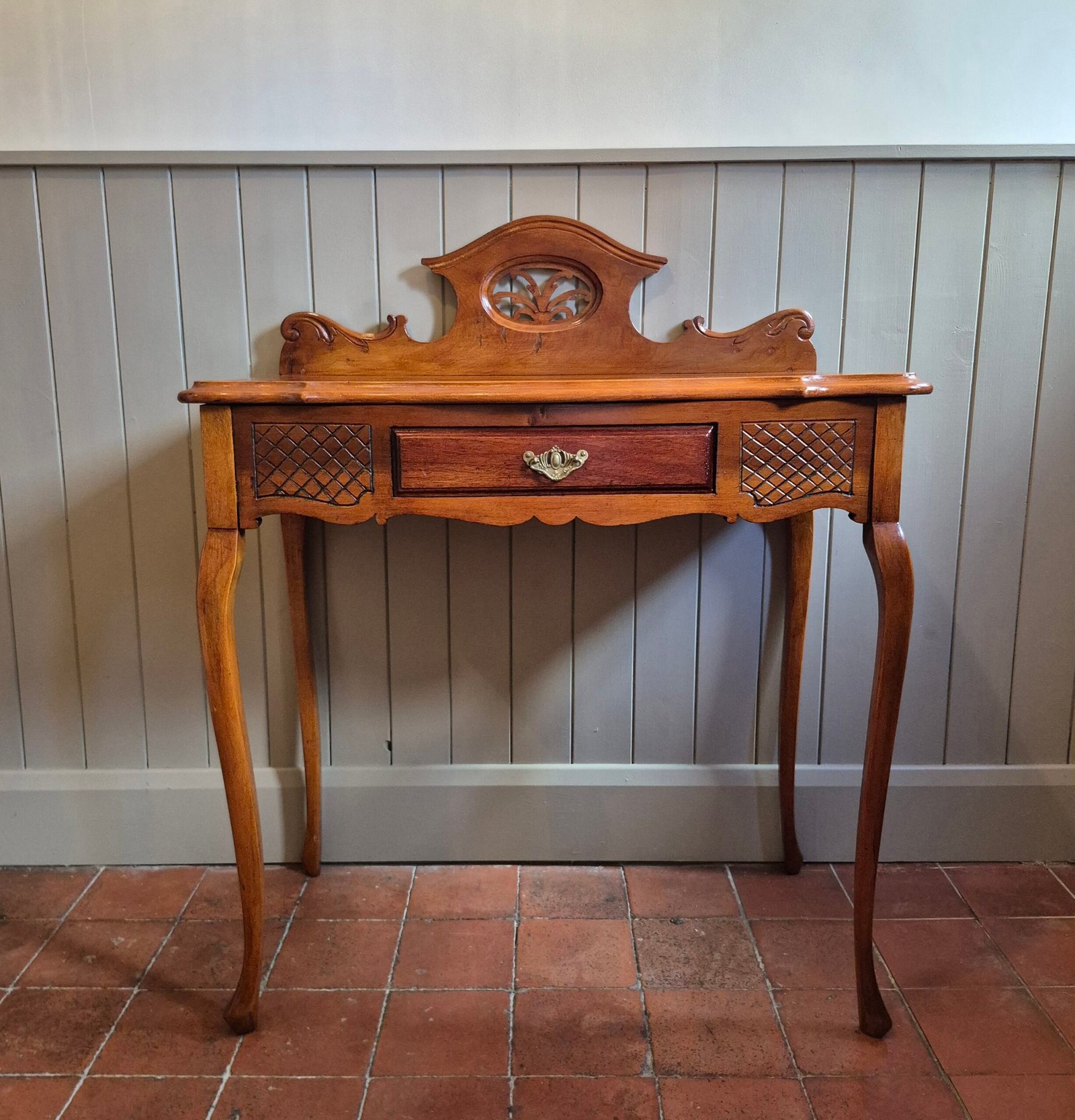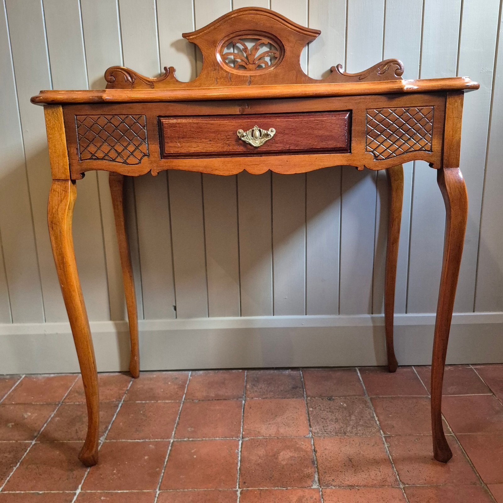 Its compact size makes it perfect as a dressing table, hallway statement piece, or petite writing desk. The warm wood tone and delicate detailing give it a timeless, classic feel that works effortlessly in both traditional and contemporary interiors.