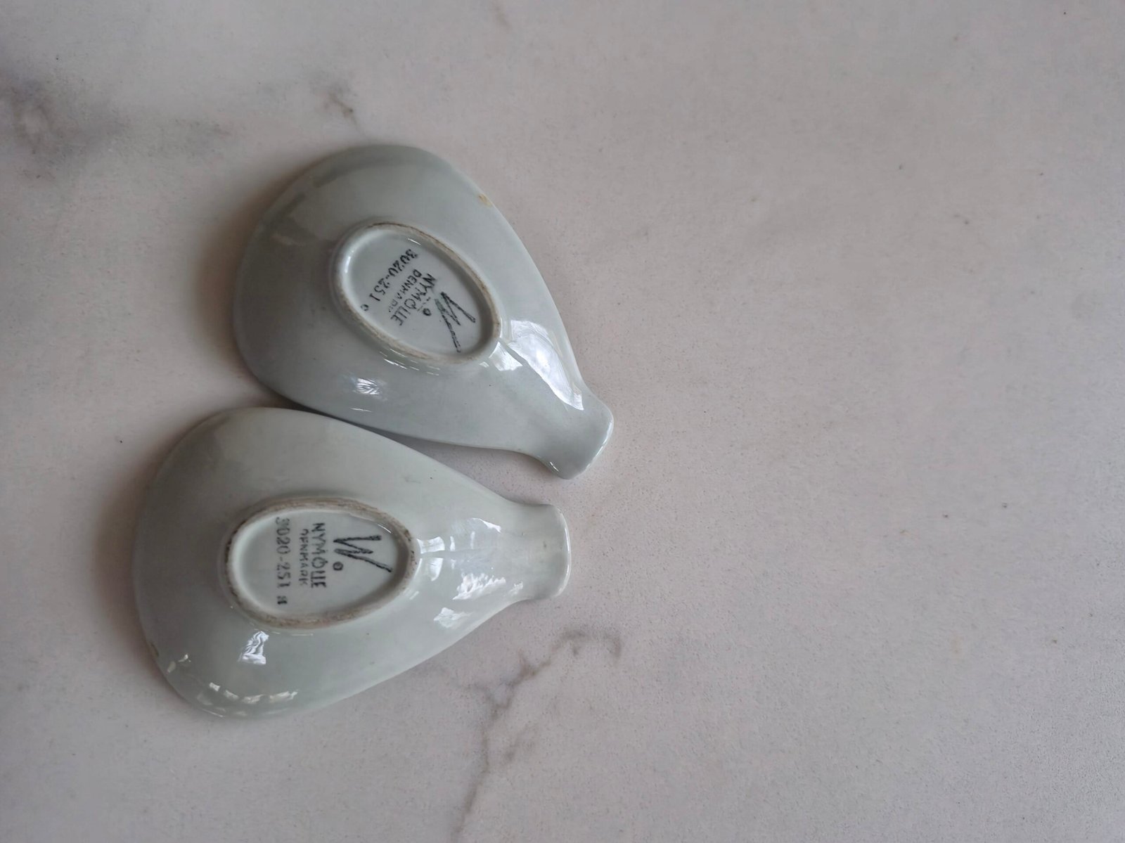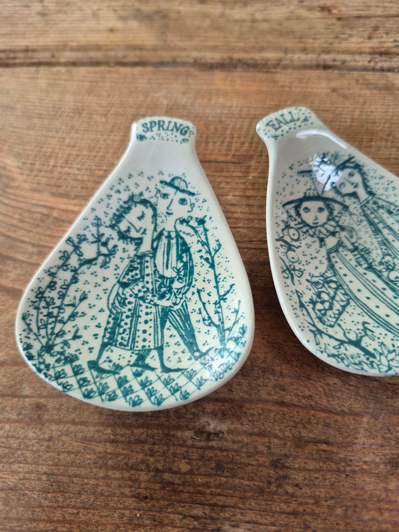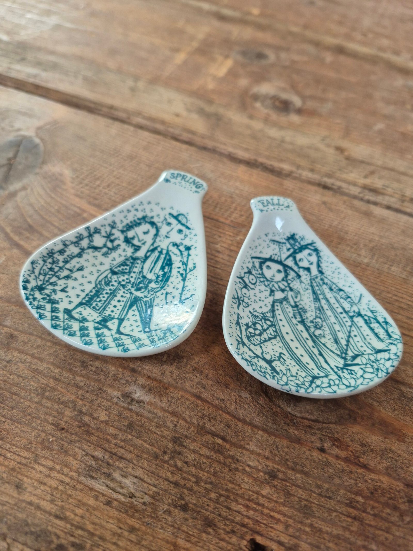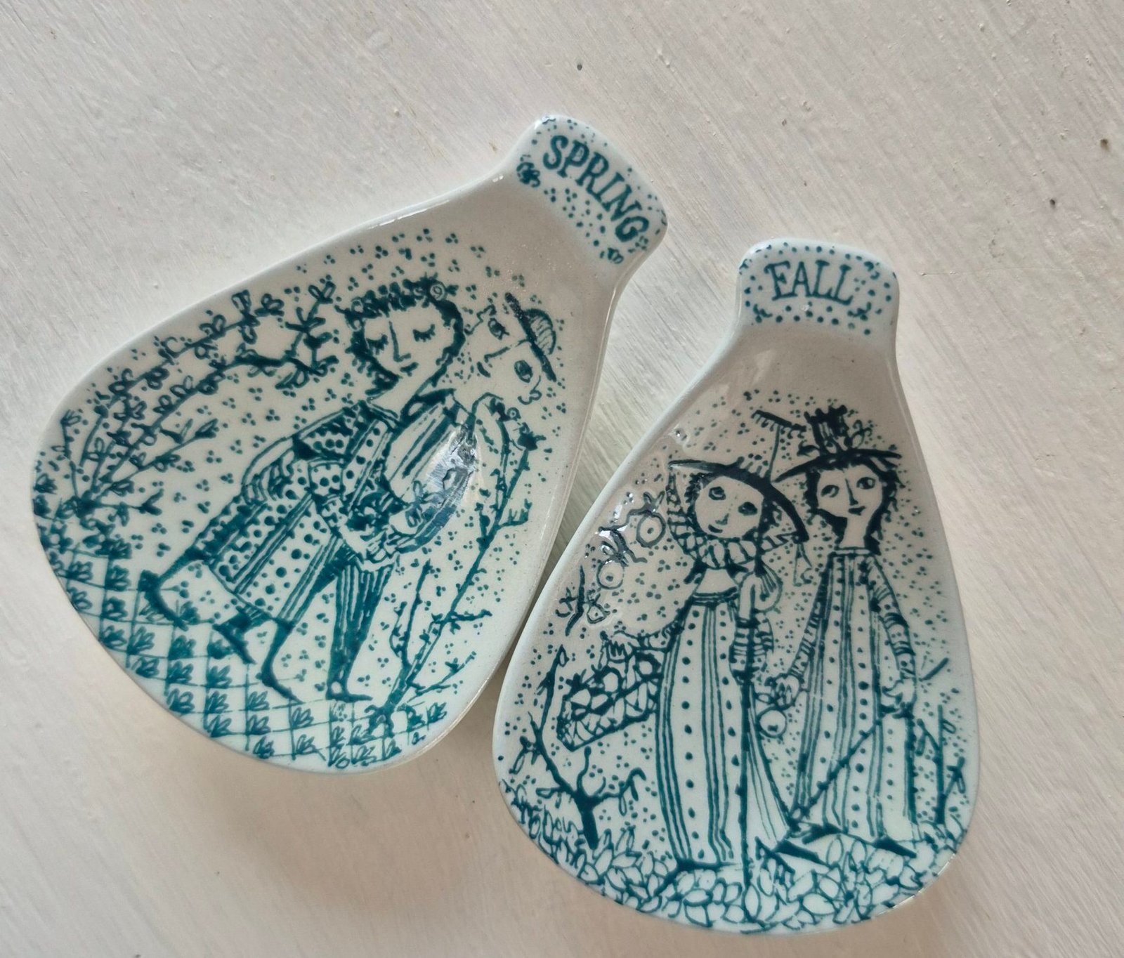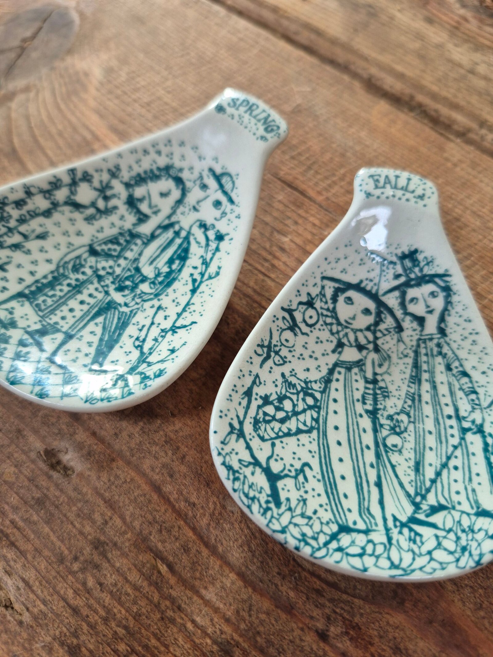 Charming mid century ceramic dishes illustrated by Bjorn Wiinblad. Each features one of his whimsical seasonal scenes in teal, with the classic Nymolle mark on the base. Ideal as small trinket or jewellery dishes and a lovely pair for collectors.