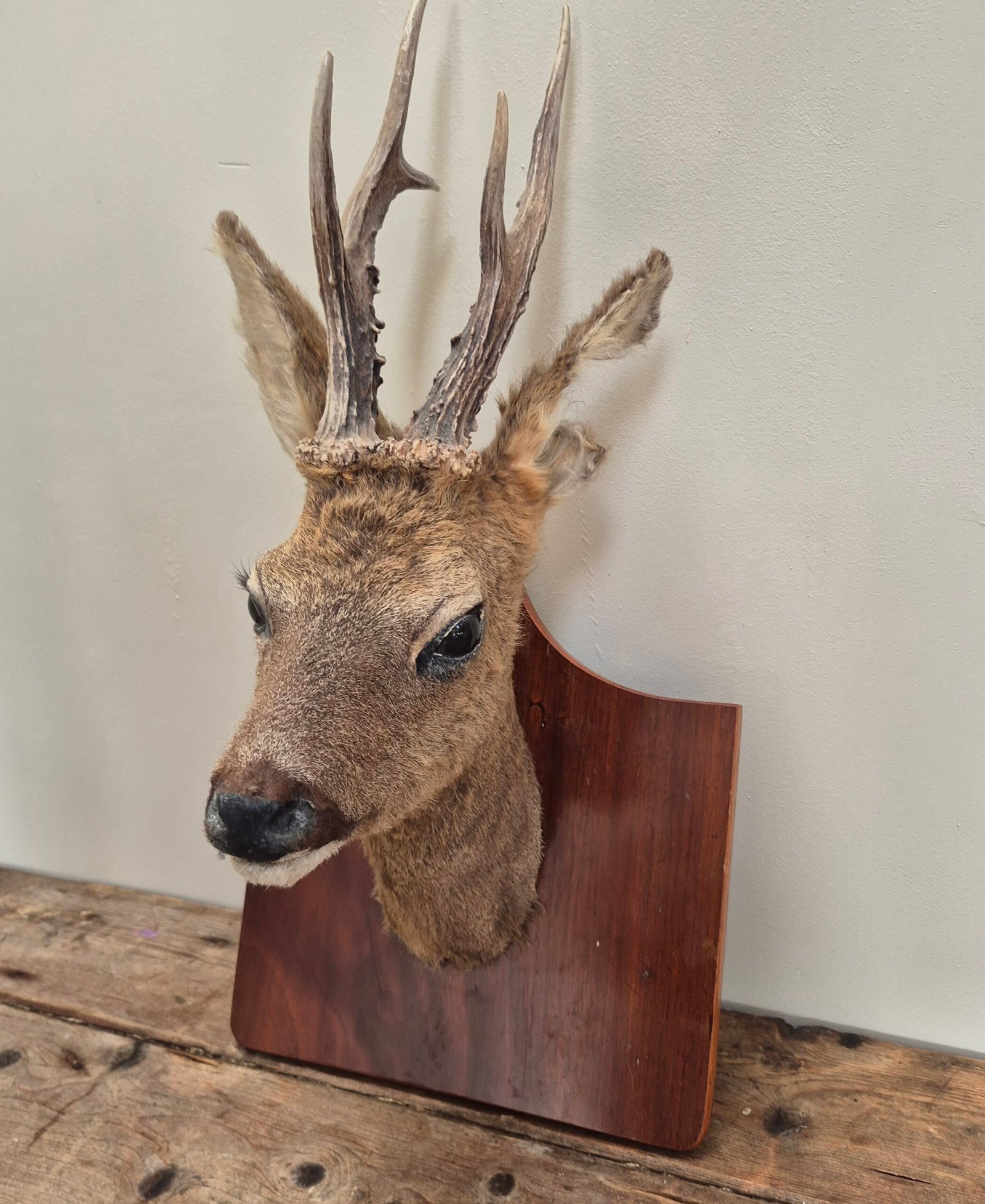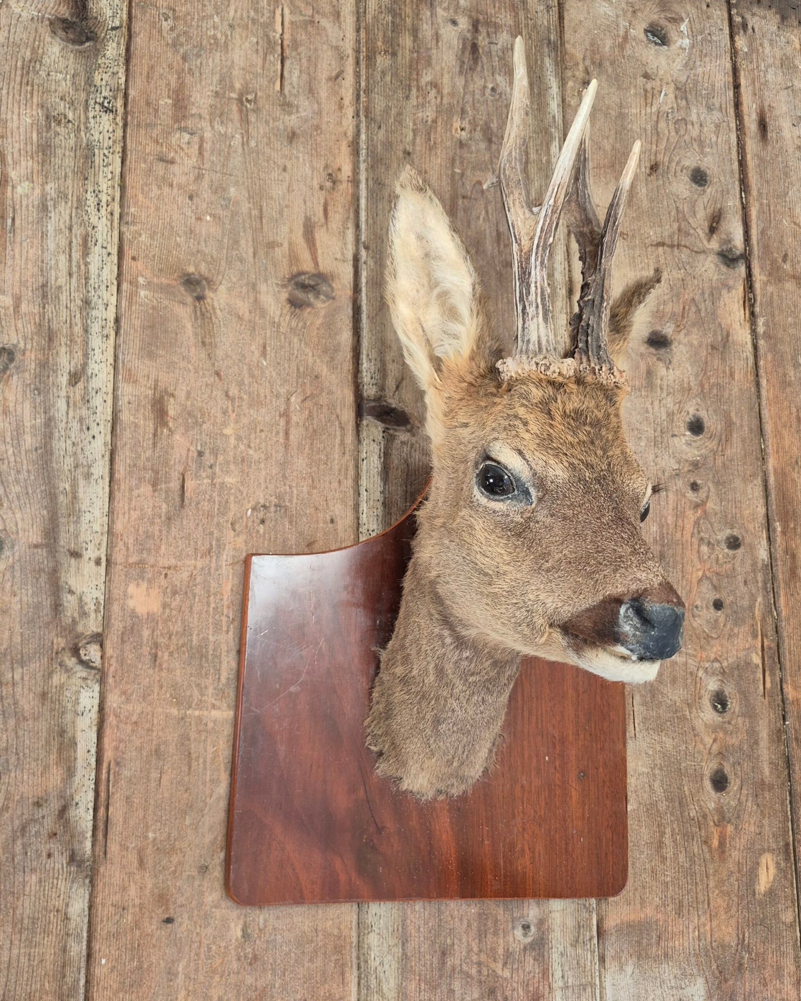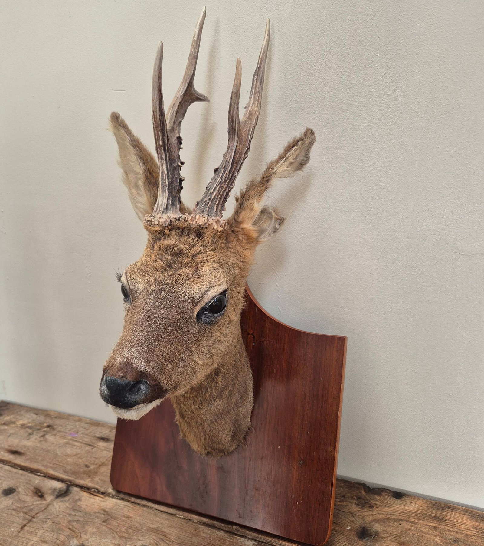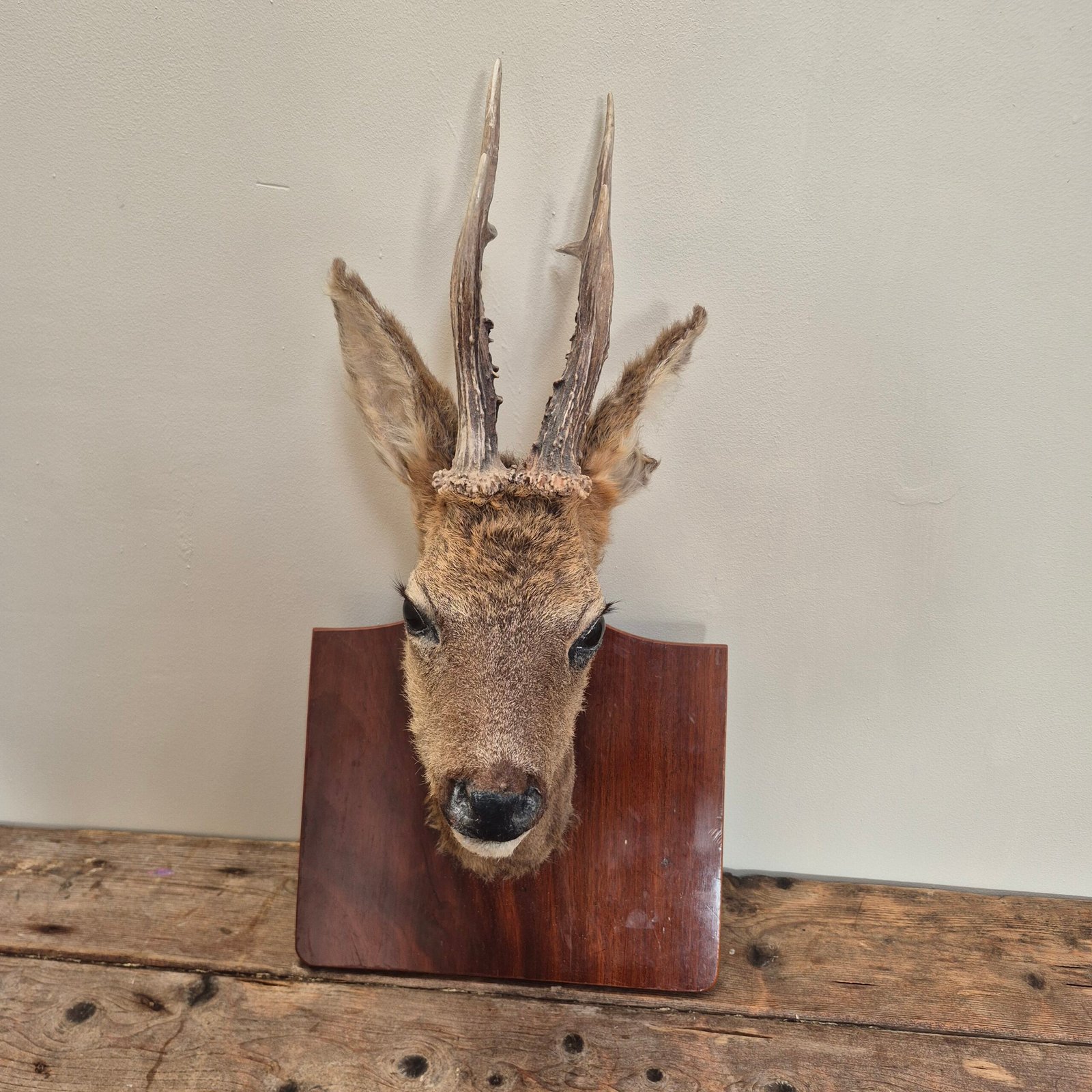 A taxidermy mount of a young buck with fine, slender antlers, presented on a polished mahogany shield back. Well-balanced proportions with a natural expression. Decorative without being oversized, making it suitable for smaller walls, galleries, or layered displays. Some age-related wear to the fur and mount, consistent with period.