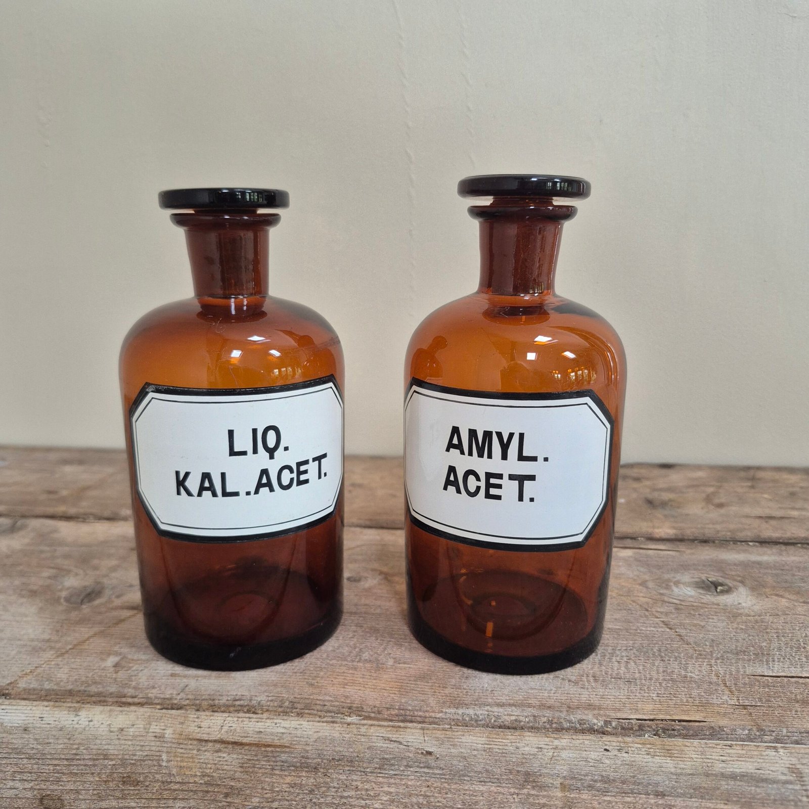 A pair of small amber glass apothecary bottles with classic stopper tops and crisp monochrome labels. These would have originally been used in a pharmacy or laboratory setting, giving them that authentic old-world feel.