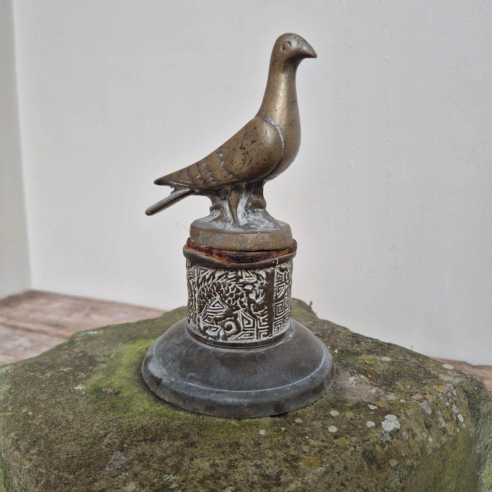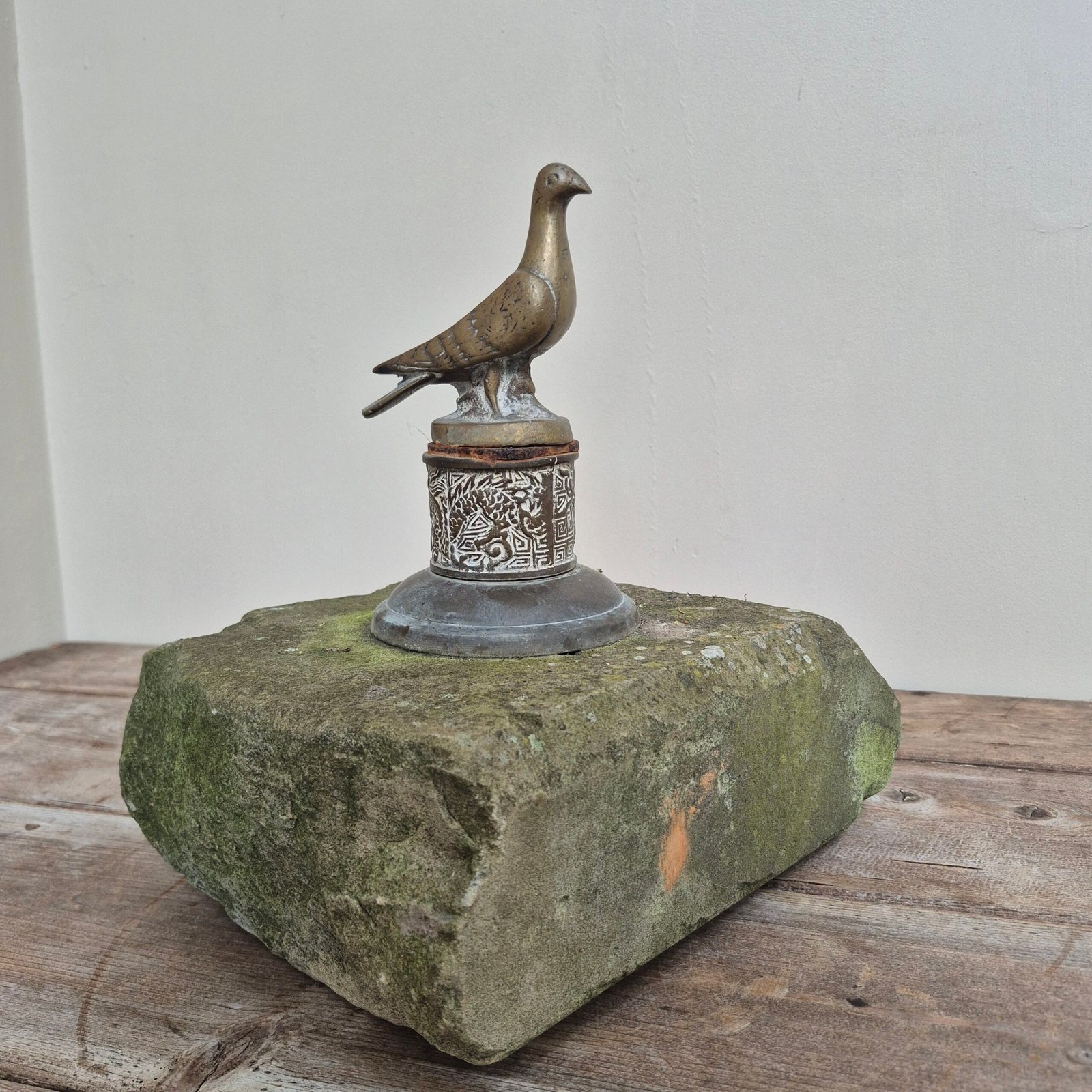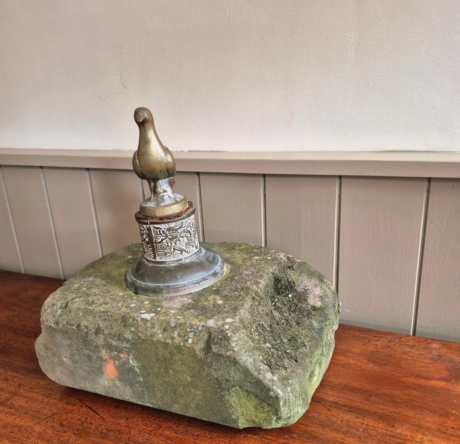 A characterful vintage brass bird sculpture, mounted onto a solid stone base.