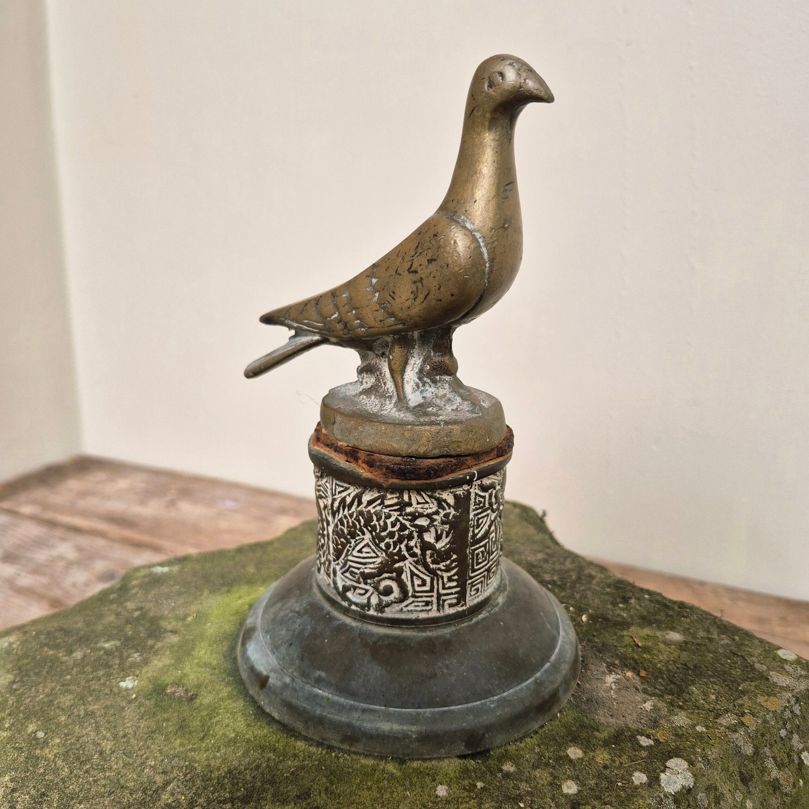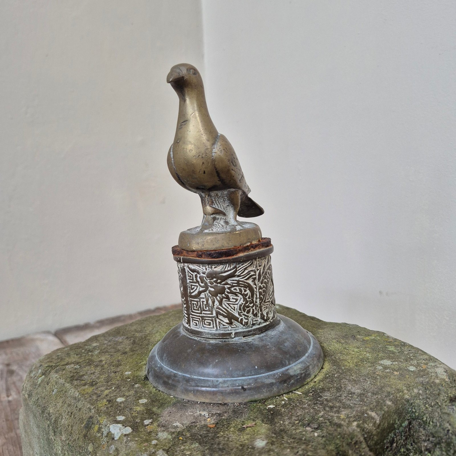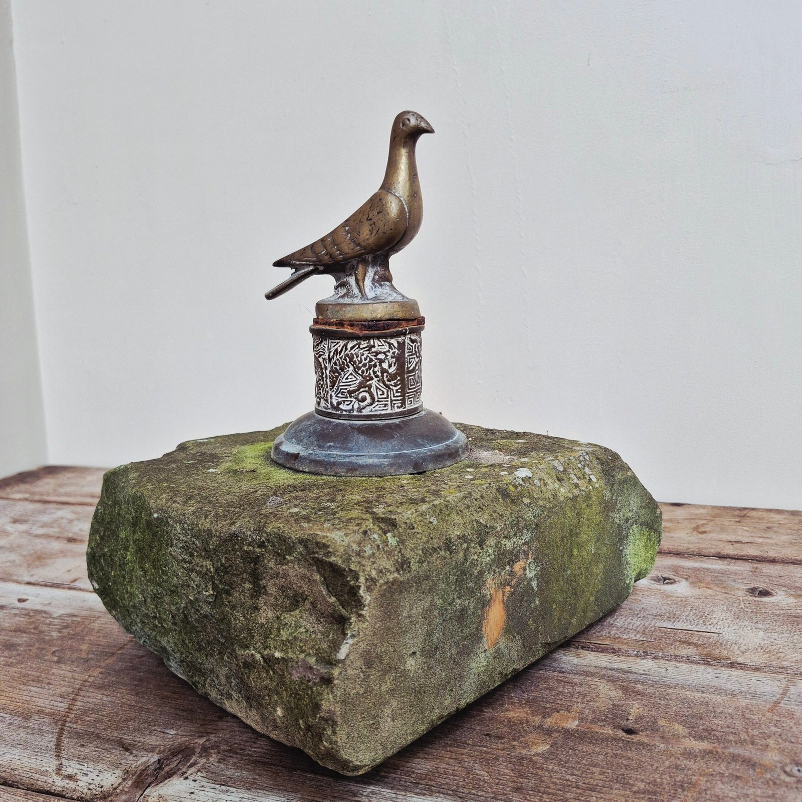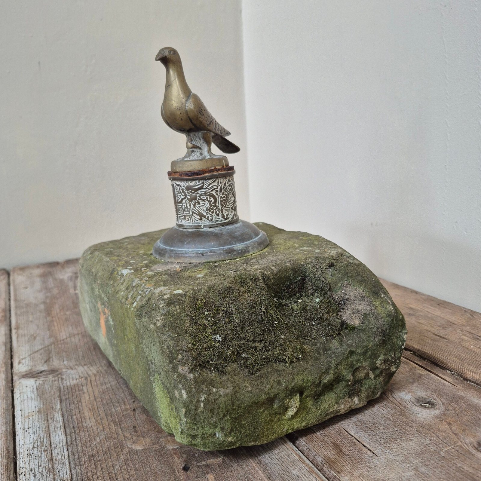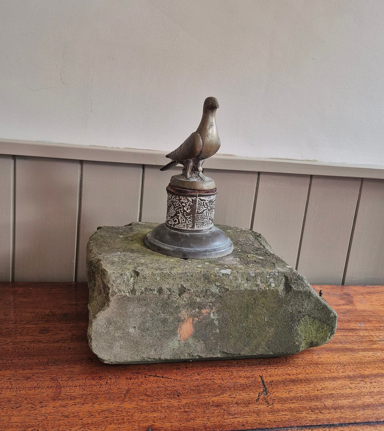 The bird itself is finely detailed with a naturally aged patina, while the raw stone adds contrast and weight, giving the piece a sculptural, almost architectural feel.