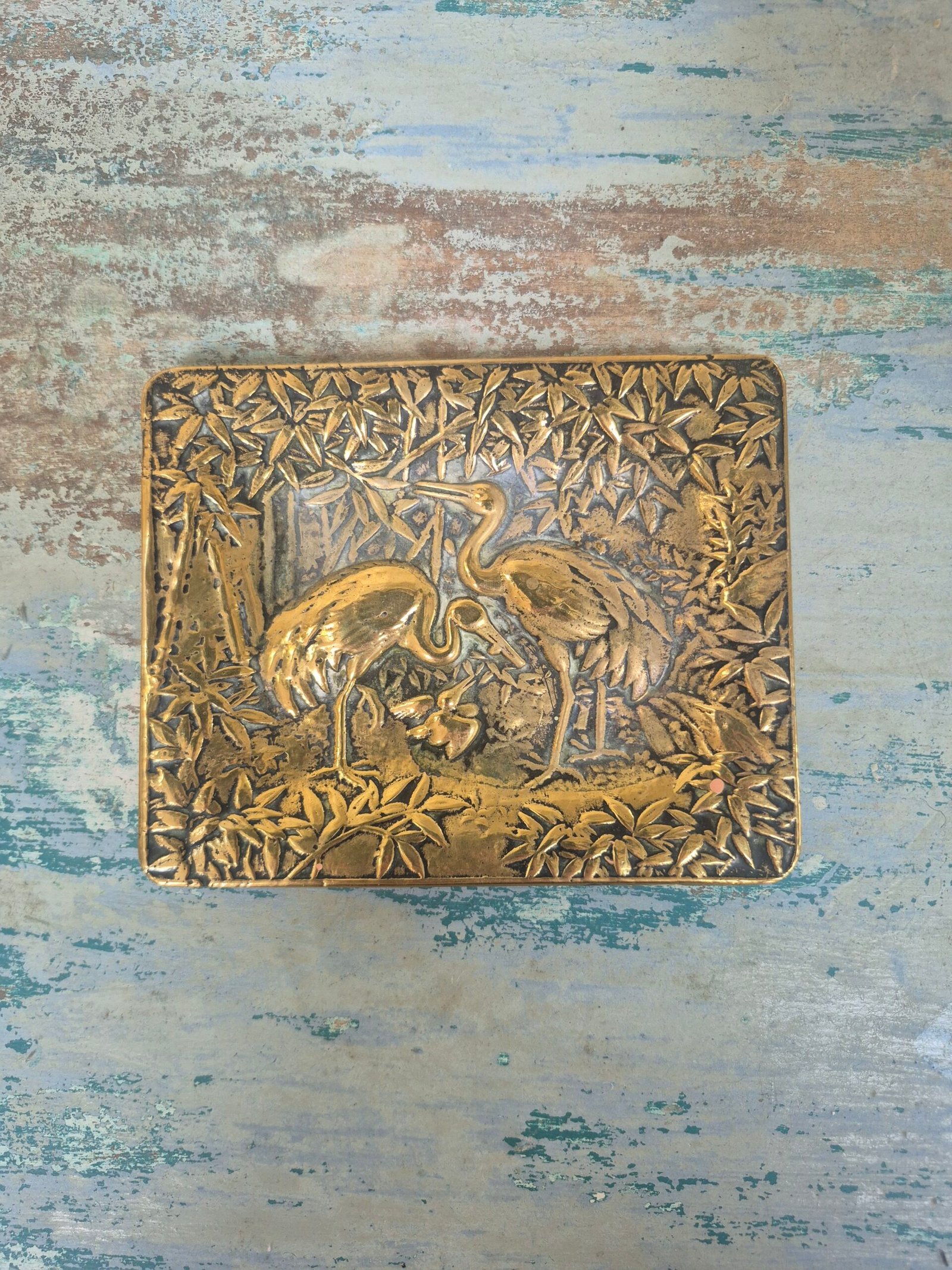 Vintage brass trinket dish with a raised crane and bamboo scene. The relief work is detailed and has a nice weight to it, with natural patina settling into the background and highlighting the birds and foliage. A lovely decorative dish for keys, jewellery or simply as a small accent piece.