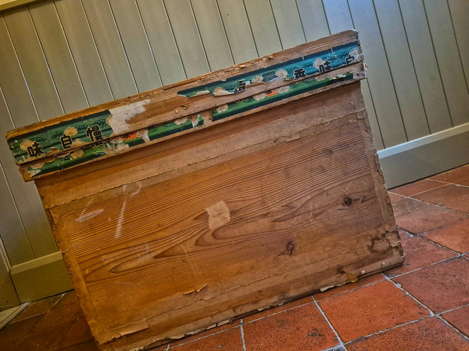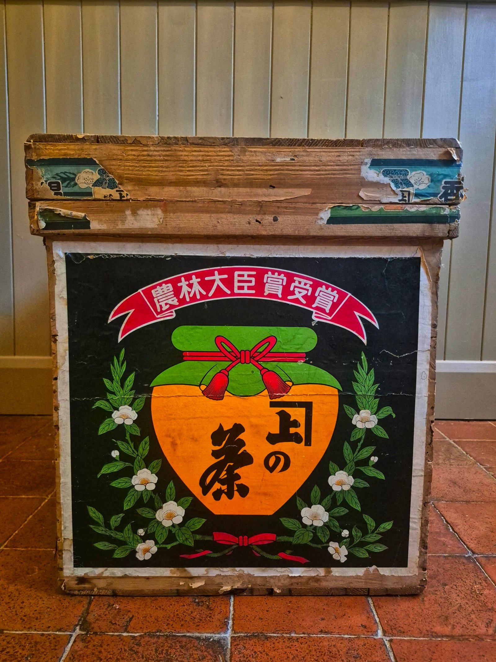 An early to mid 20th century Japanese tea crate originally used for transporting loose tea. Made from pine and lined with tin for preservation. It retains its original printed label with vibrant florals and traditional script. The wood shows age and wear from decades of use, giving it an honest, lived in surface that collectors love.