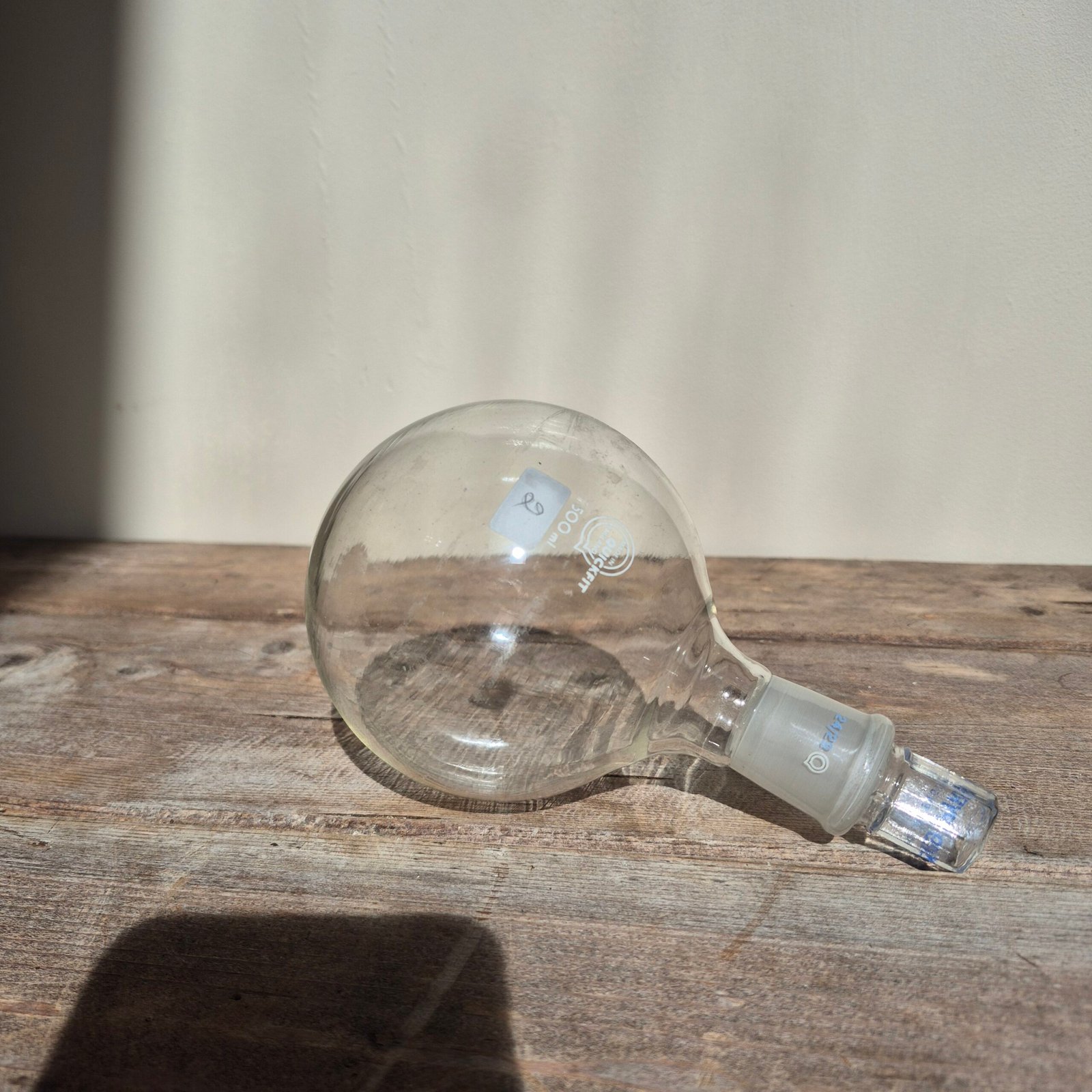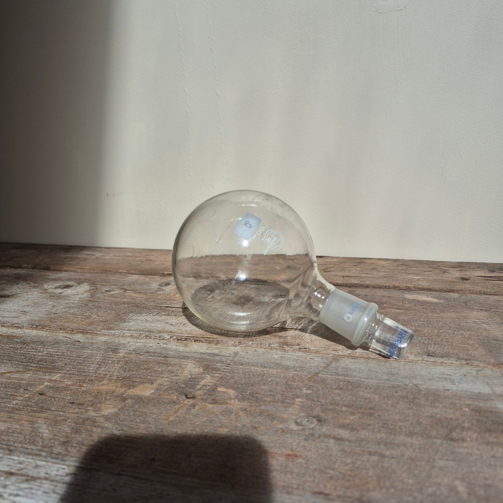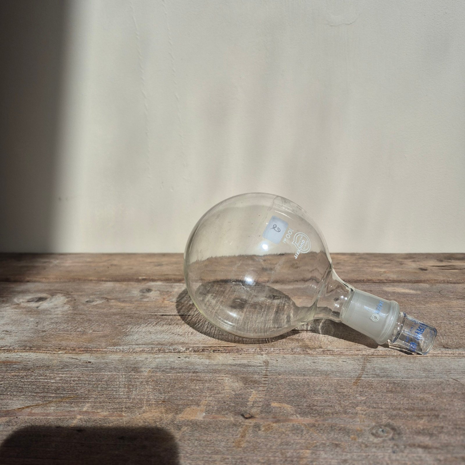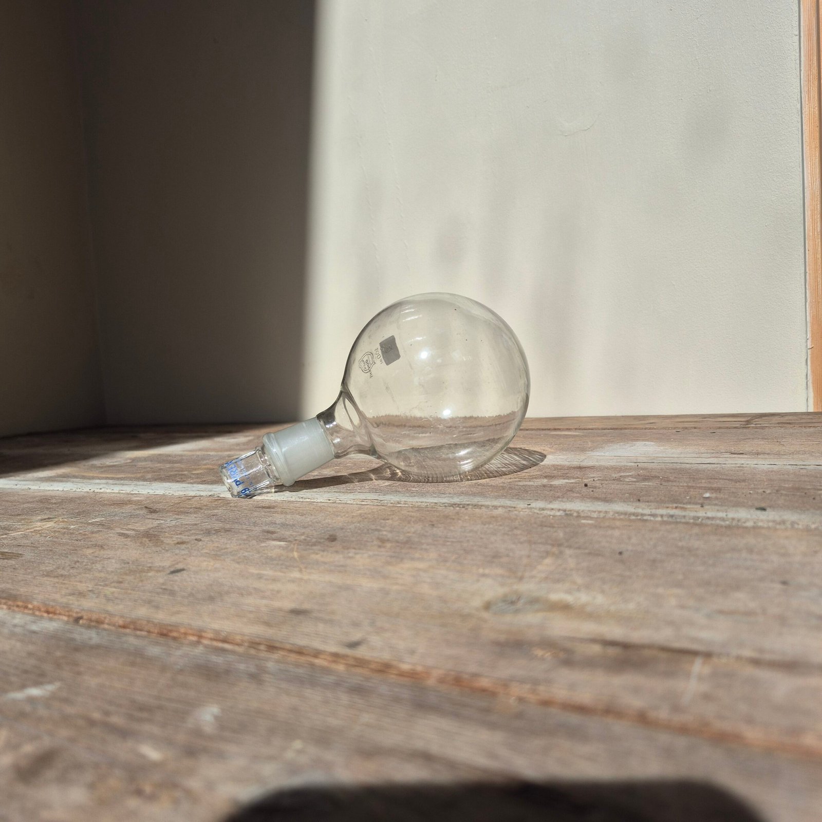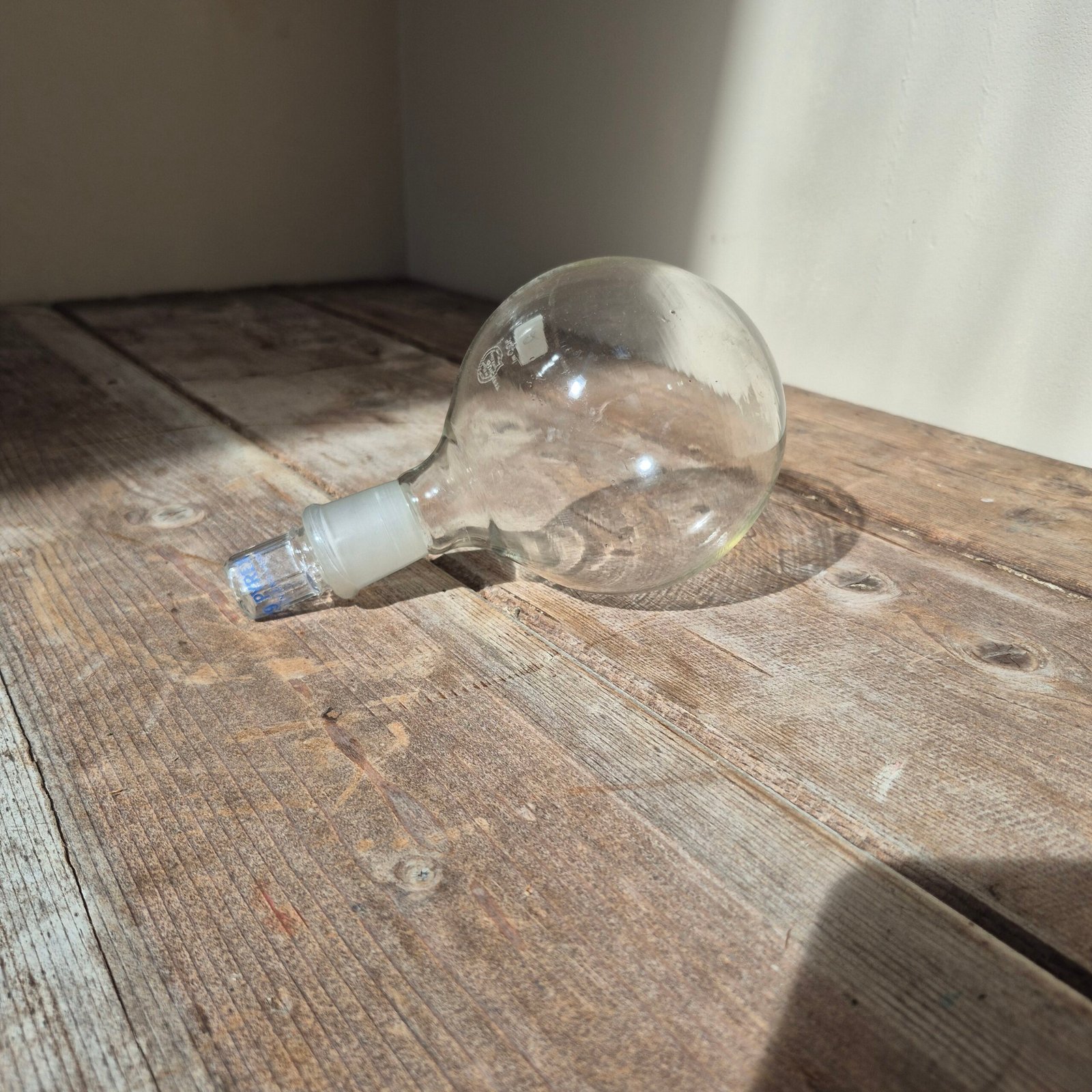 A vintage laboratory round bottom glass flask with ground glass stopper, originally used in scientific and chemical work. The soft, curved form and clear glass give it a sculptural quality that works beautifully beyond its original purpose.