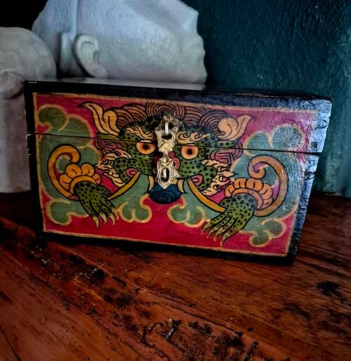 Vintage lacquer tray with a painted bird and foliage design on a deep black ground. The surface has age wear, edge losses and scuffs which sit well on a piece like this and give it that lived, honest character. The painting still reads clearly and the tray has a lovely flat profile that works both as a serving piece and as a decorative layer on a table or shelf.
